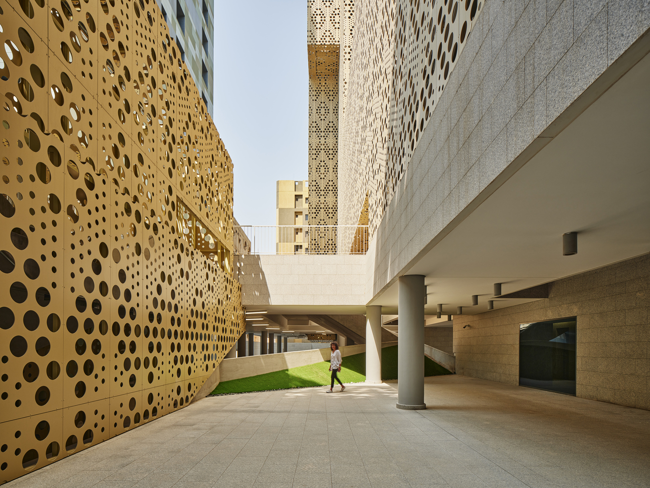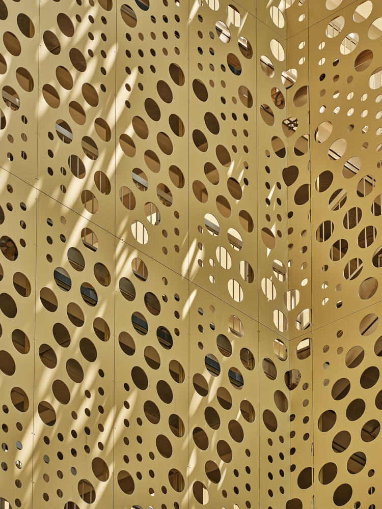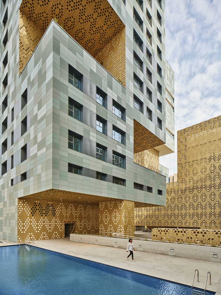 The building envelope provides a safe environment for the inhabitants, protecting them from the hustle and bustle of the street. From this level, one can see an aluminum mesh: a double skin that climbs the internal facade containing the emergency routes, and conceals the various service spaces that do not relate to the public. Behind the lattice are the five cores, which connect the residential floors.