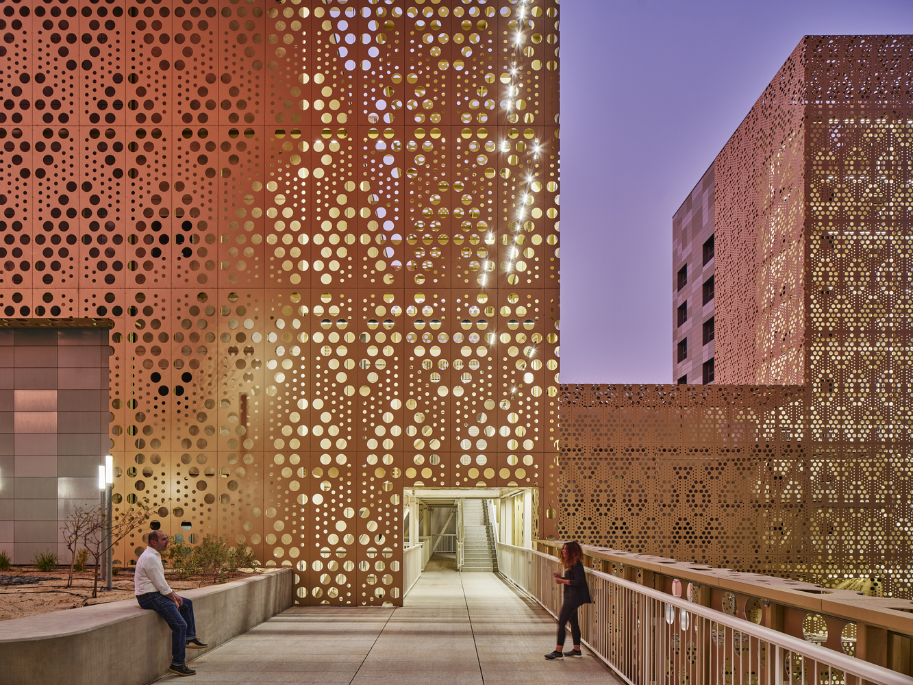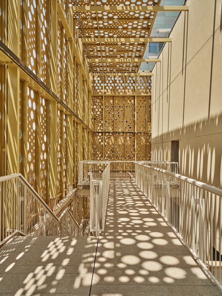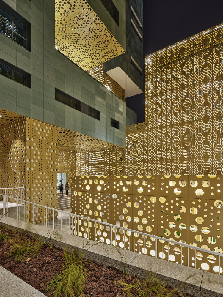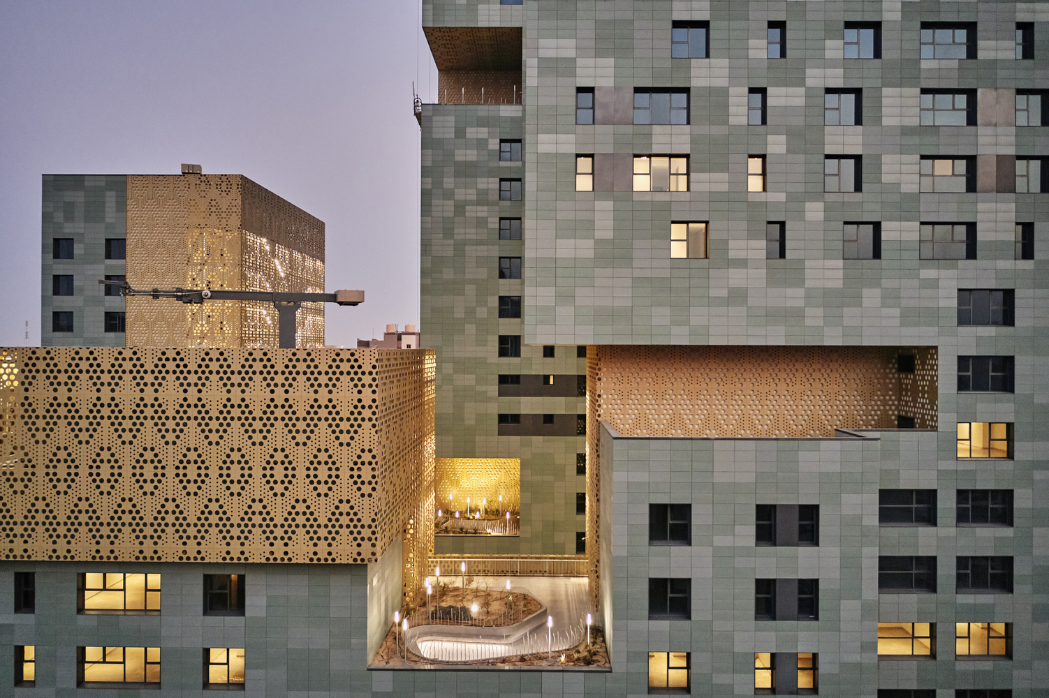 The building envelope provides a safe environment for the inhabitants, protecting them from the hustle and bustle of the street. From this level, one can see an aluminum mesh: a double skin that climbs the internal facade containing the emergency routes, and conceals the various service spaces that do not relate to the public. Behind the lattice are the five cores, which connect the residential floors.