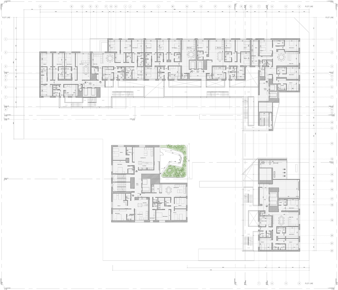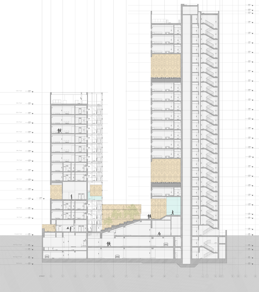 The complex combines at different levels domestic and collective scales that are both private and public. The architecture defines the edge of the block and creates a series of open spaces within the plot for the community, with various uses. The building cantilevers off the ground to draw street life into the building. The ground floor level opens up to the neighborhood with accessible retail facilities on the street level, integrating into the urban fabric, and links up to a high square through an inclined, stepped garden. The project is composed of 16 types of living typologies -ranging from two bedroom to four bedroom duplex- distributed across five cores to cater to a variety of tenants.