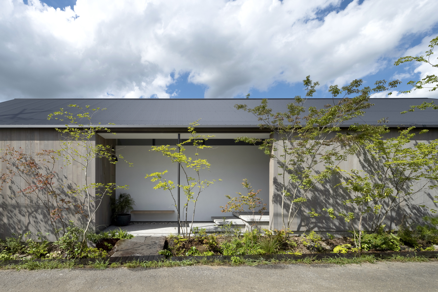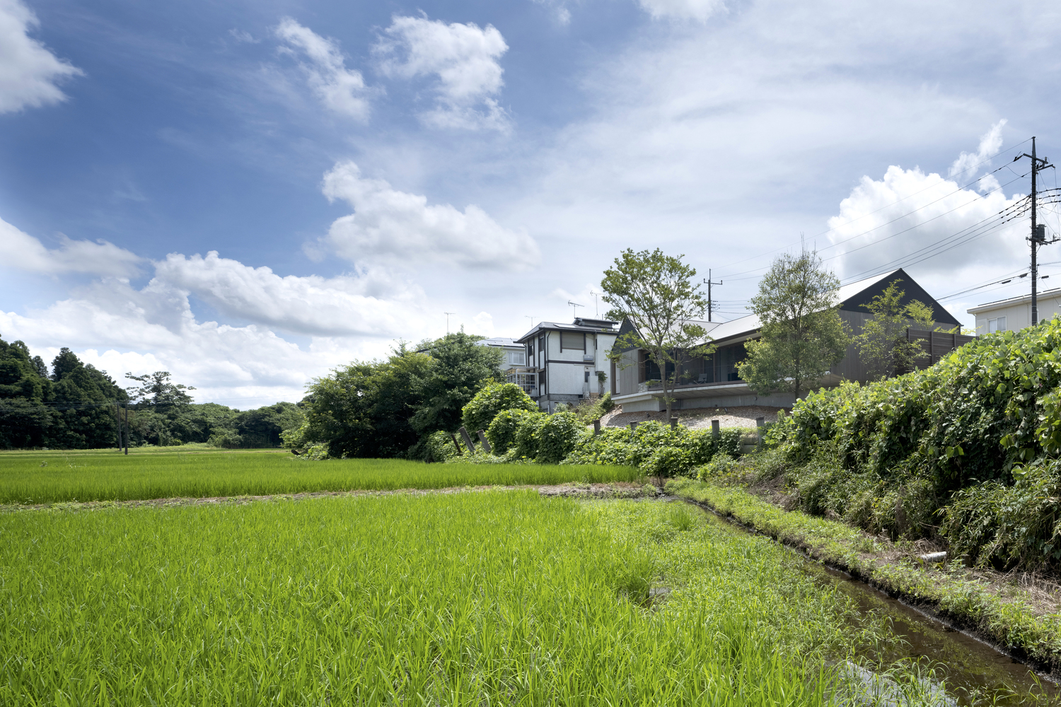 The exterior has a simple beauty that blends seamlessly into its natural surroundings. At the same time, its strength sets off the secondary nature (gardens) created by the resident, a landscape designer. The man-made stream running through the front garden plays an important role in linking the residential neighborhood with the surrounding natural environment of Tsukuba. Mt. Tsukuba towers beyond broad plains in this rice-growing region of Ibaraki Prefecture. The shape of the property dictated a simple floor plan with rooms arranged in a line parallel to the street, offering views of the landscape from anywhere in the house.