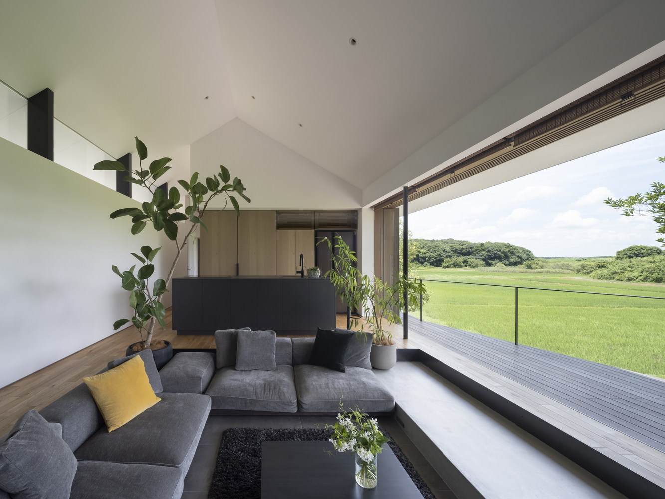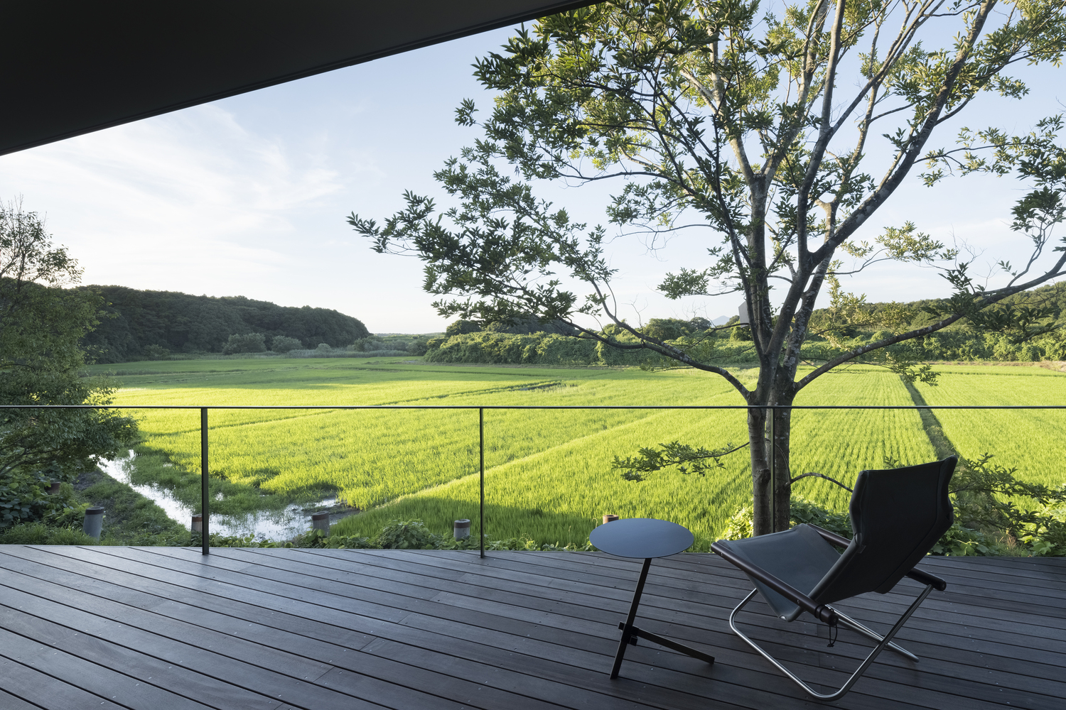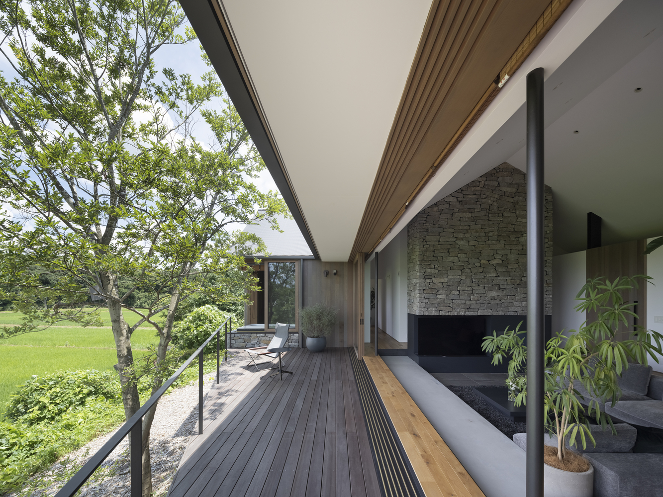 Because part of the site was sloped, it would normally have been necessary to build a retaining wall to prepare the site for building. We took advantage of the situation by instead creating a floor that juts out from the foundation to “float” in midair. The elevated, open living space and balcony naturally draw the eye to the rice fields and forest visible in the distance, encouraging awareness of the changing natural world, connection to the broader universe, and one’s place as part of nature.