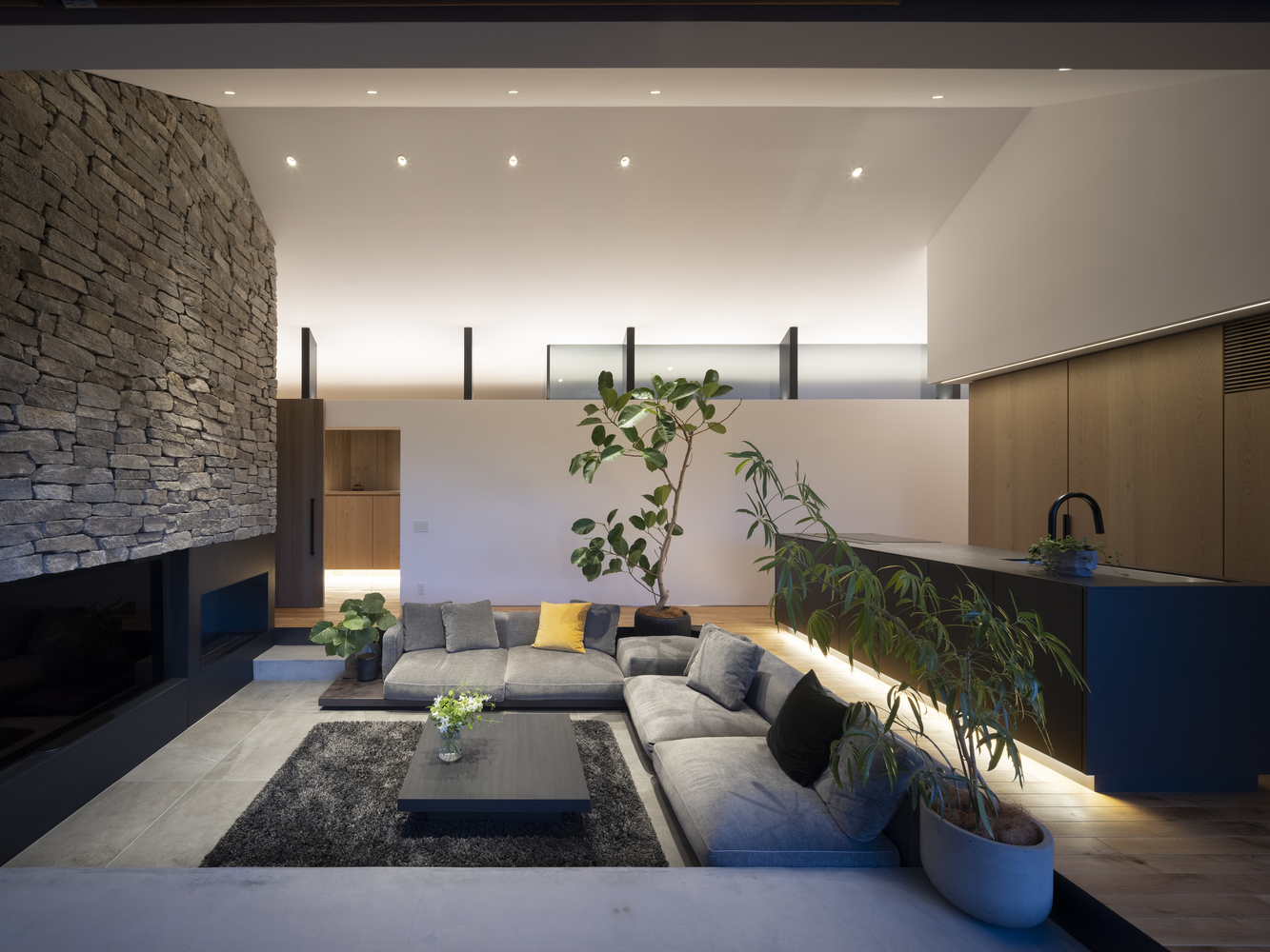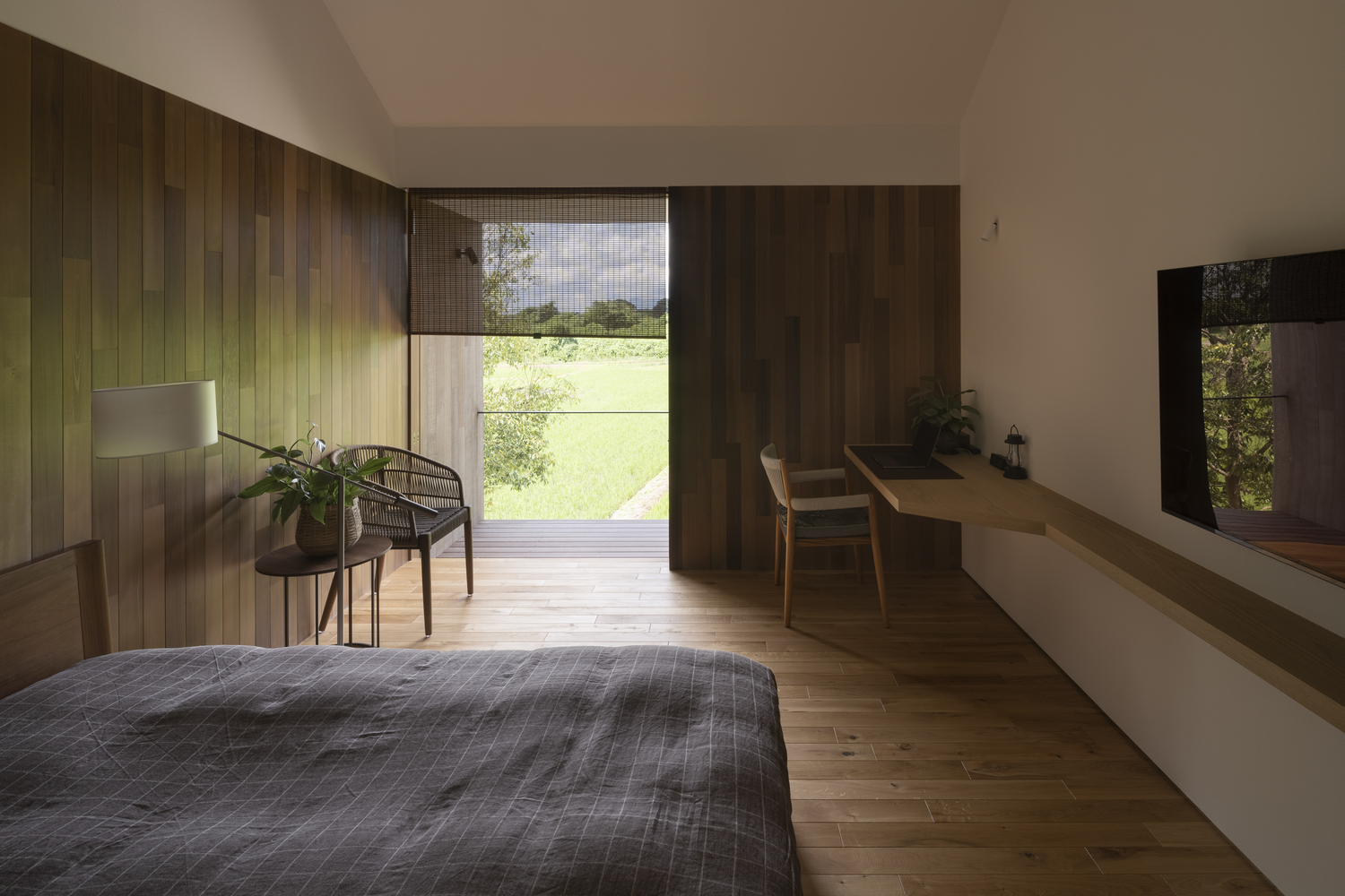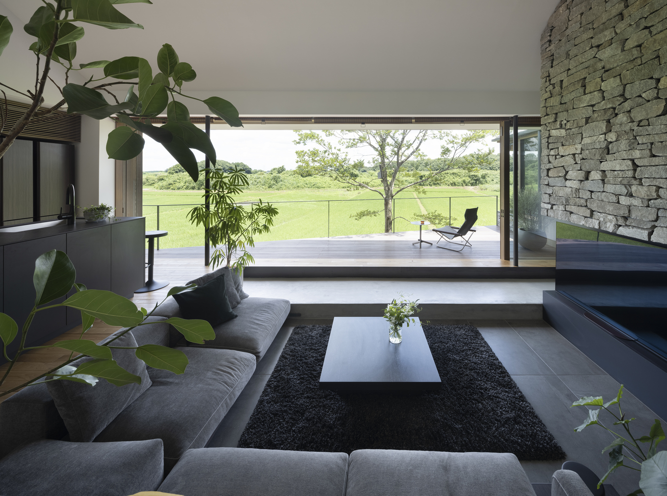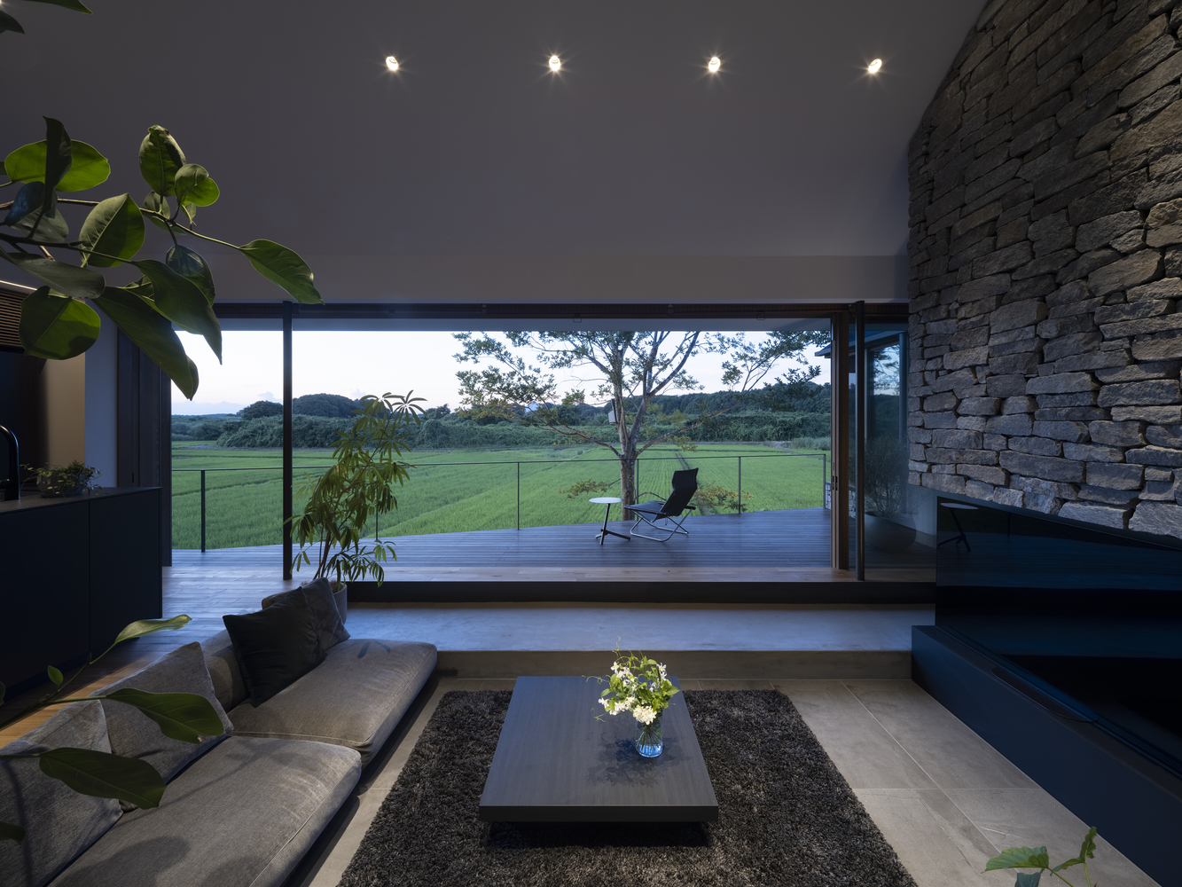 Because part of the site was sloped, it would normally have been necessary to build a retaining wall to prepare the site for building. We took advantage of the situation by instead creating a floor that juts out from the foundation to “float” in midair. The elevated, open living space and balcony naturally draw the eye to the rice fields and forest visible in the distance, encouraging awareness of the changing natural world, connection to the broader universe, and one’s place as part of nature.