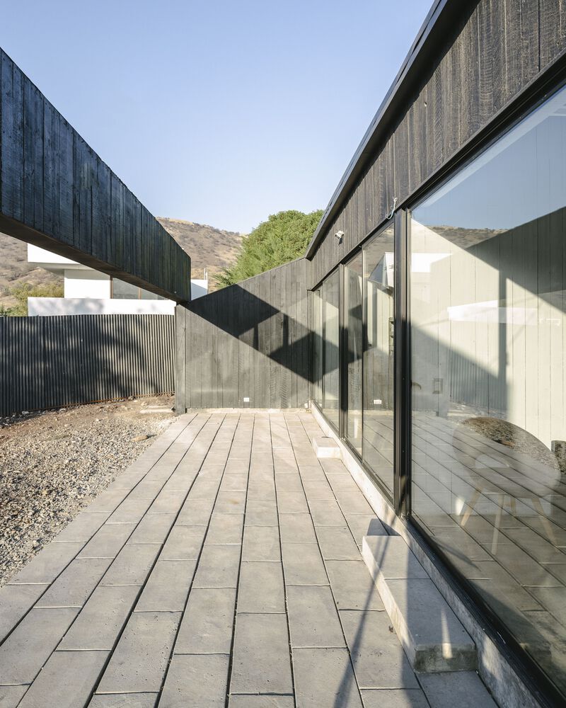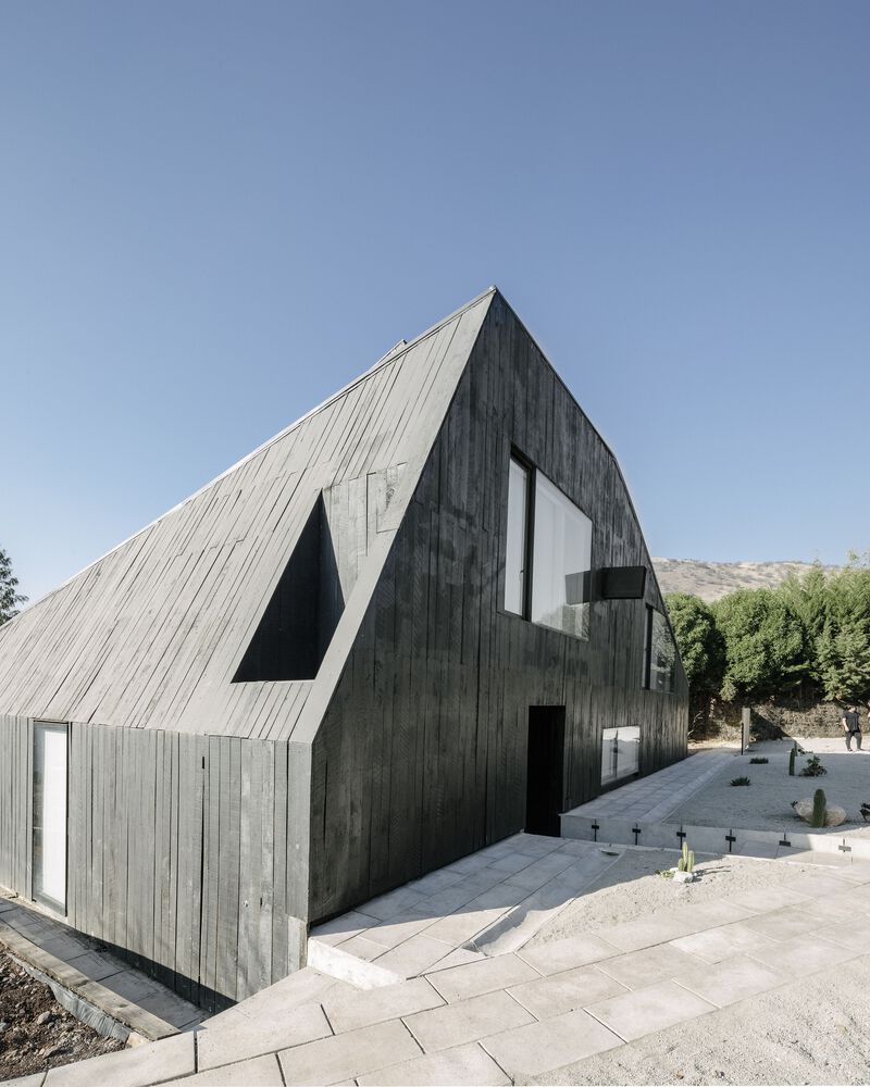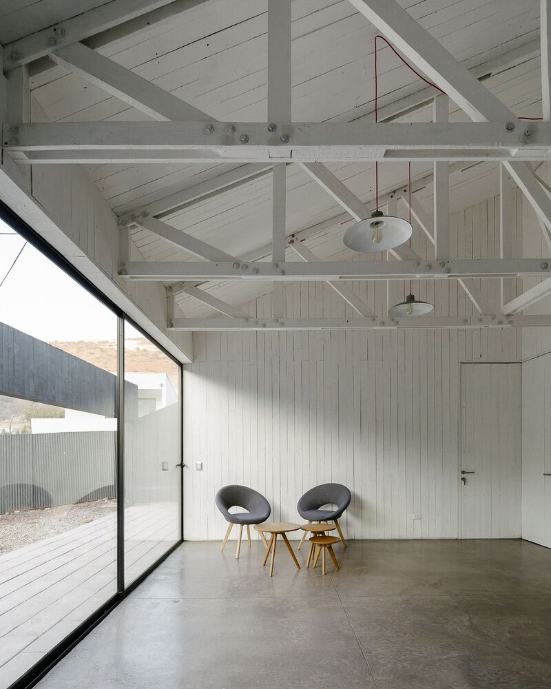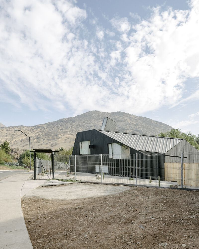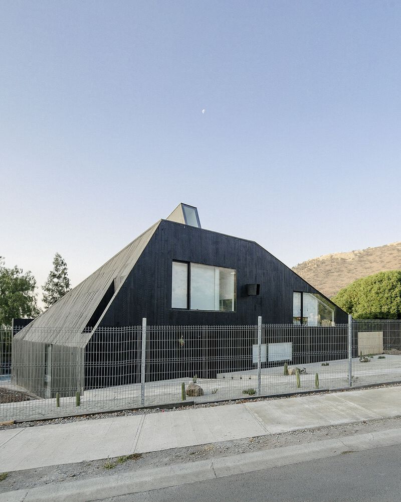 산티아고 북부에 위치한 주택의 디자인 특징은 로컬건축의 전통양식을 재해석한 미니멀 양식입니다. 전통적인 지붕형식을 독특한 형태로 추상화한 작업은 지붕과 벽의 경계를 허물며, 연속된 공간을 확보합니다. 외부(거리)로 부터 이격되기 위한 경사면(지붕) 덕분에 북쪽으로 오픈공간 확보하여 내부 공용공간과 테라스가 함께 호흡하도록 설계합니다.