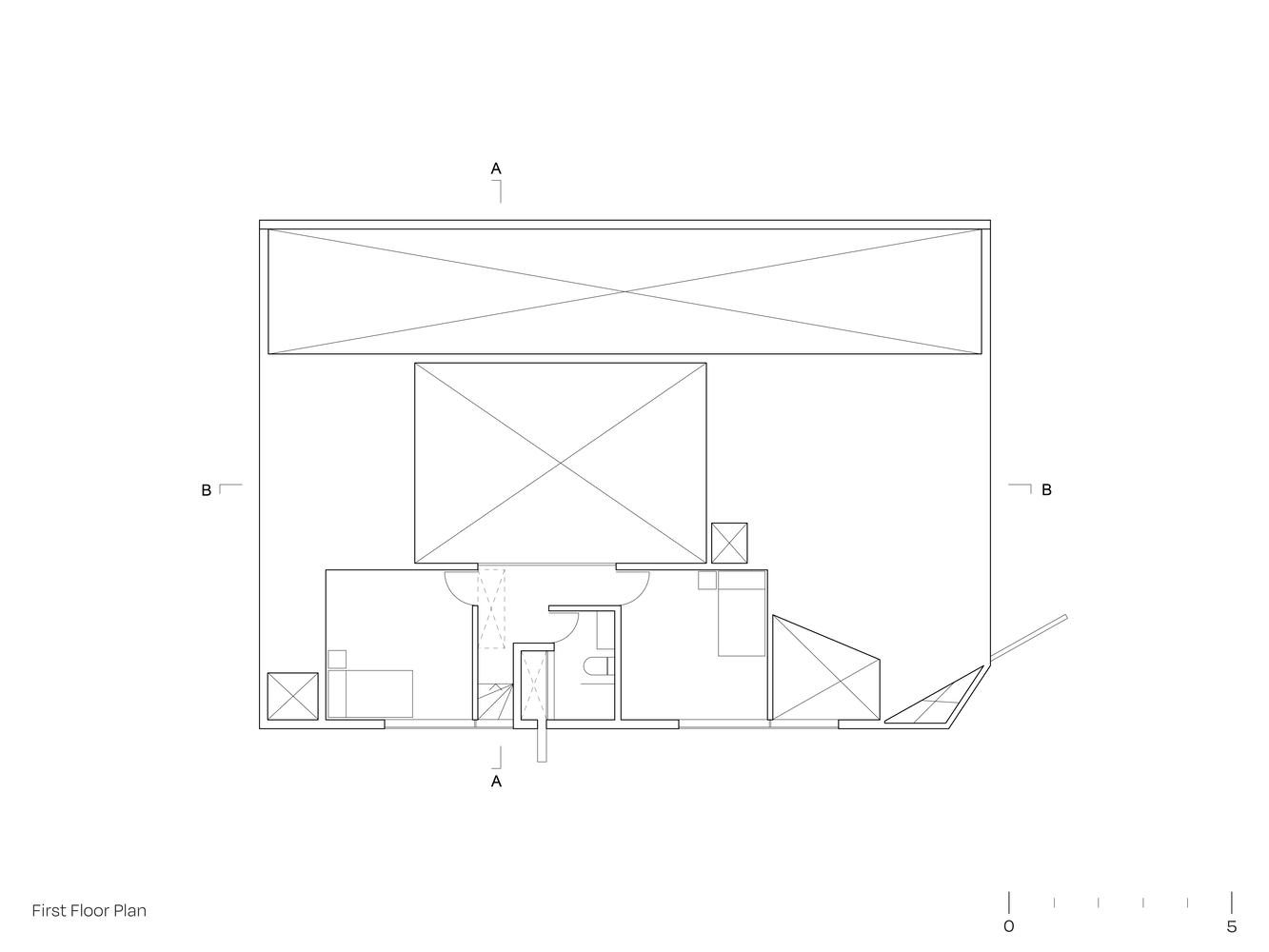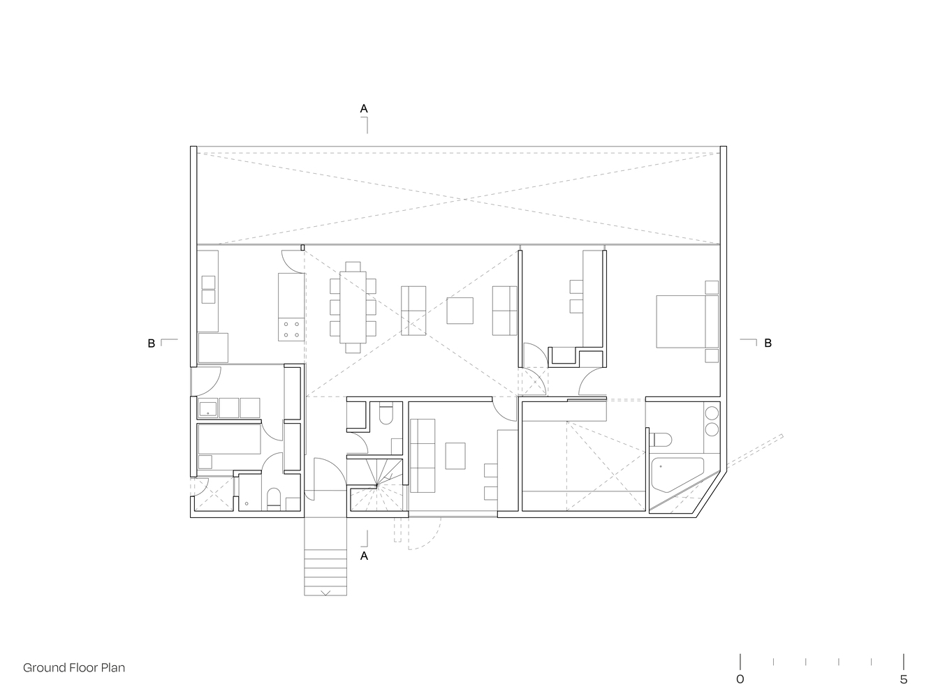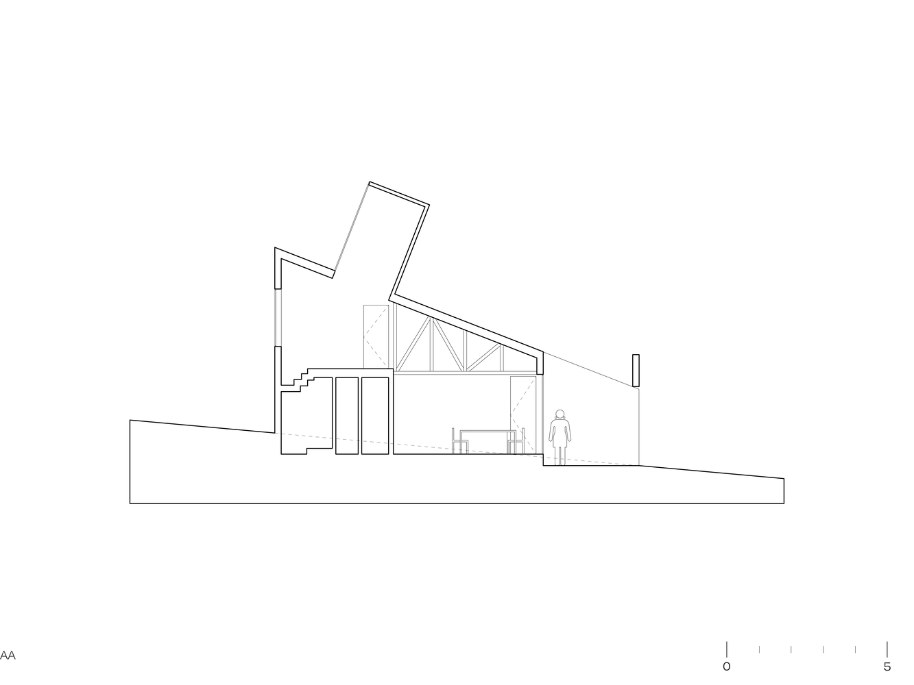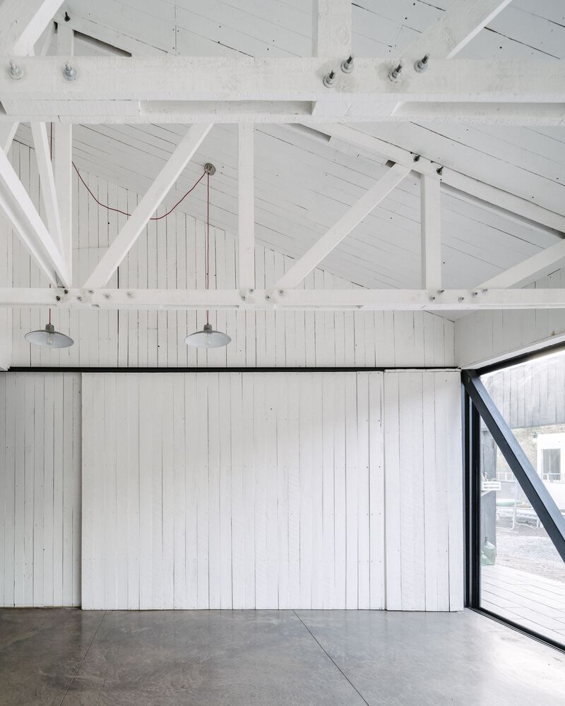 산티아고 북부에 위치한 주택의 디자인 특징은 로컬건축의 전통양식을 재해석한 미니멀 양식입니다. 전통적인 지붕형식을 독특한 형태로 추상화한 작업은 지붕과 벽의 경계를 허물며, 연속된 공간을 확보합니다. 외부(거리)로 부터 이격되기 위한 경사면(지붕) 덕분에 북쪽으로 오픈공간 확보하여 내부 공용공간과 테라스가 함께 호흡하도록 설계합니다.