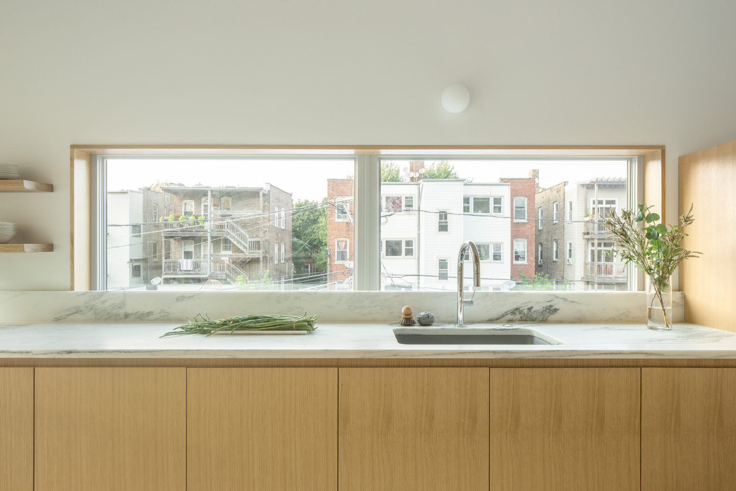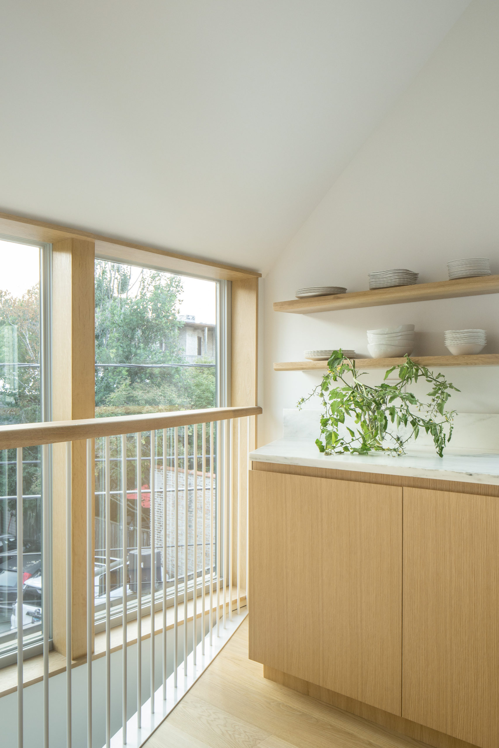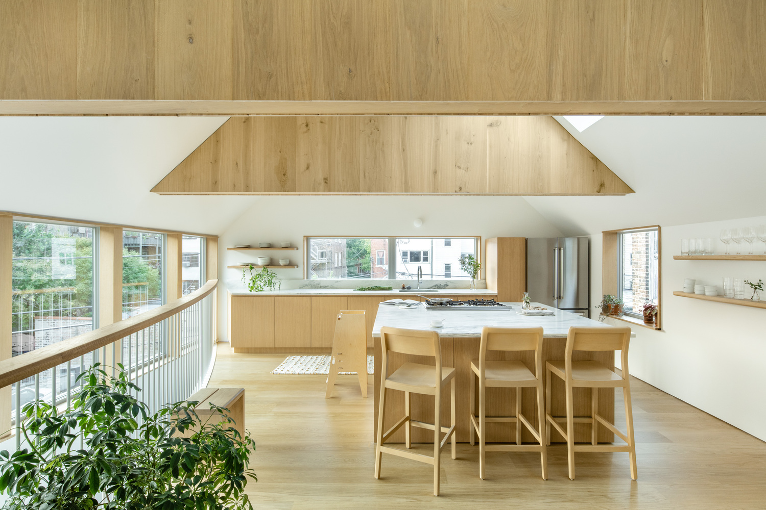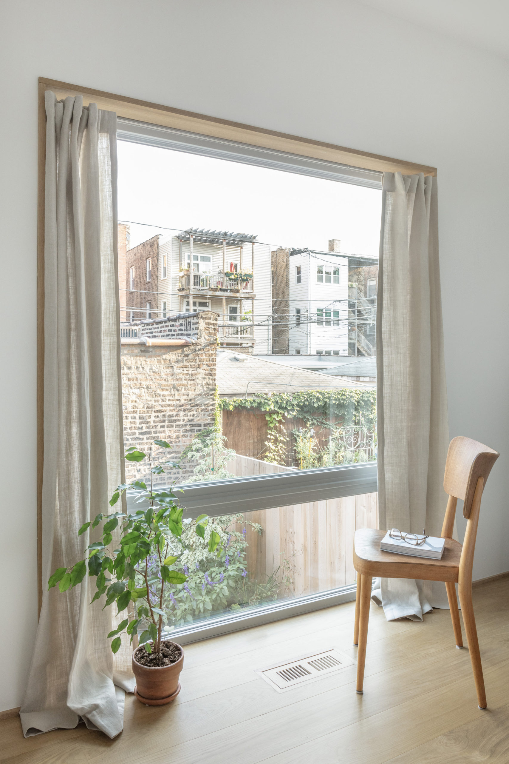 A stair tucked behind the courtyard’s curving wall leads to the second floor. The open plan is organized around four trusses that support the house’s Chicago balloon frame. These trusses distinguish five areas set around the curve of the balustrade: the kitchen, the island, the dining room, the powder room, and the living room. Throughout, a restrained colors and materials palette—white walls and white oak wood floors, trusses, and furnishing draws attention to the qualities of the spaces themselves. All of the shared and public spaces on the second floor are oriented towards a ribbon window that spans the length of the interior courtyard. The 56-foot-long window floods the home with natural light and opens panoramic views that capture the fullness of the surrounding neighborhood: century-old trees, the back balconies and fire-escapes of neighboring buildings, and street lamps with their meandering cabling. The exterior of the home engages the neighborhood’s traditional vernacular style while reflecting the organization of the interior spaces. The design shifts the facade hierarchy from the street to the alleyway, the most urban of the contexts. The street-facing facade has a row of half-height ribbon windows along the second floor and a single door on the first level, maintaining privacy for the front bedroom. On the alleyway side, floor-to-ceiling windows on the second floor and a large picture window facing out to the alleyway from the interior courtyard open the interiors to the urban surroundings.