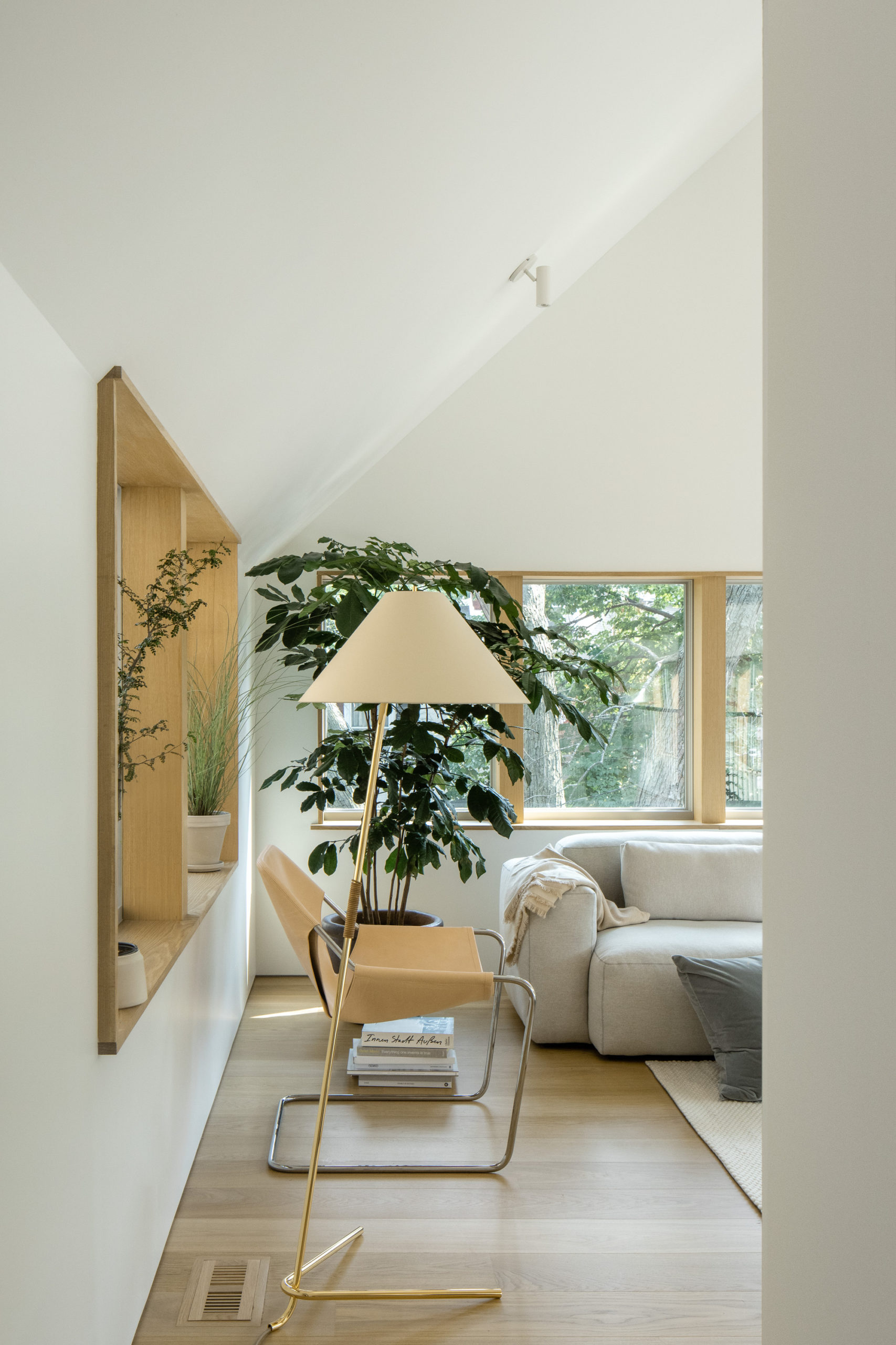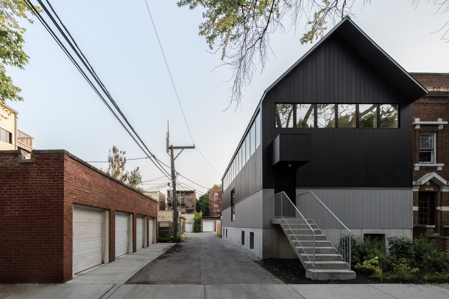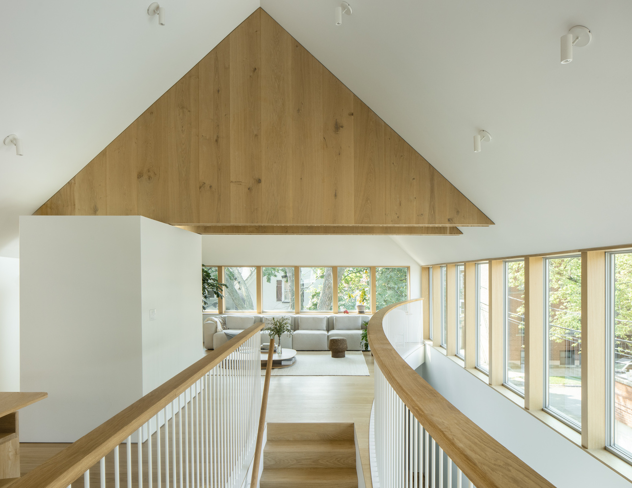A stair tucked behind the courtyard’s curving wall leads to the second floor. The open plan is organized around four trusses that support the house’s Chicago balloon frame. These trusses distinguish five areas set around the curve of the balustrade: the kitchen, the island, the dining room, the powder room, and the living room. Throughout, a restrained colors and materials palette—white walls and white oak wood floors, trusses, and furnishing draws attention to the qualities of the spaces themselves. All of the shared and public spaces on the second floor are oriented towards a ribbon window that spans the length of the interior courtyard. The 56-foot-long window floods the home with natural light and opens panoramic views that capture the fullness of the surrounding neighborhood: century-old trees, the back balconies and fire-escapes of neighboring buildings, and street lamps with their meandering cabling. The exterior of the home engages the neighborhood’s traditional vernacular style while reflecting the organization of the interior spaces. The design shifts the facade hierarchy from the street to the alleyway, the most urban of the contexts. The street-facing facade has a row of half-height ribbon windows along the second floor and a single door on the first level, maintaining privacy for the front bedroom. On the alleyway side, floor-to-ceiling windows on the second floor and a large picture window facing out to the alleyway from the interior courtyard open the interiors to the urban surroundings.