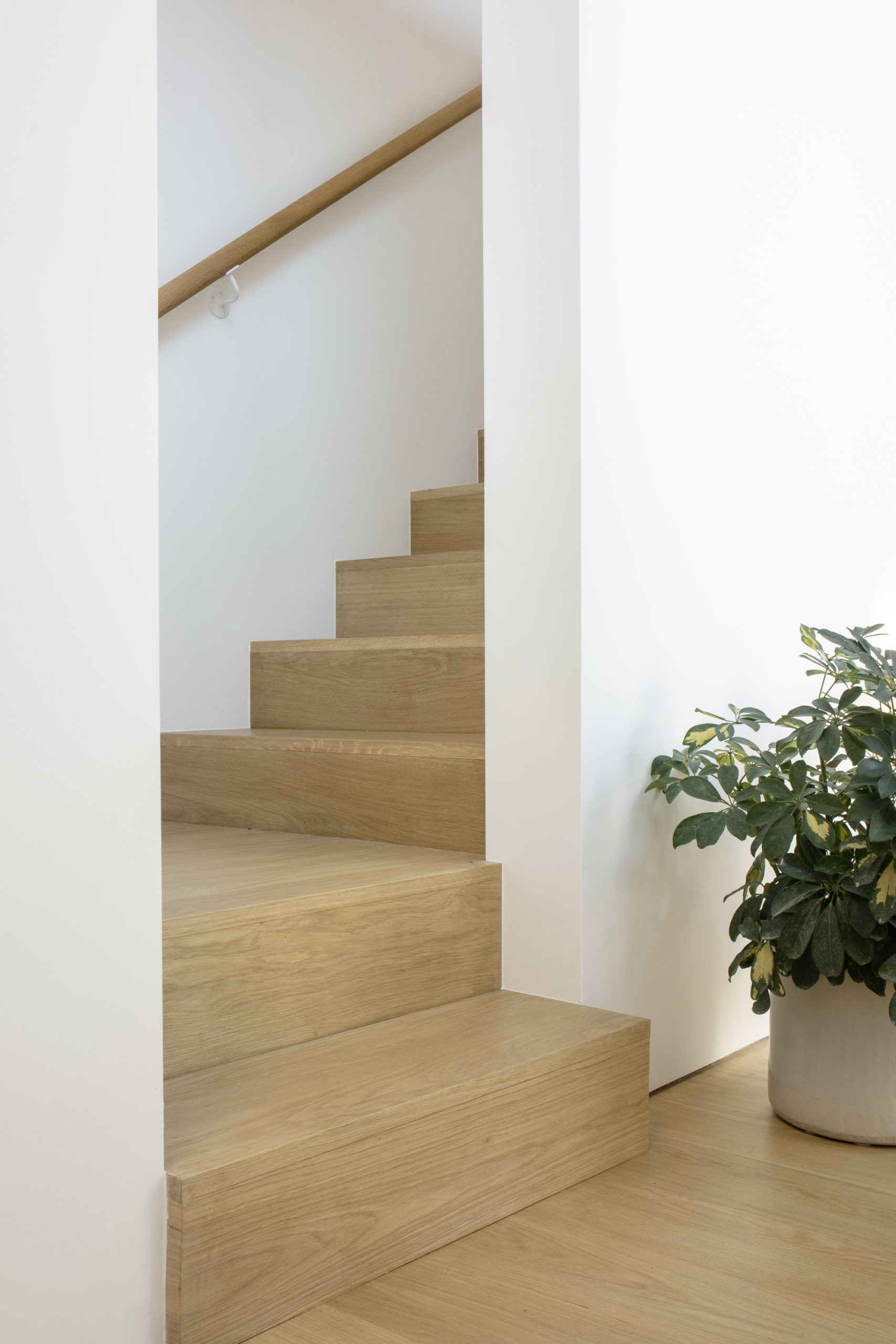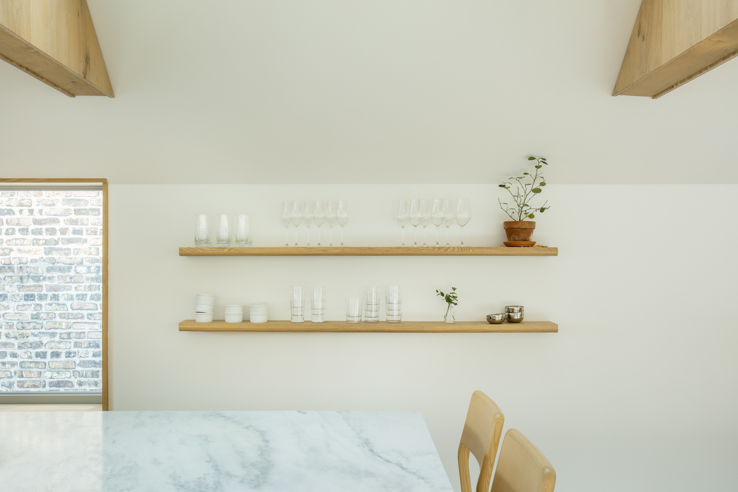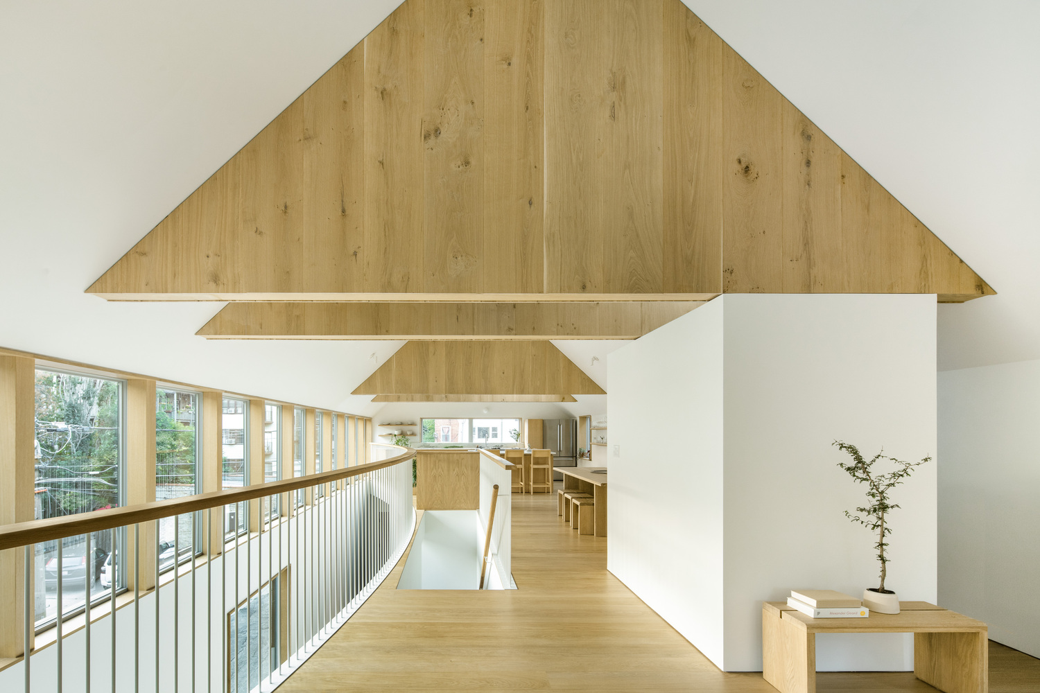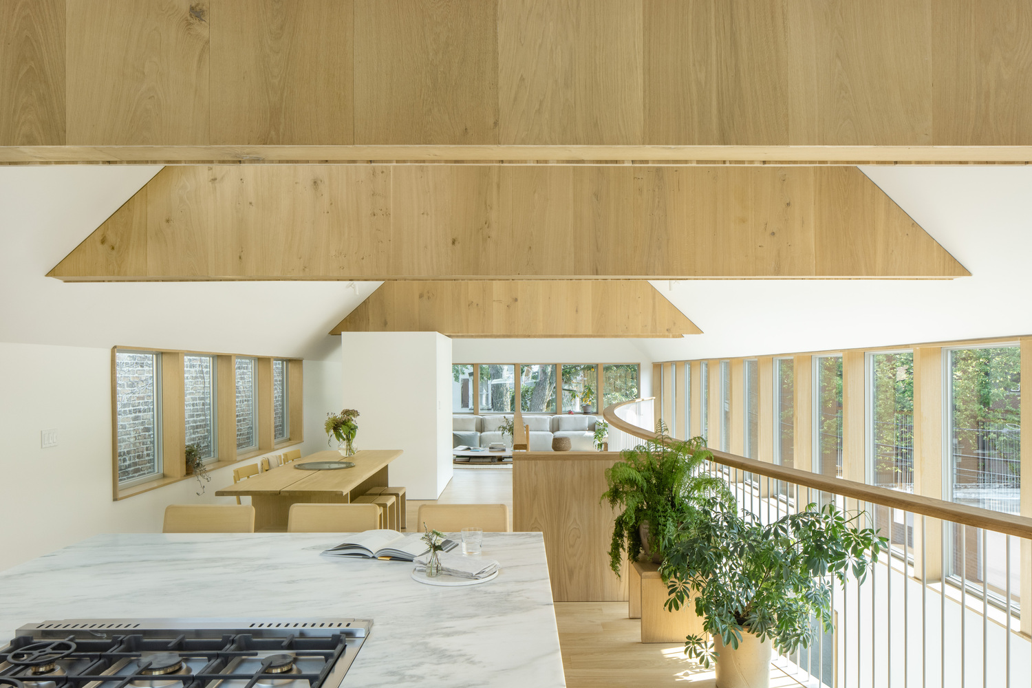 A stair tucked behind the courtyard’s curving wall leads to the second floor. The open plan is organized around four trusses that support the house’s Chicago balloon frame. These trusses distinguish five areas set around the curve of the balustrade: the kitchen, the island, the dining room, the powder room, and the living room. Throughout, a restrained colors and materials palette—white walls and white oak wood floors, trusses, and furnishing draws attention to the qualities of the spaces themselves. All of the shared and public spaces on the second floor are oriented towards a ribbon window that spans the length of the interior courtyard. The 56-foot-long window floods the home with natural light and opens panoramic views that capture the fullness of the surrounding neighborhood: century-old trees, the back balconies and fire-escapes of neighboring buildings, and street lamps with their meandering cabling. The exterior of the home engages the neighborhood’s traditional vernacular style while reflecting the organization of the interior spaces. The design shifts the facade hierarchy from the street to the alleyway, the most urban of the contexts. The street-facing facade has a row of half-height ribbon windows along the second floor and a single door on the first level, maintaining privacy for the front bedroom. On the alleyway side, floor-to-ceiling windows on the second floor and a large picture window facing out to the alleyway from the interior courtyard open the interiors to the urban surroundings.