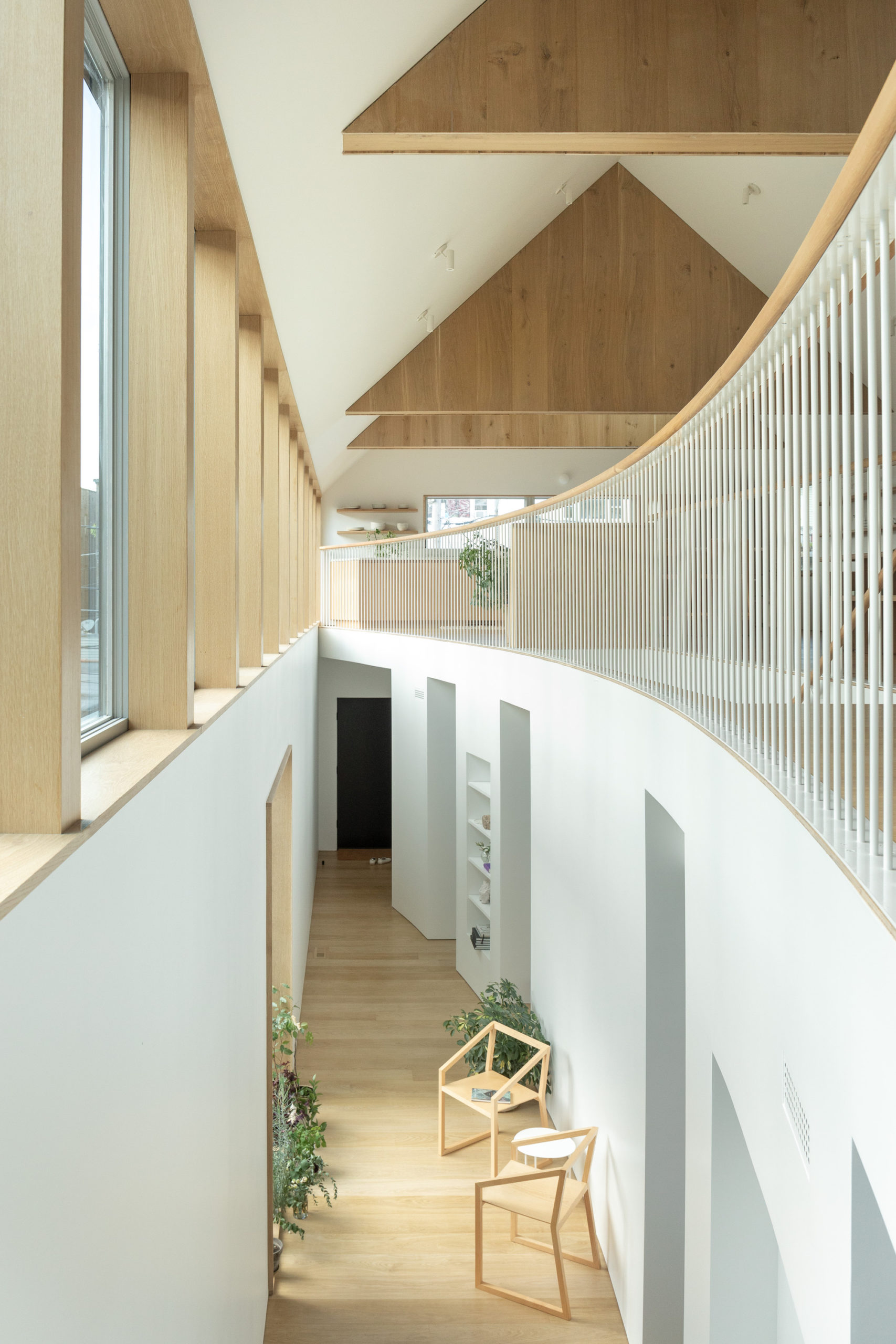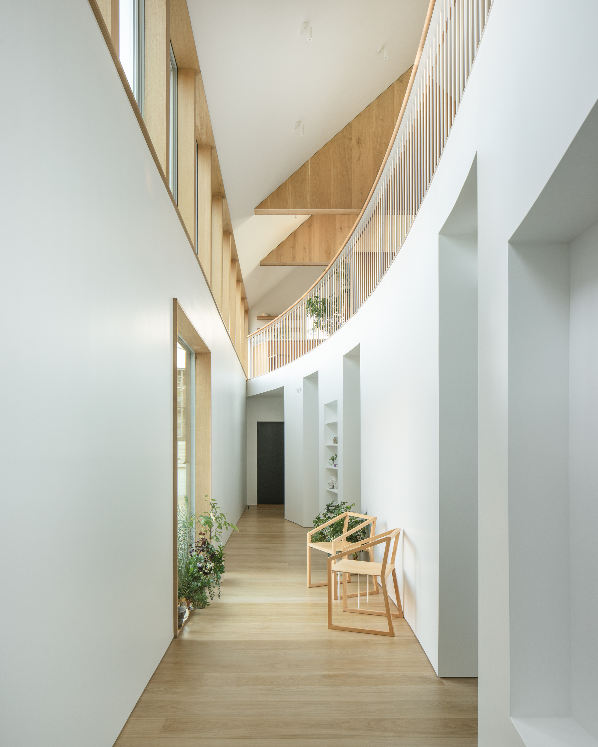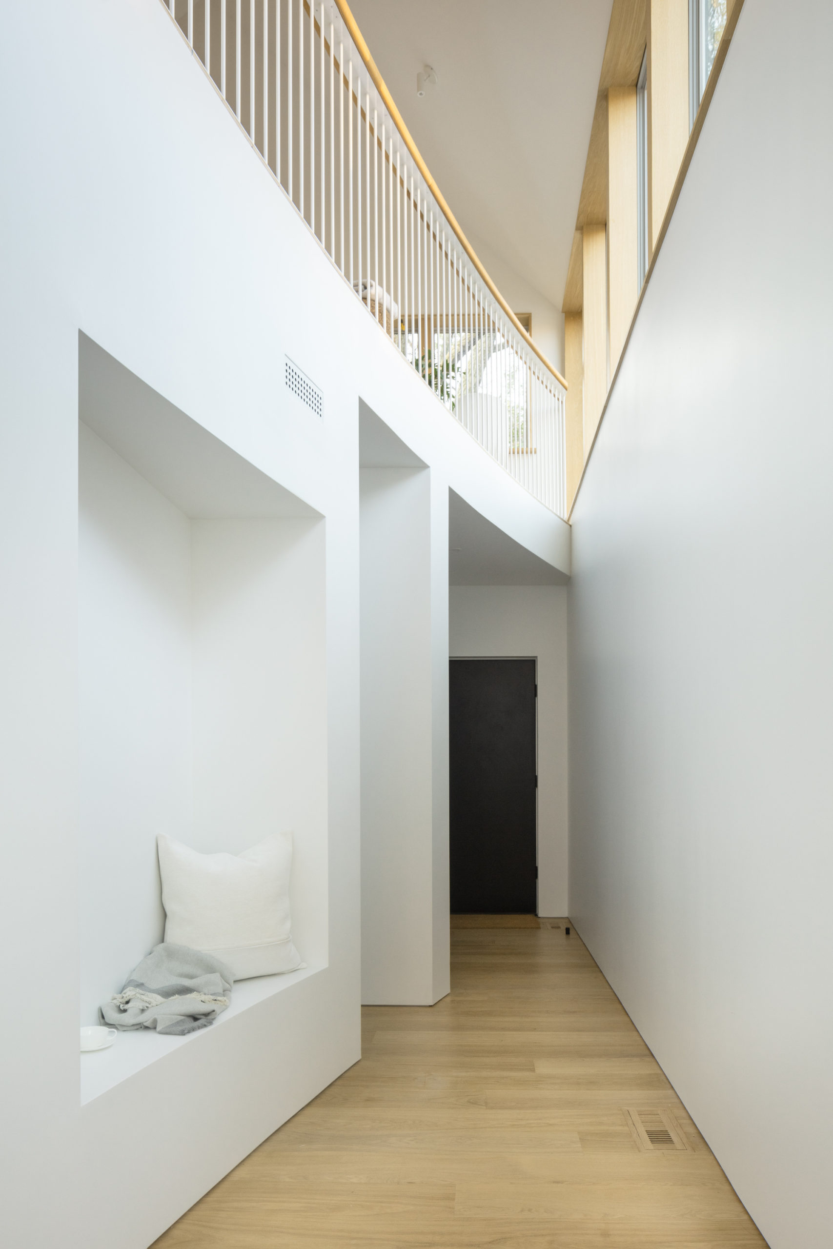Ardmore House is a minimal residence located in Edgewater, Chicago, designed by Kwong Von Glinow. For this house bordering an alleyway on a traditional Chicago lot, Kwong Von Glinow flips the traditional residential section, arraying bedrooms on the first floor and living spaces on the second. This approach supports contemporary ways of living, emphasizing communal areas, interconnectivity, and flexible live work spaces that receive ample natural light and engage the surrounding urban context. A curved double-height atrium runs lengthwise from front to back doors, creating an interior courtyard that vertically connects the common areas on the first and second floors. Defined by a large picture window and a curving wall, the courtyard offers an informal multi-purpose area where residents can relax and their children can play. The design of the home balances privacy and openness on the urban site. Off the courtyard’s curving inner wall lie all of the home’s bedrooms, pushed away from the alleyway towards the neighboring lot. The two bedrooms nearer the front of the house have windows that look toward the neighbor’s Chicago brick wall, providing privacy from the view of the street and neighbors. The primary bedroom suite is located at the back of the home, overlooking a private garden.