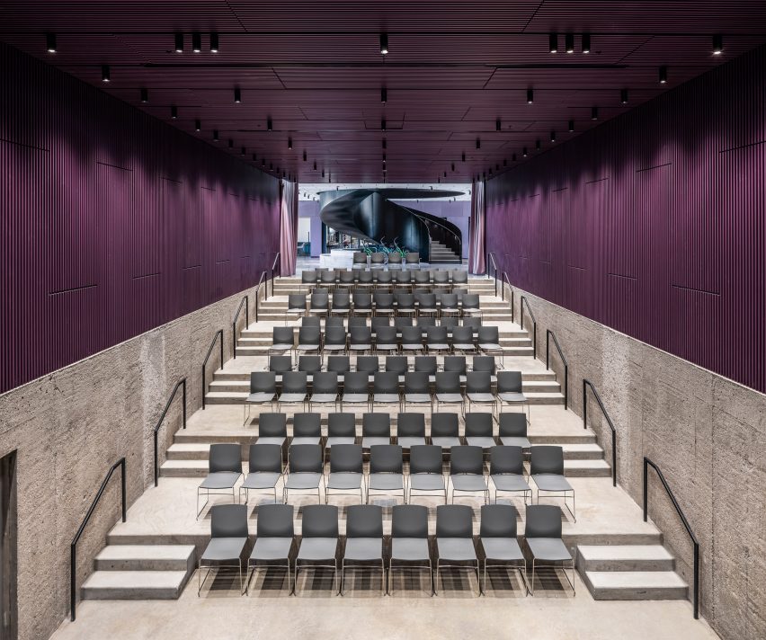 The events centre contains a rooftop terrace and a large auditorium surrounded by flexible open spaces, as well as an amphitheatre and a rooftop meeting room.
