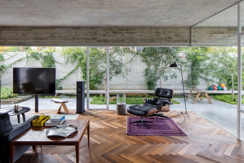 Huge windows and patios in this concrete house in Tel Aviv shed natural light across the interior while also allowing the family full views of the surrounding garden.