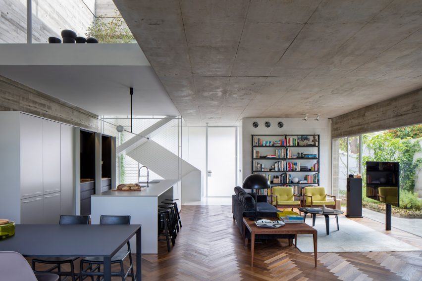 The house is arranged around the voids in its boxy concrete frame. Living spaces are largely open plan, and are dispersed over the three floors – with bedrooms contained to the highest level.