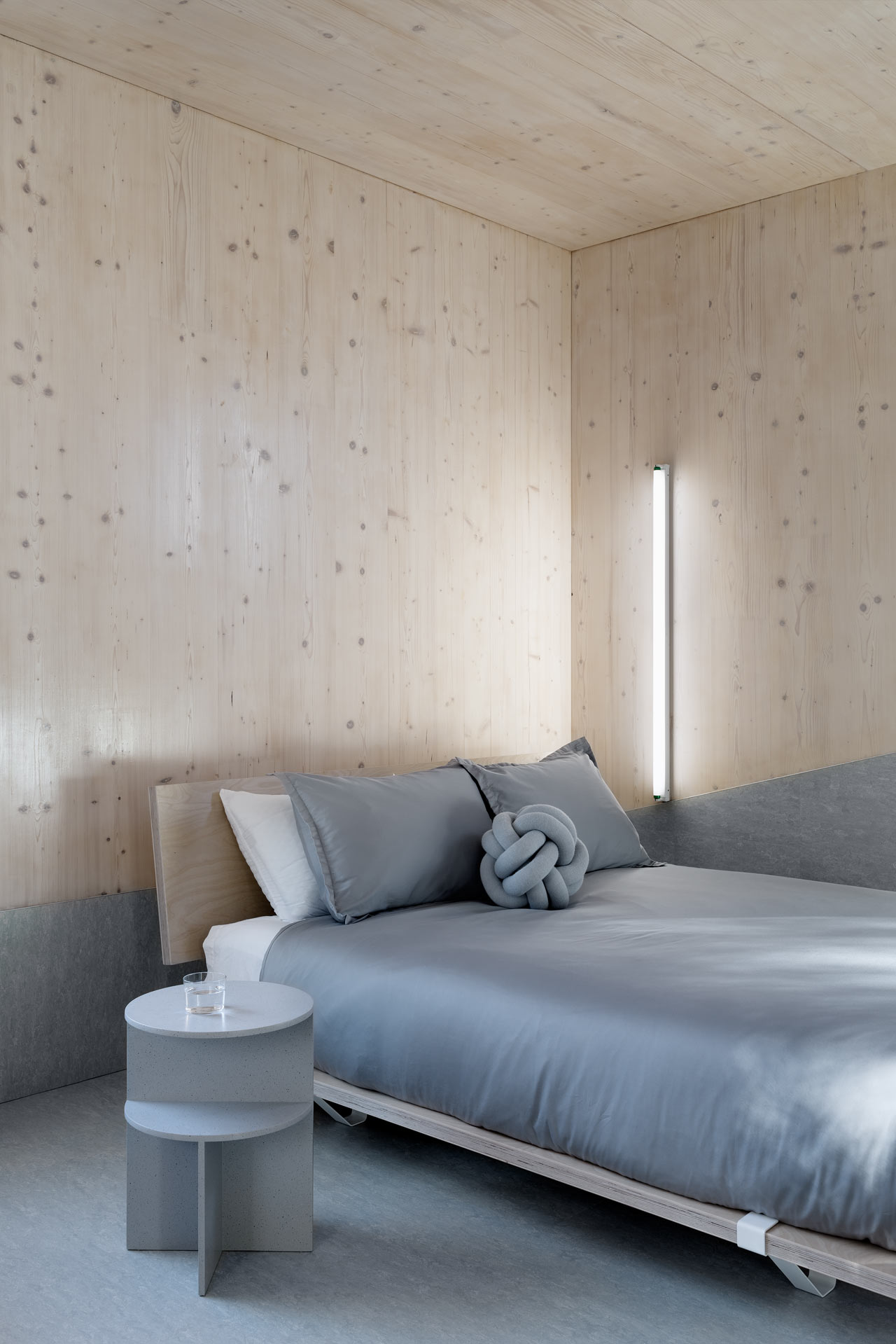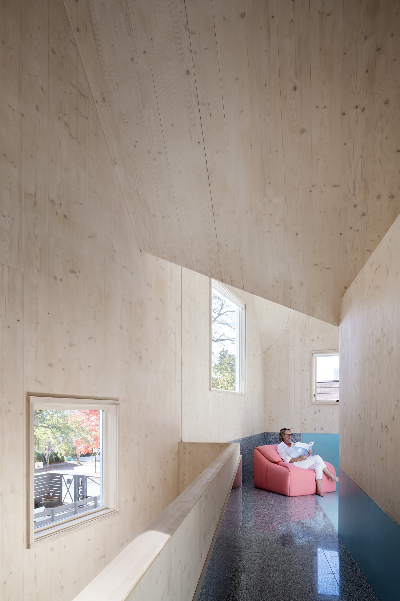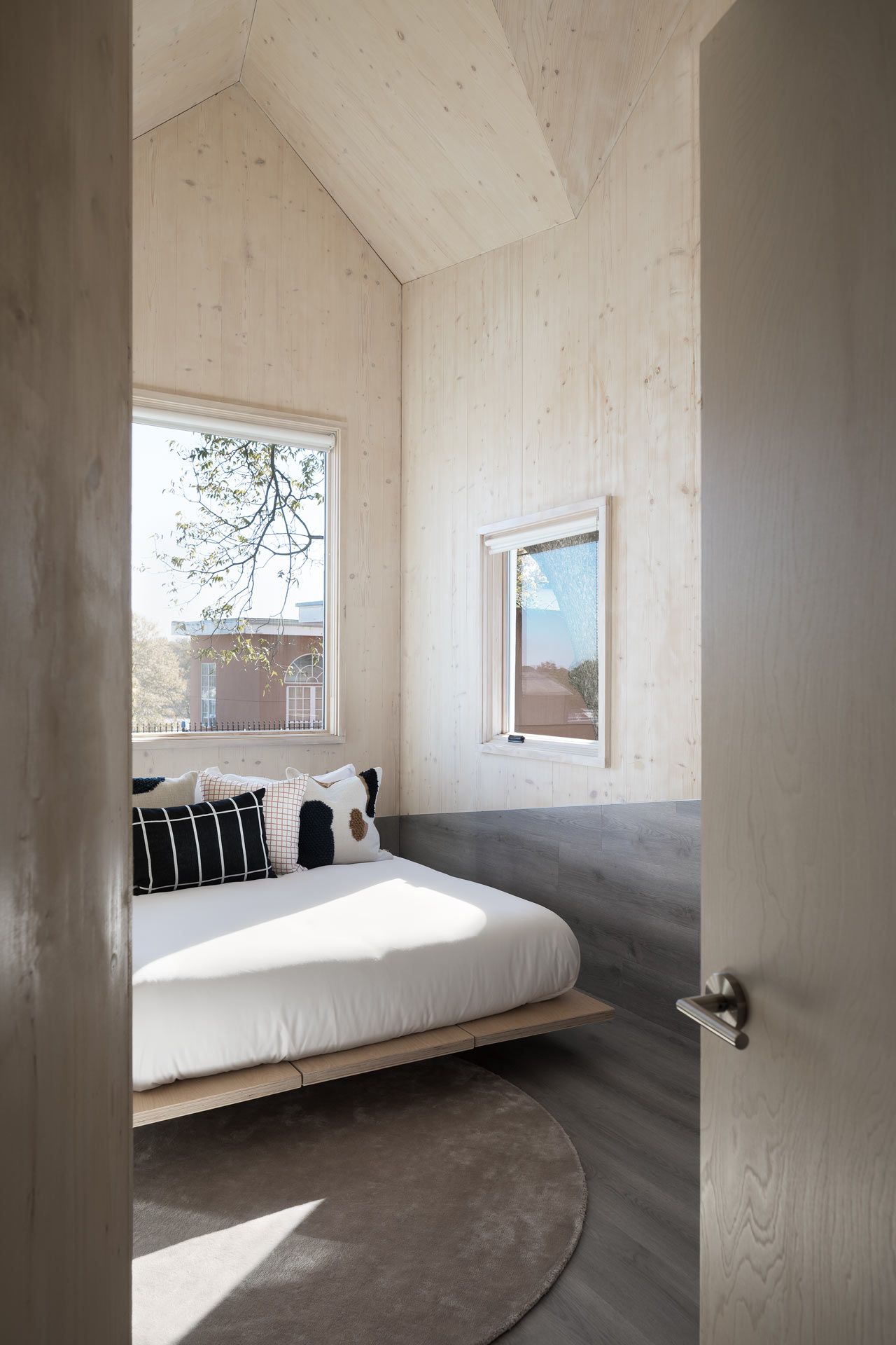 One of the home’s main distinctions is the fact that it’s made completely out of solid cross laminated timber (CLT), a wood material composed of alternating layers of lumber glued together. That includes the exterior and interior walls, the roof, and all of the floors, adding it to one of just a few residences in the U.S. that are made from the material. The CLT panels were custom-cut and lifted into place to construct the house in a mere 14 days.