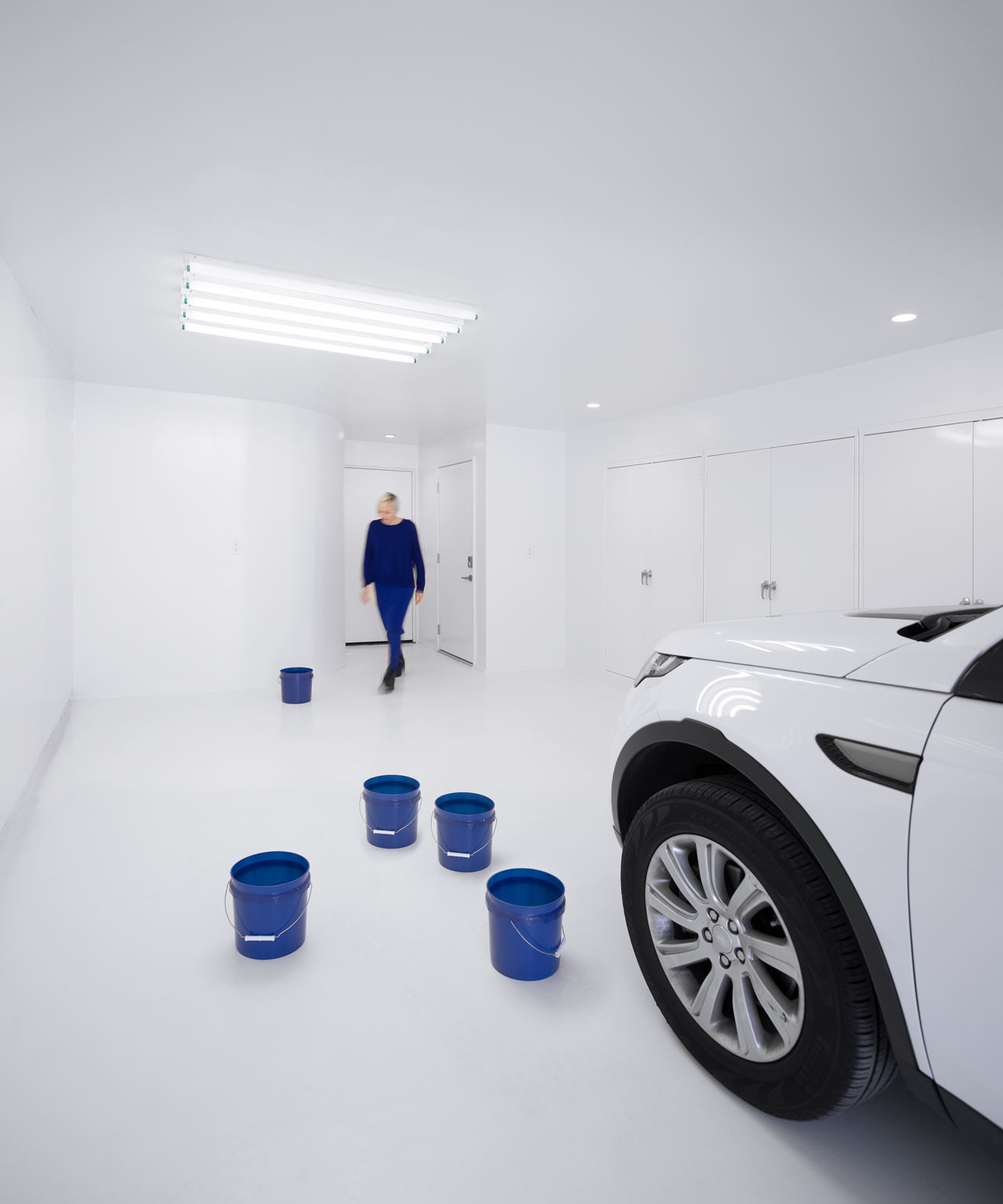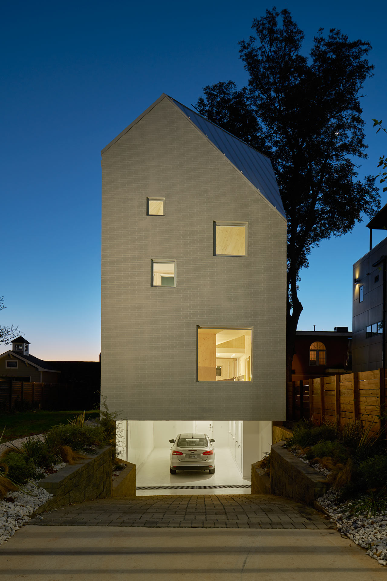 At first glance, the differences from a typical house are apparent. The tall, narrow form rises to form an asymmetrical silhouette that hovers over an all white carport. Windows in varying sizes punctuate the exterior, where two sides are clad in fake bricks made from stucco.