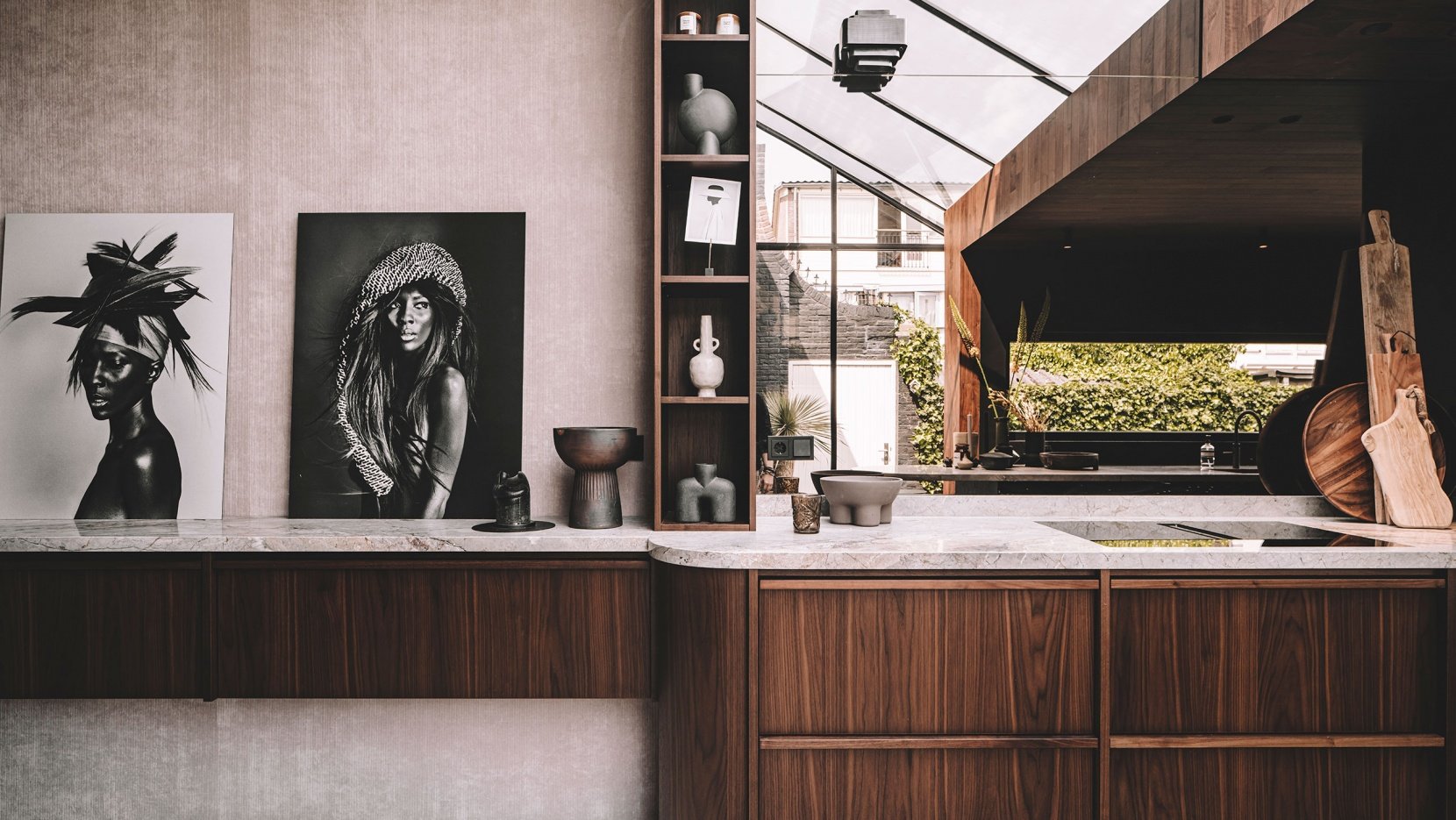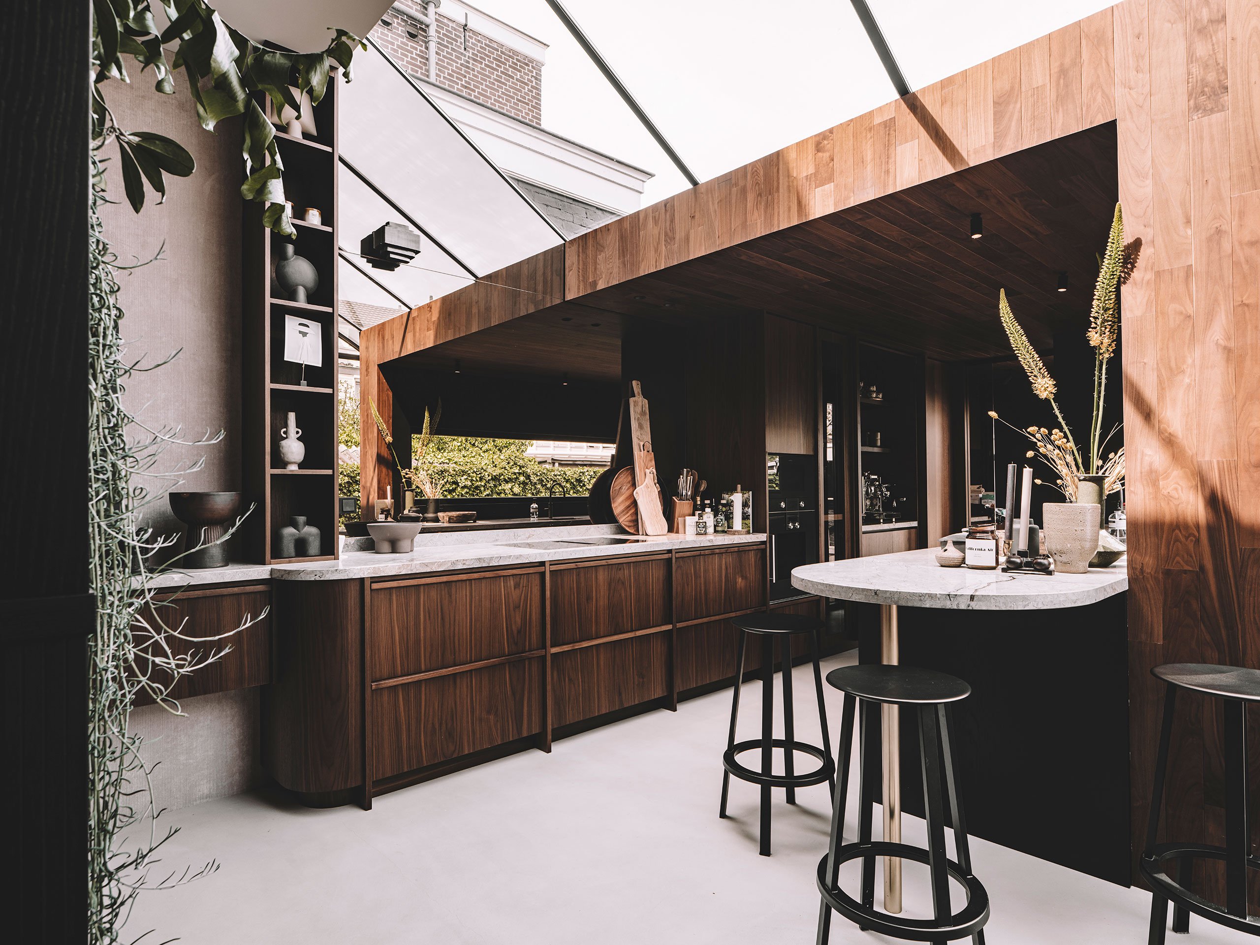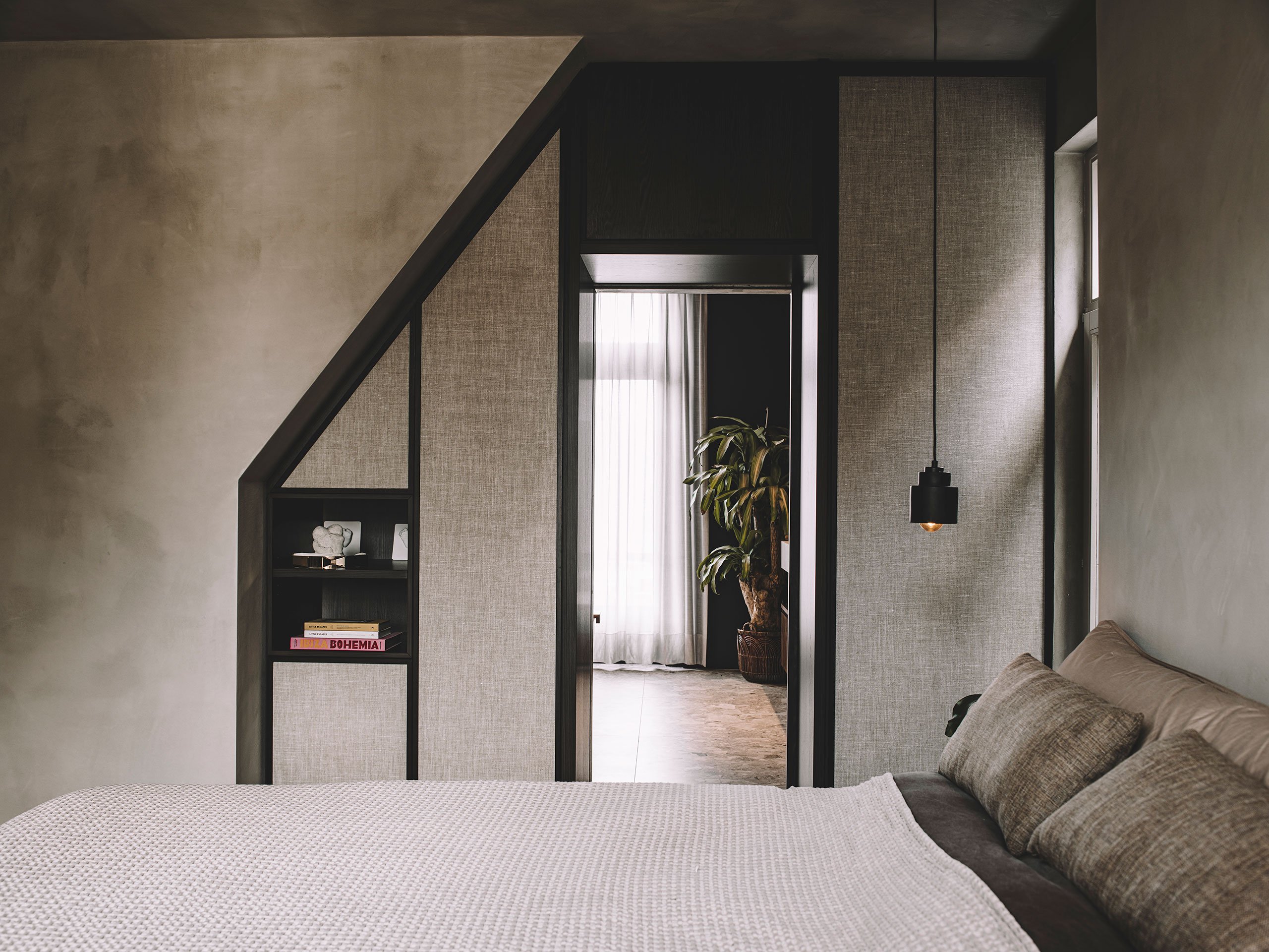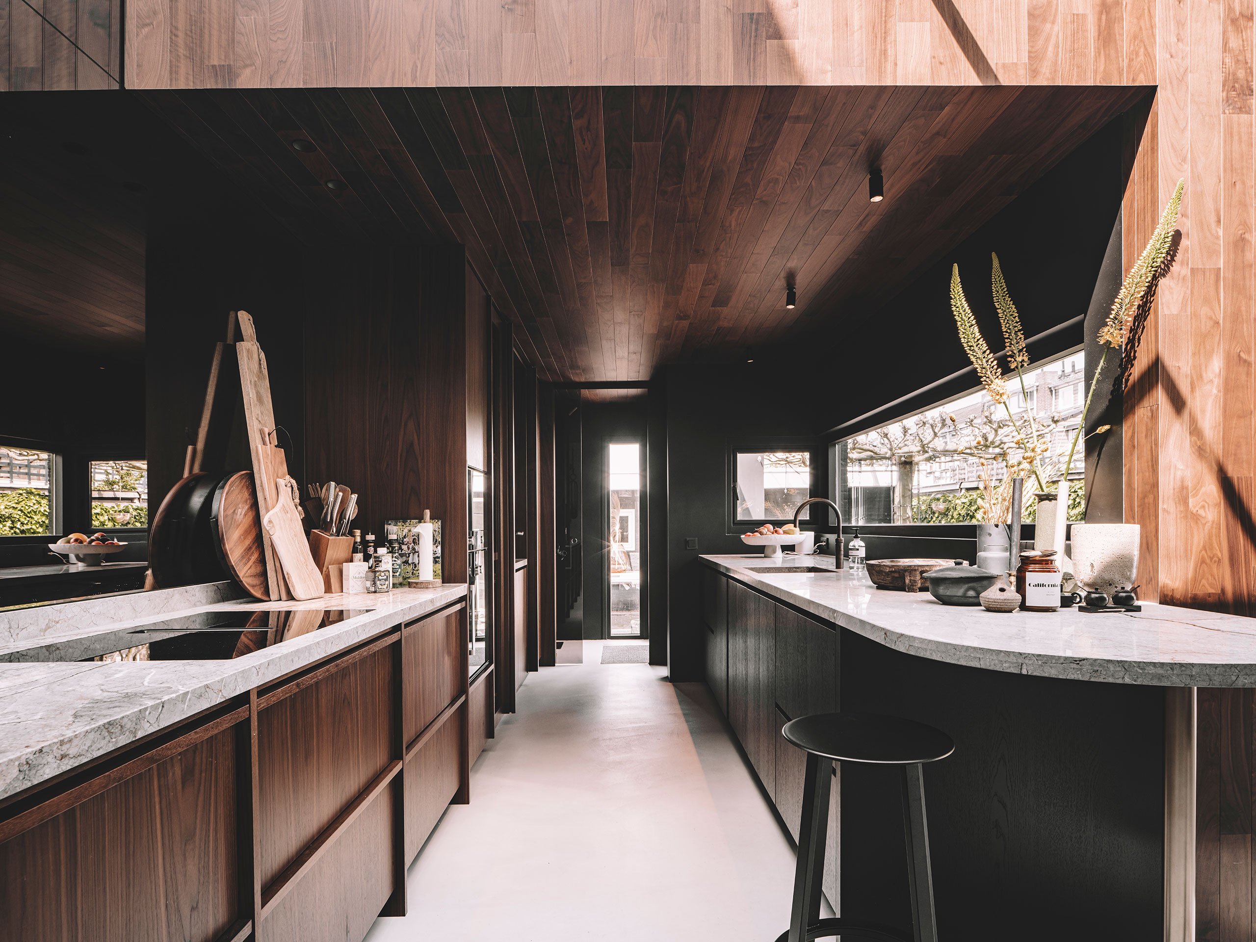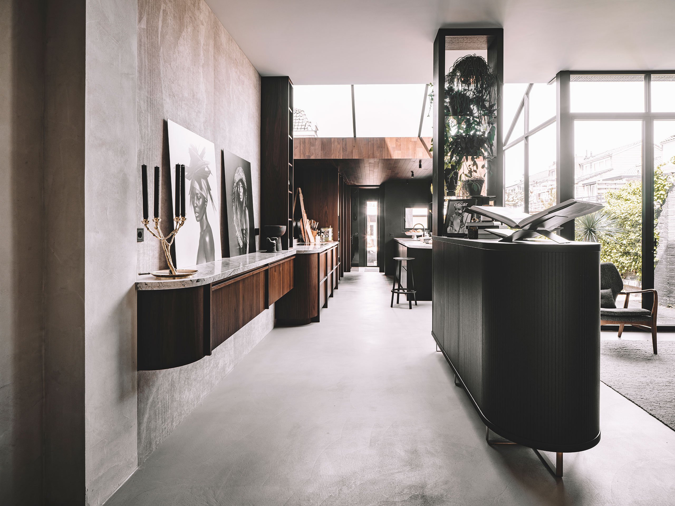 Underpinned by a muted palette of grey and beige hues, and swathed in hand applied plastering and unpolished concrete floors, the living room is a paradigm of minimalist elegance and tactile beauty. Bespoke walnut furnishings and plush carpets add warmth, while the restored bay window and brick pattern parquet at the front of the space add nostalgic touches. Ensconced in the timber-clad extension, the kitchen is delineated by two stone worktops that extend into the living room, one taking the form of a wall-mounted console, the other as a dining counter complete with bar-style seating. Complementing the crisp, streamlined design of such bespoke elements, the owners’ collection of modernist furniture and ceramics allow the house’s centennial soul to effortlessly segue into de Nijs’ contemporary interiors.