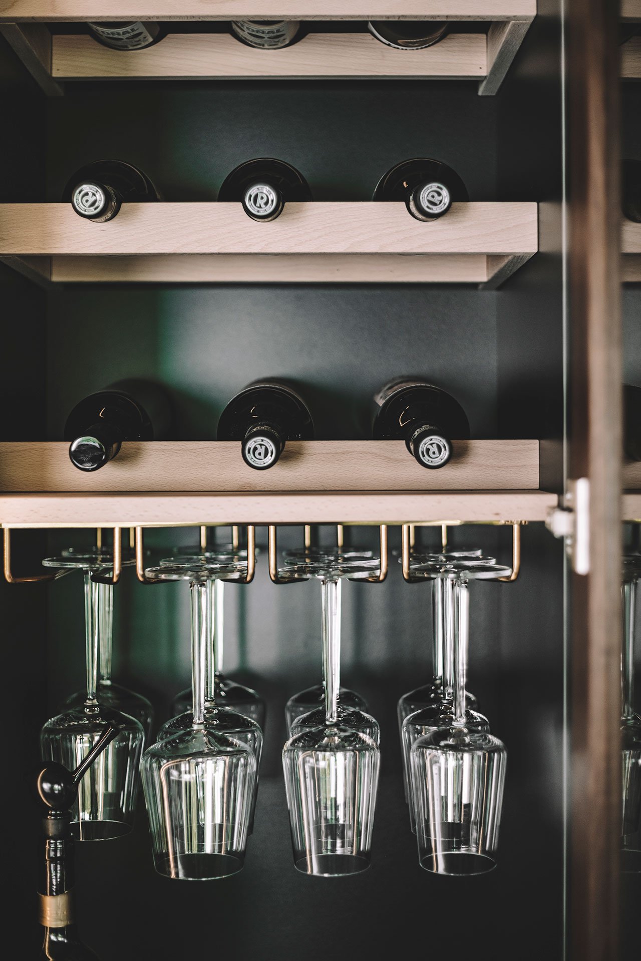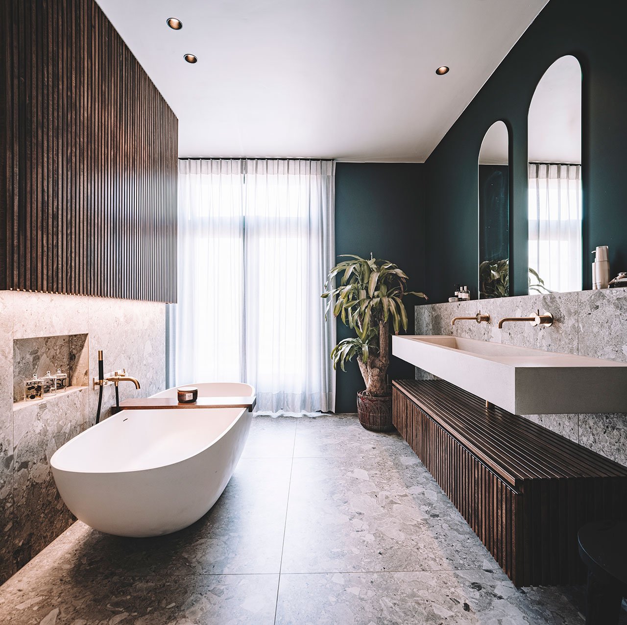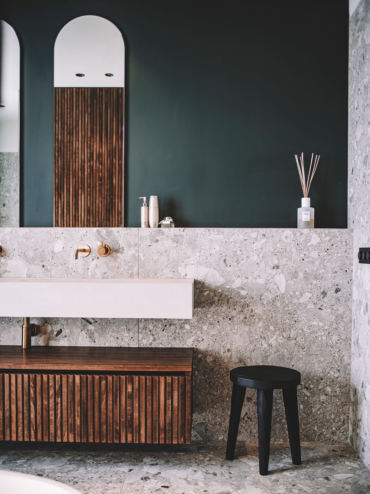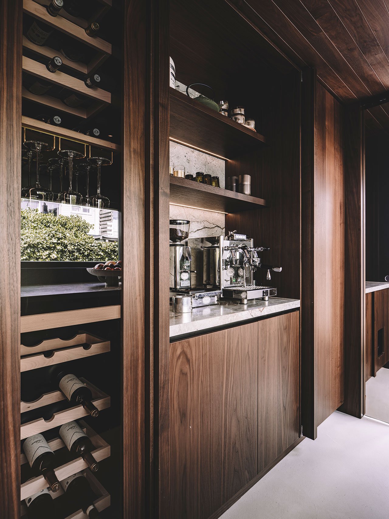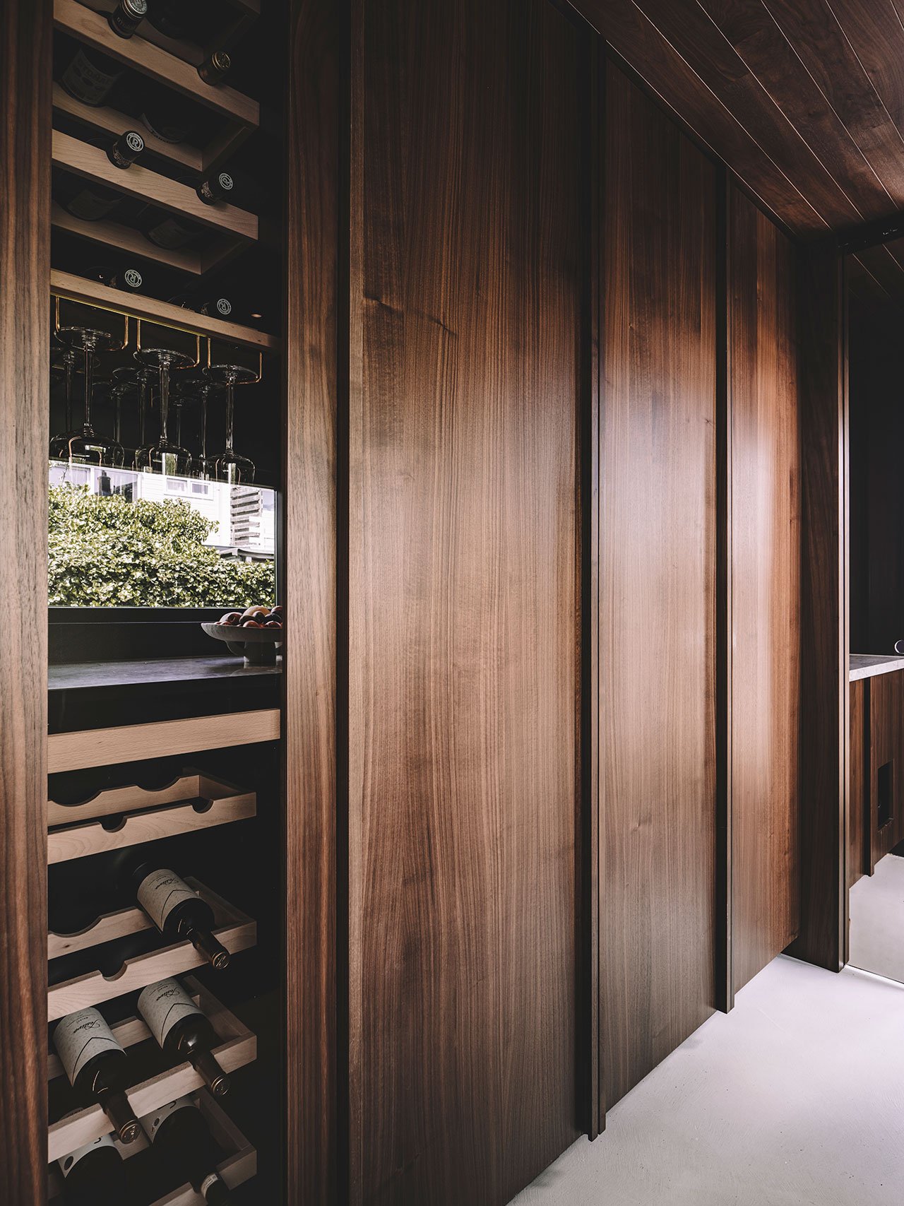Underpinned by a muted palette of grey and beige hues, and swathed in hand applied plastering and unpolished concrete floors, the living room is a paradigm of minimalist elegance and tactile beauty. Bespoke walnut furnishings and plush carpets add warmth, while the restored bay window and brick pattern parquet at the front of the space add nostalgic touches. Ensconced in the timber-clad extension, the kitchen is delineated by two stone worktops that extend into the living room, one taking the form of a wall-mounted console, the other as a dining counter complete with bar-style seating. Complementing the crisp, streamlined design of such bespoke elements, the owners’ collection of modernist furniture and ceramics allow the house’s centennial soul to effortlessly segue into de Nijs’ contemporary interiors.