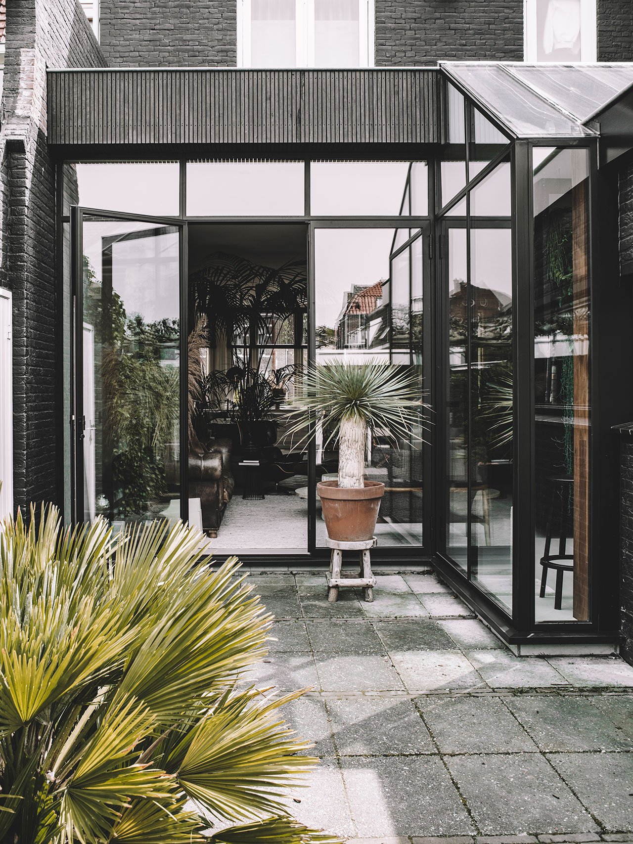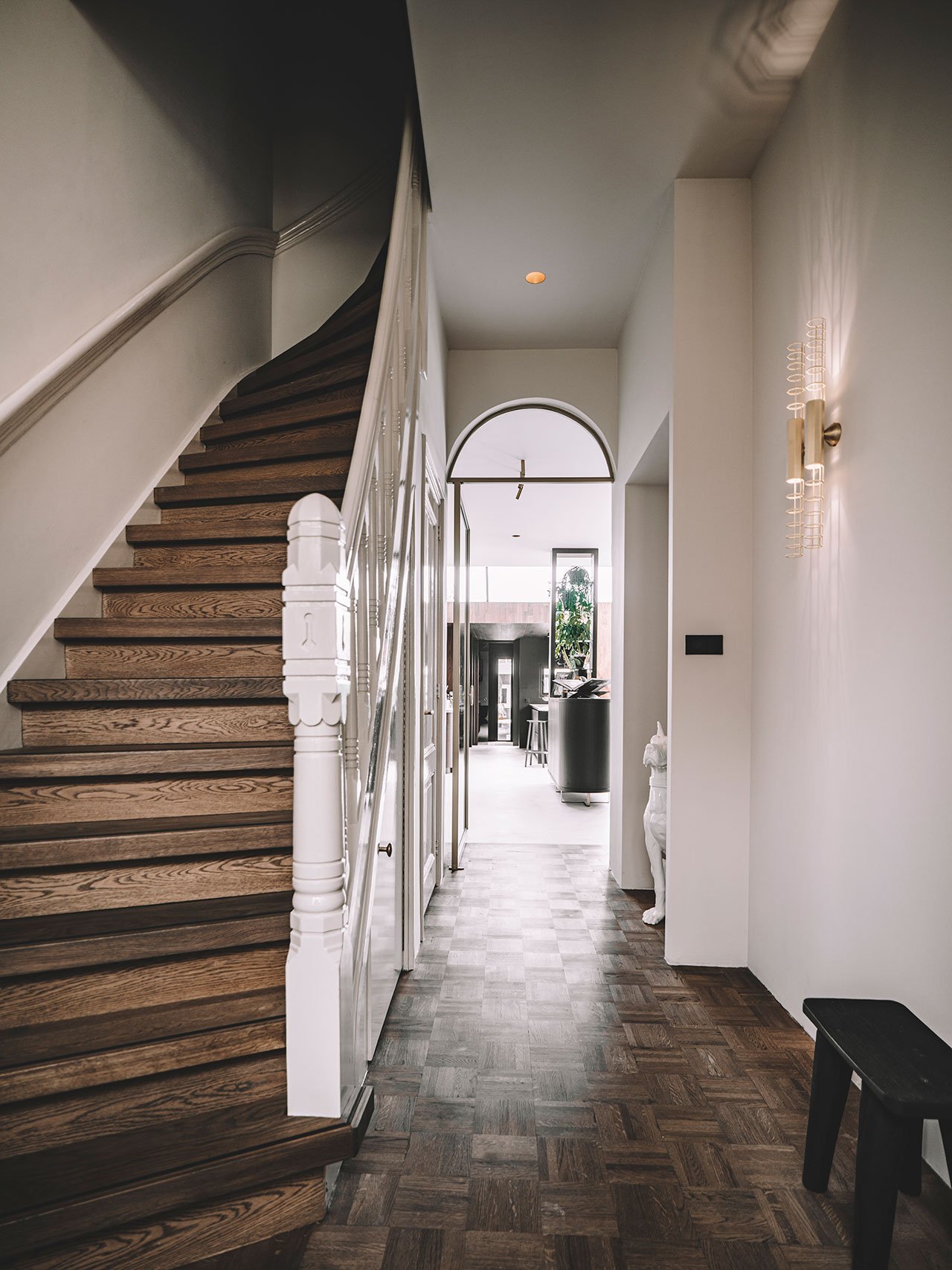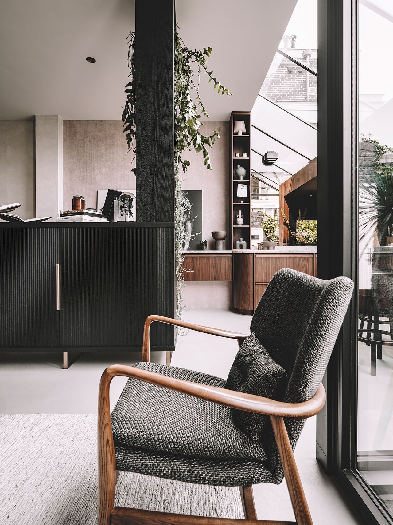 Upon entering into an airy vestibule, the high ceiling, stately staircase and arched doorway attest to the building’s turn-of-the-century provenance – the house was built in 1906 –while a long sightline through the living spaces and new extension, all the way through to the back garden, hints at de Nijs’ bold intervention, namely the merging of the ground floor spaces into a loft-like, open-plan living and dining area that runs the length of the house. Thoroughly modern in design, the merged living space is awash in natural light courtesy of the new garden-side minimalist glass façade and adjoining skylight, the latter seamlessly connecting the existing structure with the new extension.