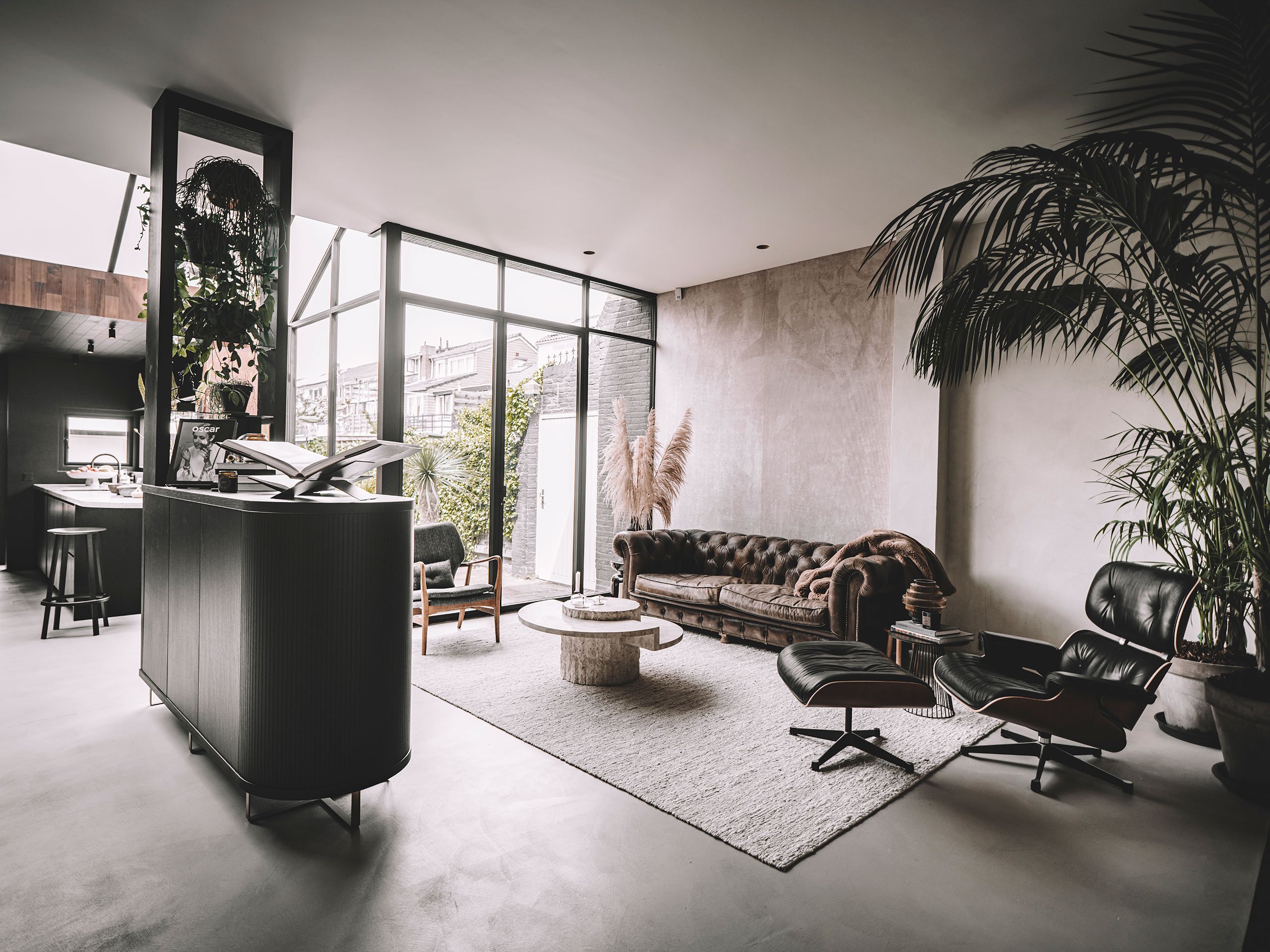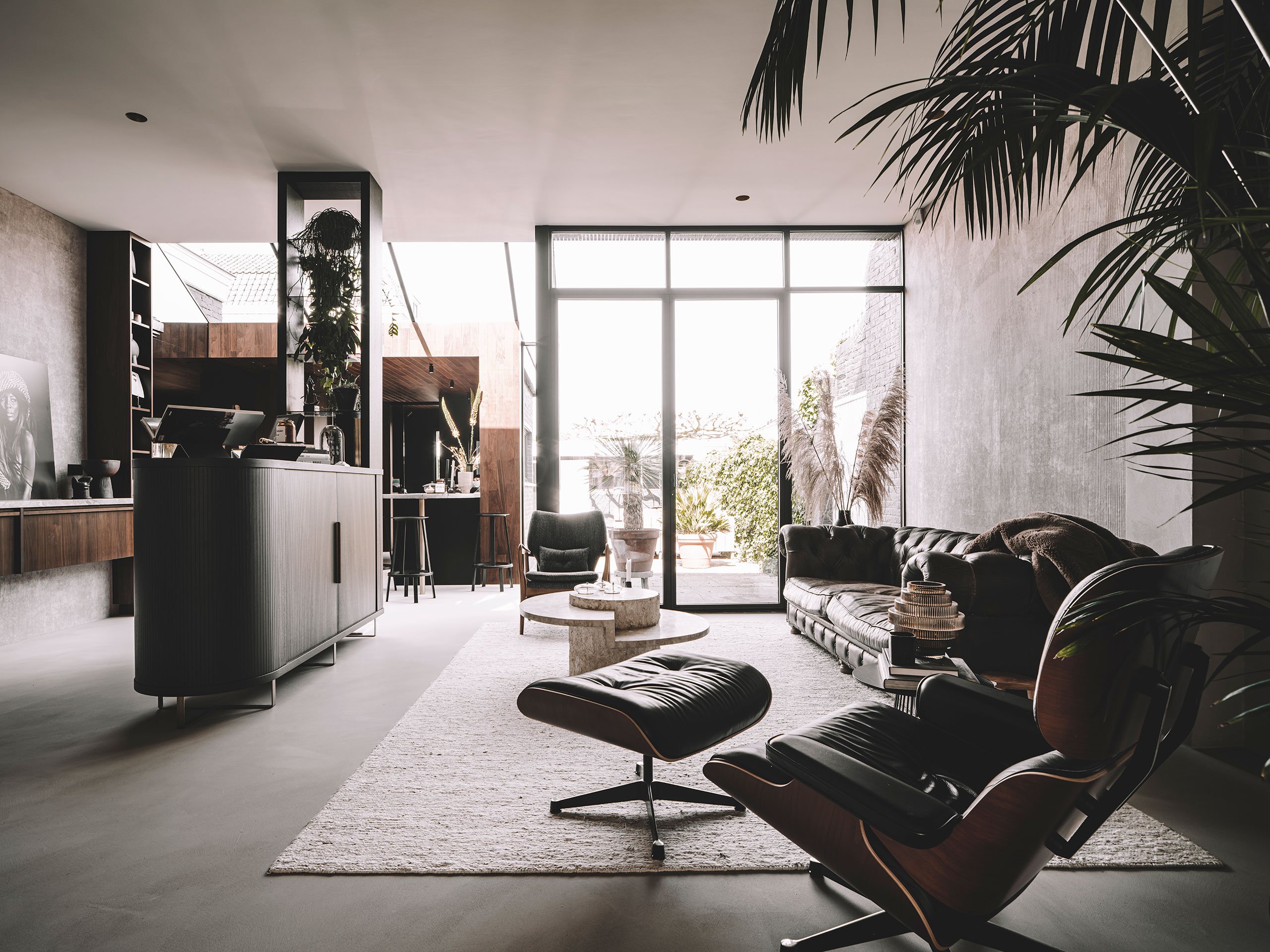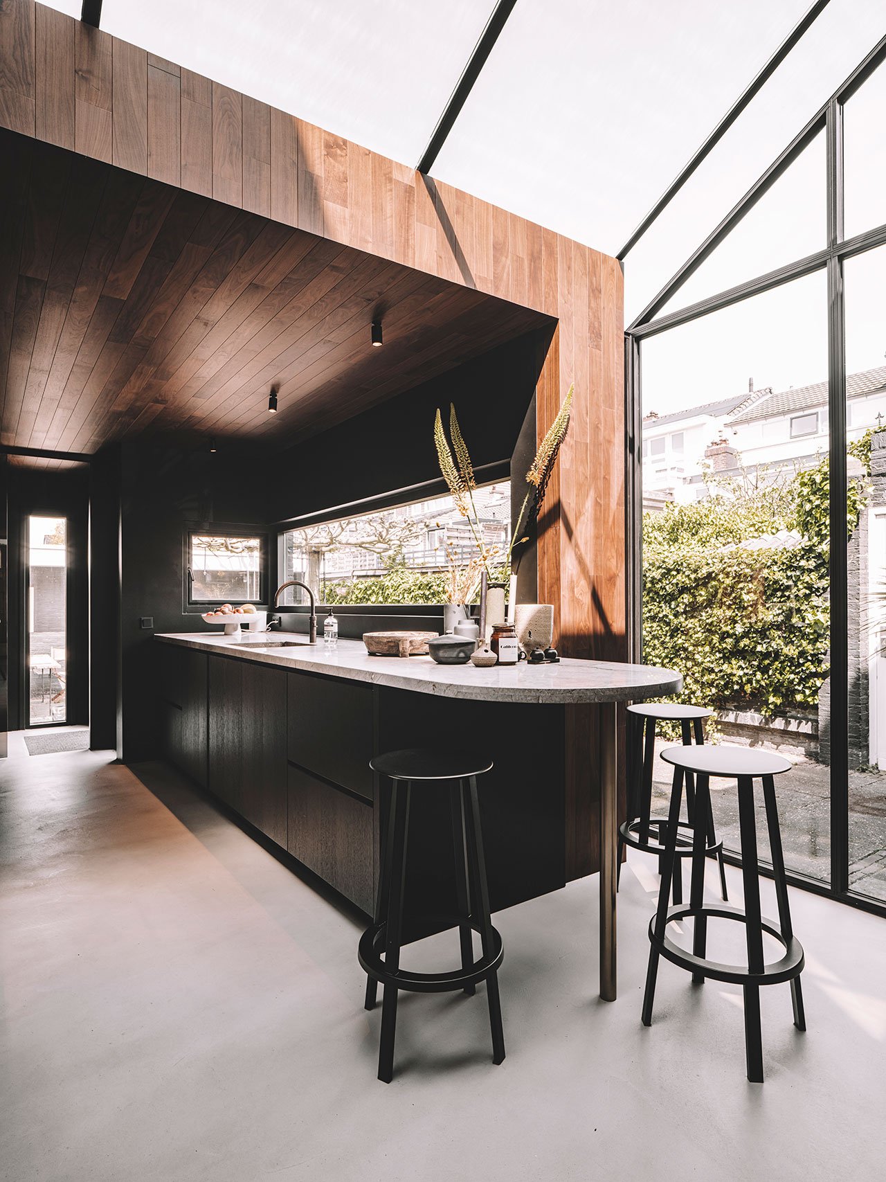 Upon entering into an airy vestibule, the high ceiling, stately staircase and arched doorway attest to the building’s turn-of-the-century provenance – the house was built in 1906 –while a long sightline through the living spaces and new extension, all the way through to the back garden, hints at de Nijs’ bold intervention, namely the merging of the ground floor spaces into a loft-like, open-plan living and dining area that runs the length of the house. Thoroughly modern in design, the merged living space is awash in natural light courtesy of the new garden-side minimalist glass façade and adjoining skylight, the latter seamlessly connecting the existing structure with the new extension.