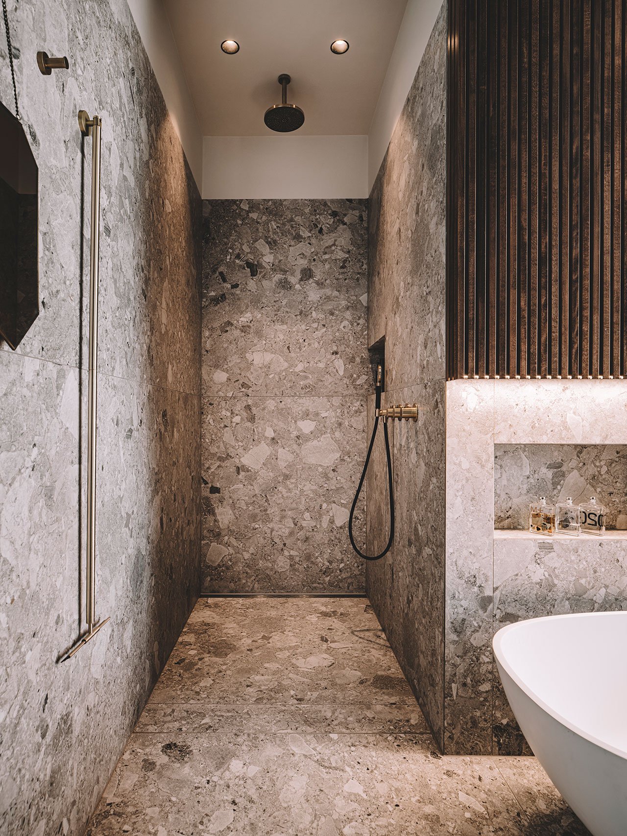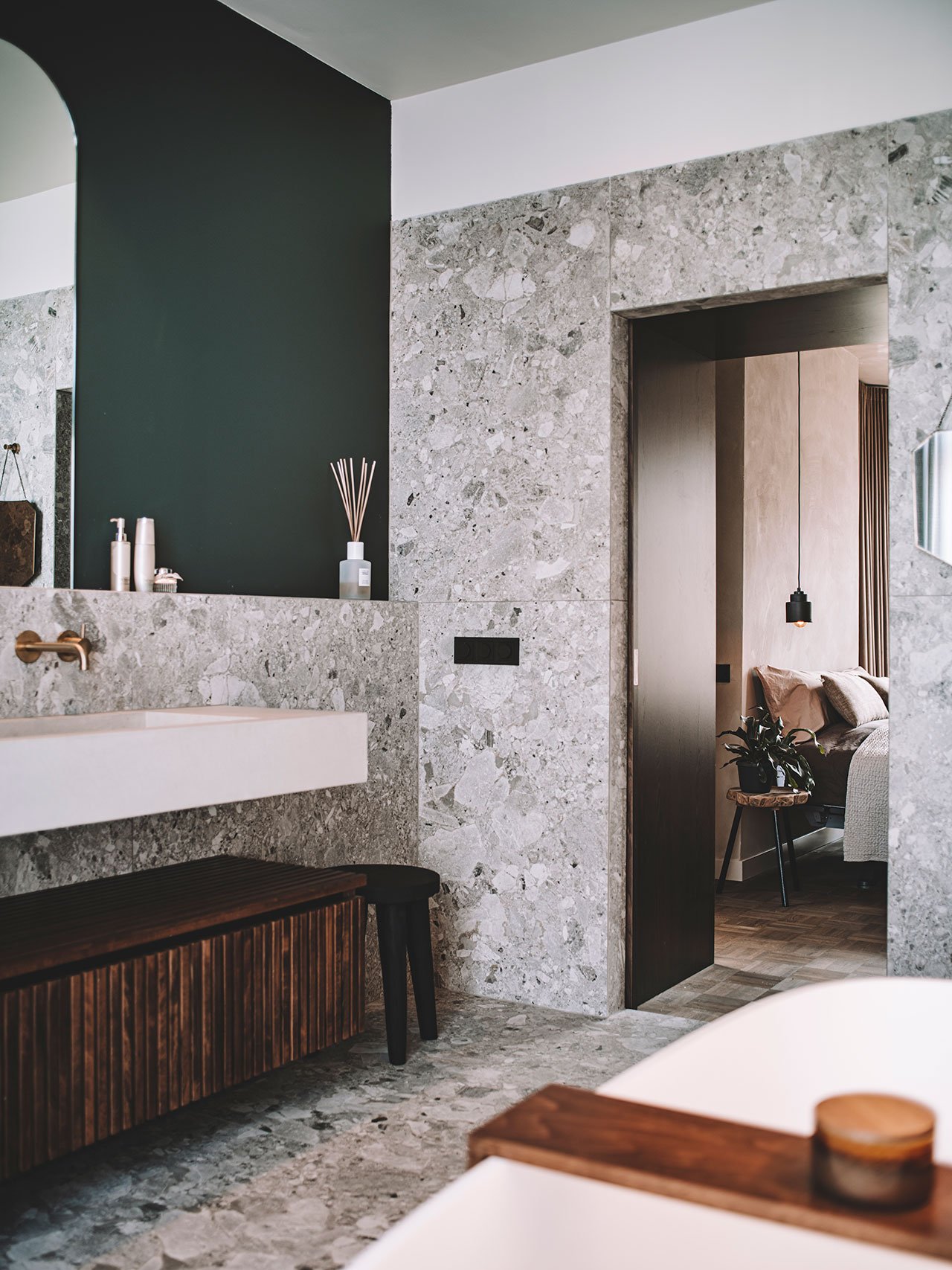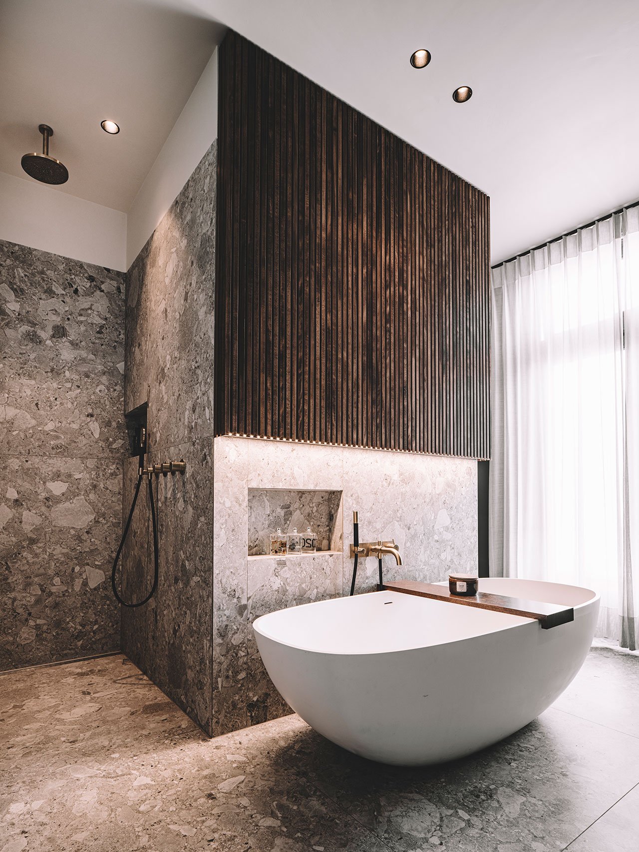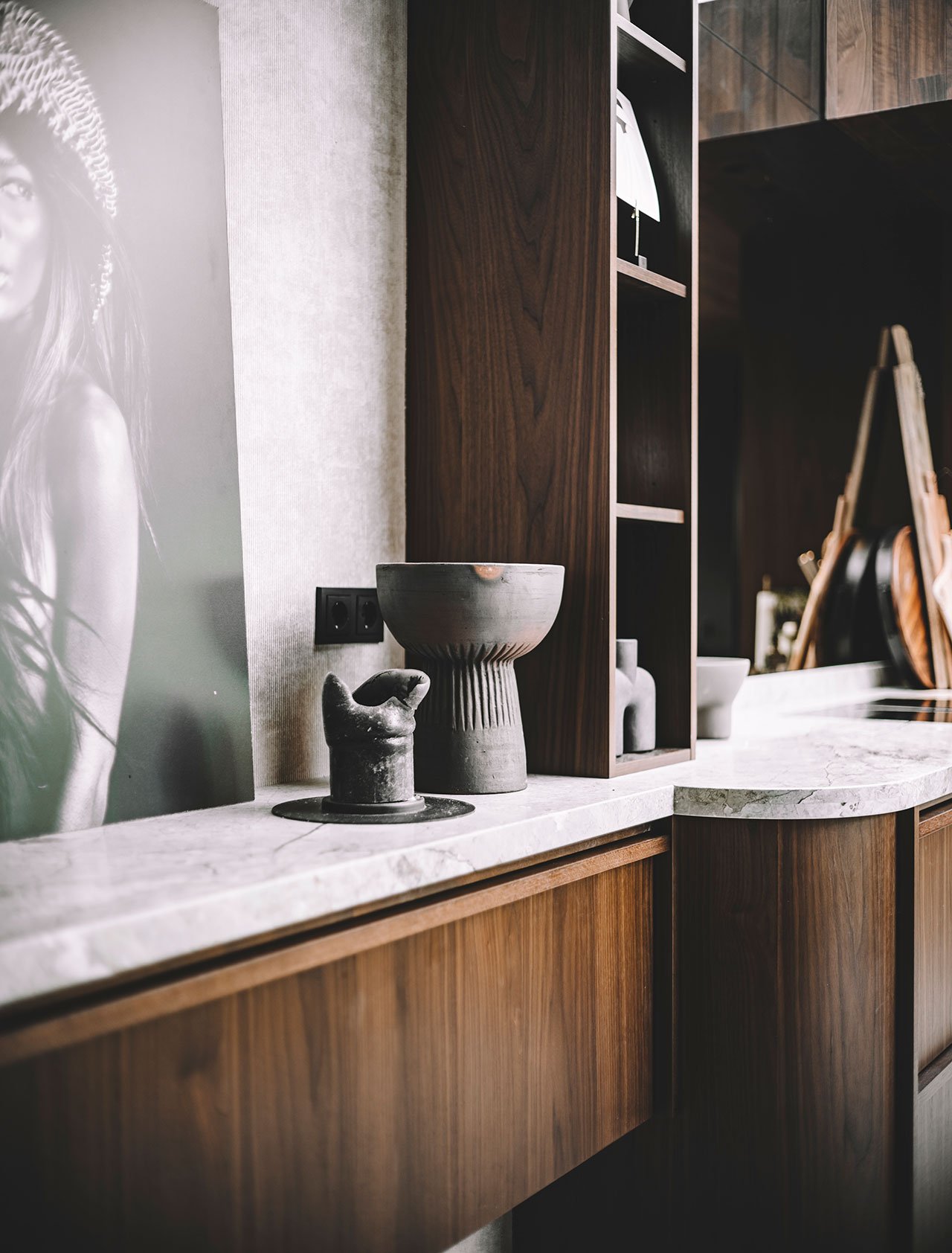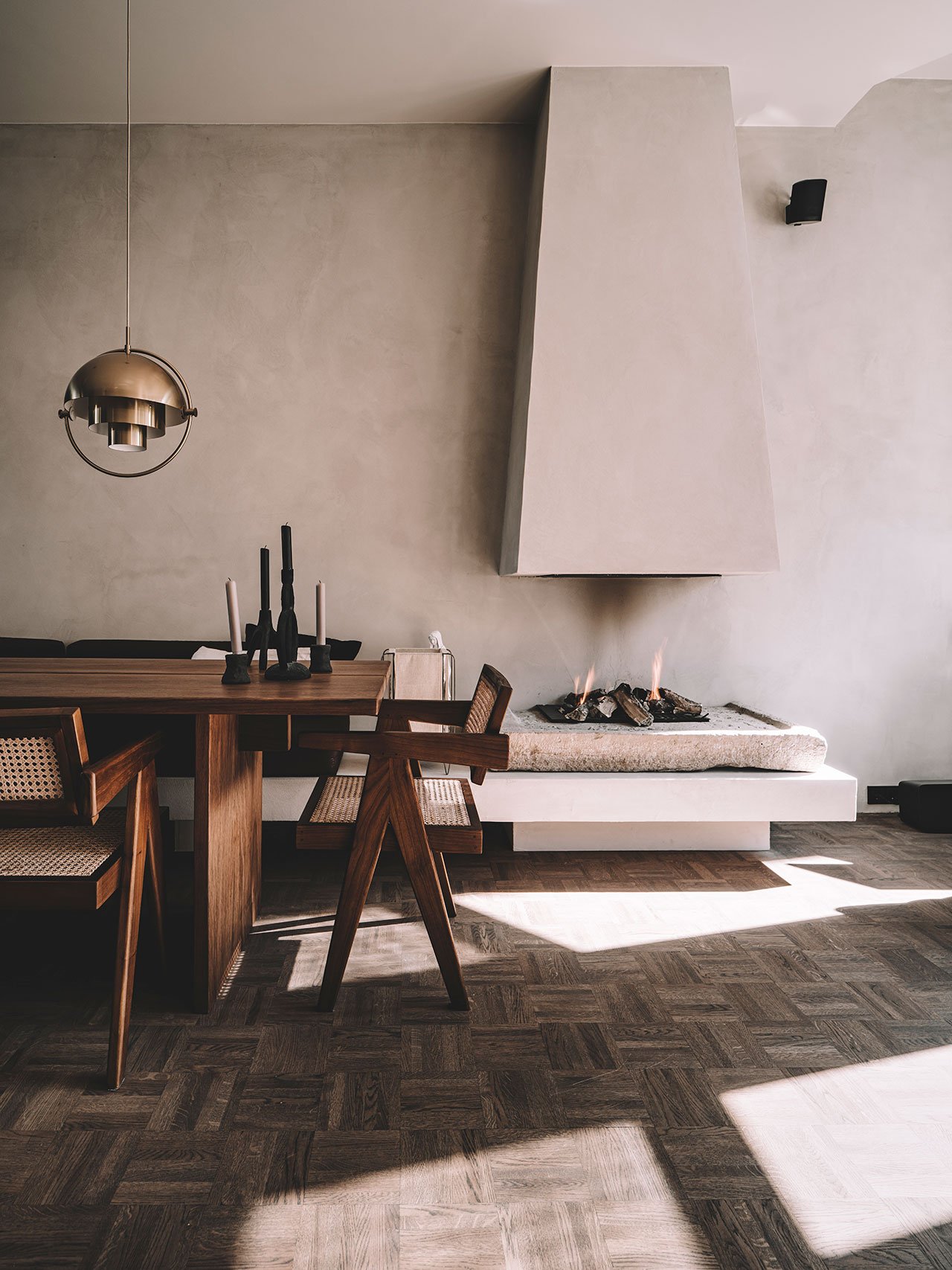 거실공간에 적용된 그레이 컬러와 베이지컬러 그리고 무광 콘크리트 바닥과 플라스터 마감재는 내부 이미지를 촉감적인 아름다움과 미니멀한 엘레강스로 표현합니다. 맞춤형 월넛가구와 플러시 카펫이 공간에 따뜻함을 더하고 복원된 클래식 디테일이 향수를 불러 일으킵니다.