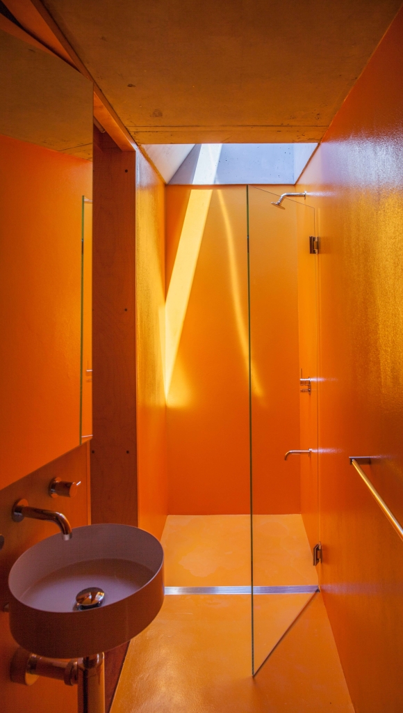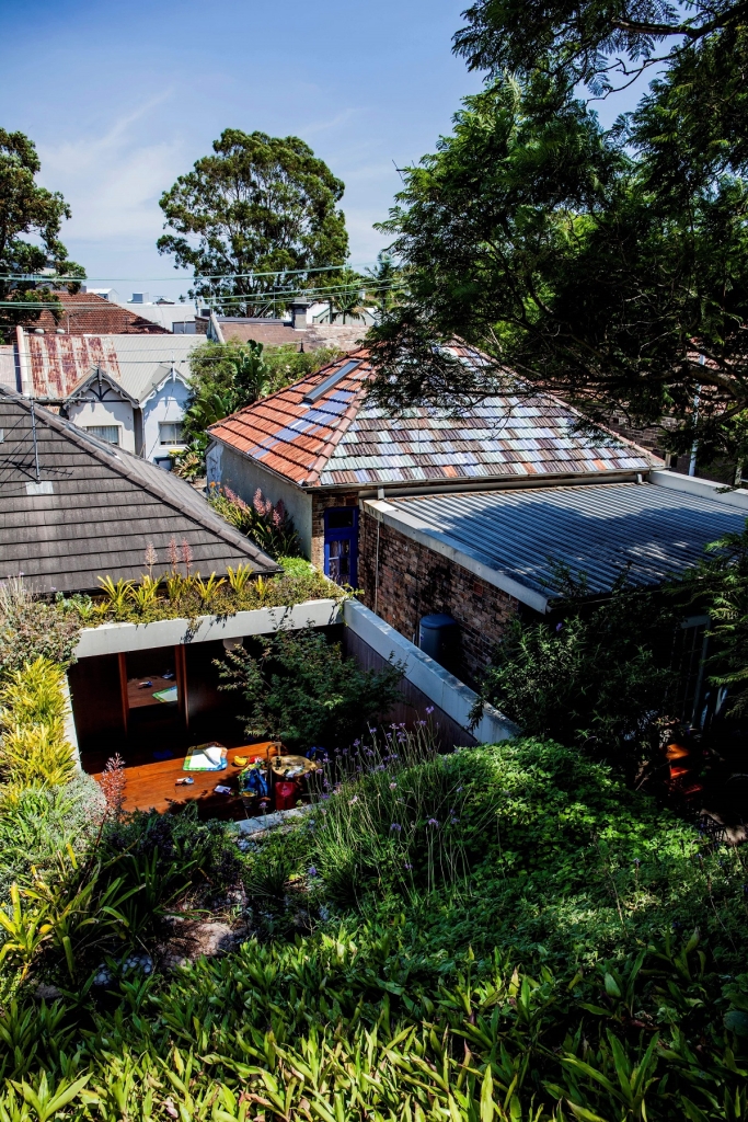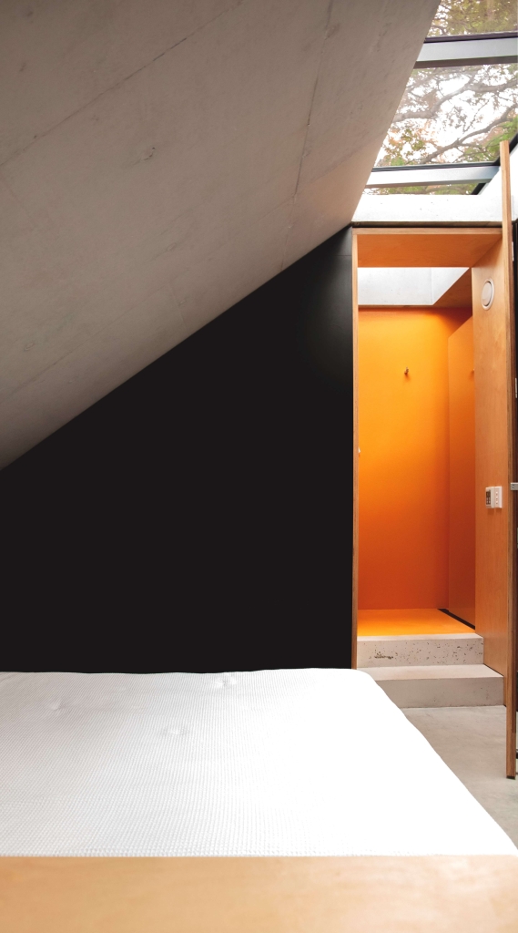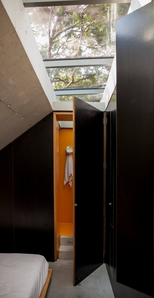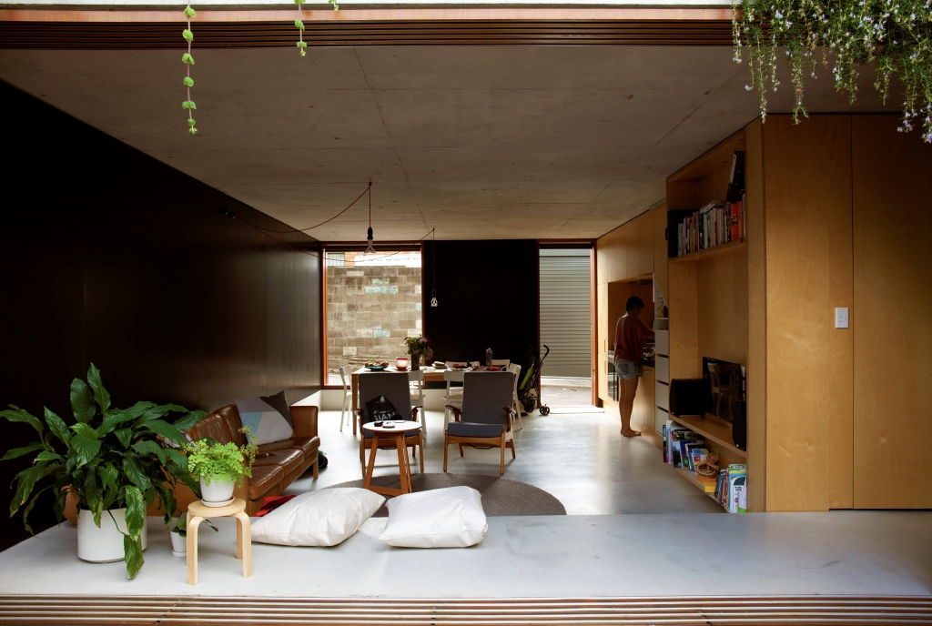 The basic arrangement of the addition –a central courtyard, retention of the primary form of the original semi, a bathroom & laundry slotted into a former access path that no one ever used for access and an addition at the laneway with living areas and a bedroom at the first floor. The living areas, with doors slid open, are as good as outside – an extension of the courtyard and the laneway alike. The first floor bedroom has no windows except to the sky and the tangle of trees – a special hidden room. The long section of the house most clearly demonstrates the basic diagram – the original primary form kept intact and the garden roof of the addition sloping down to maintain morning sun to the central courtyard. The garden – the roof over the first-floor bedroom – softens everything and cools everything down making the most of the potential to provide more vegetation than we started with for the benefit of the owners, neighbours and the environment more broadly. The walls to the addition are lined with form-ply, pre-finished, running inside and out, tracing the outline of a bigger room and lending an appreciation of a larger area on an otherwise very small lot. The builder on this project was selected prior to lodging the DA. We worked through material selections and details together as a team. By way of example on the process, when we lodged the DA the ground floor walls of the building were brick, the first-floor framing timber and the first floor clad in steel sheet. Through design development, with aircraft noise provisions to be addressed and after checking-in with the builder, the floors, walls and roofs of the addition were all changed to in-situ concrete – one primary subcontractor removing the need for multiple trades. Likewise the construction details are simple and repeated. The building costs – $320,000 for the contract, $400,000 all up. This amounts to around $2,900/sqm if you take the whole area of the house into account. When you consider that builders these days suggest $5,000/sqm as a starting price and $8,000+/sqm wouldn’t be uncommon among the architect-designed projects, it’s clear in this project that we’re talking about something else. We worked hard with the clients and the builder to bring the costs down to something more affordable.