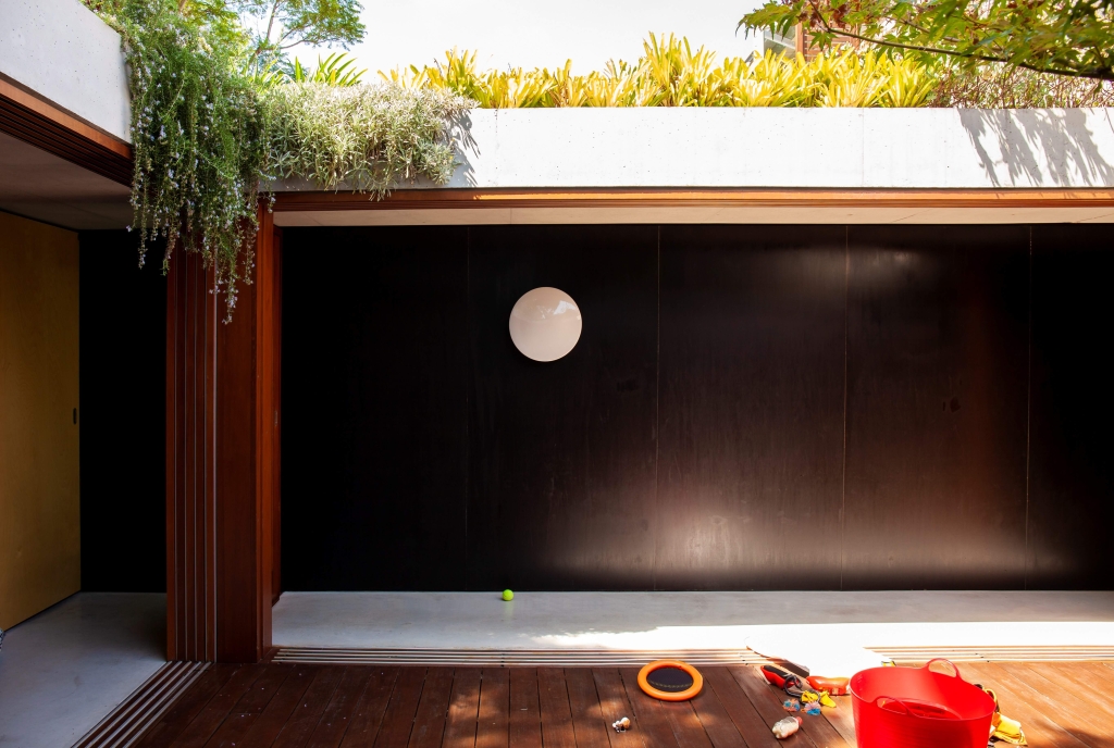 The basic arrangement of the addition –a central courtyard, retention of the primary form of the original semi, a bathroom & laundry slotted into a former access path that no one ever used for access and an addition at the laneway with living areas and a bedroom at the first floor. The living areas, with doors slid open, are as good as outside – an extension of the courtyard and the laneway alike. The first floor bedroom has no windows except to the sky and the tangle of trees – a special hidden room. The long section of the house most clearly demonstrates the basic diagram – the original primary form kept intact and the garden roof of the addition sloping down to maintain morning sun to the central courtyard. The garden – the roof over the first-floor bedroom – softens everything and cools everything down making the most of the potential to provide more vegetation than we started with for the benefit of the owners, neighbours and the environment more broadly. The walls to the addition are lined with form-ply, pre-finished, running inside and out, tracing the outline of a bigger room and lending an appreciation of a larger area on an otherwise very small lot. The builder on this project was selected prior to lodging the DA. We worked through material selections and details together as a team. By way of example on the process, when we lodged the DA the ground floor walls of the building were brick, the first-floor framing timber and the first floor clad in steel sheet. Through design development, with aircraft noise provisions to be addressed and after checking-in with the builder, the floors, walls and roofs of the addition were all changed to in-situ concrete – one primary subcontractor removing the need for multiple trades. Likewise the construction details are simple and repeated. The building costs – $320,000 for the contract, $400,000 all up. This amounts to around $2,900/sqm if you take the whole area of the house into account. When you consider that builders these days suggest $5,000/sqm as a starting price and $8,000+/sqm wouldn’t be uncommon among the architect-designed projects, it’s clear in this project that we’re talking about something else. We worked hard with the clients and the builder to bring the costs down to something more affordable.