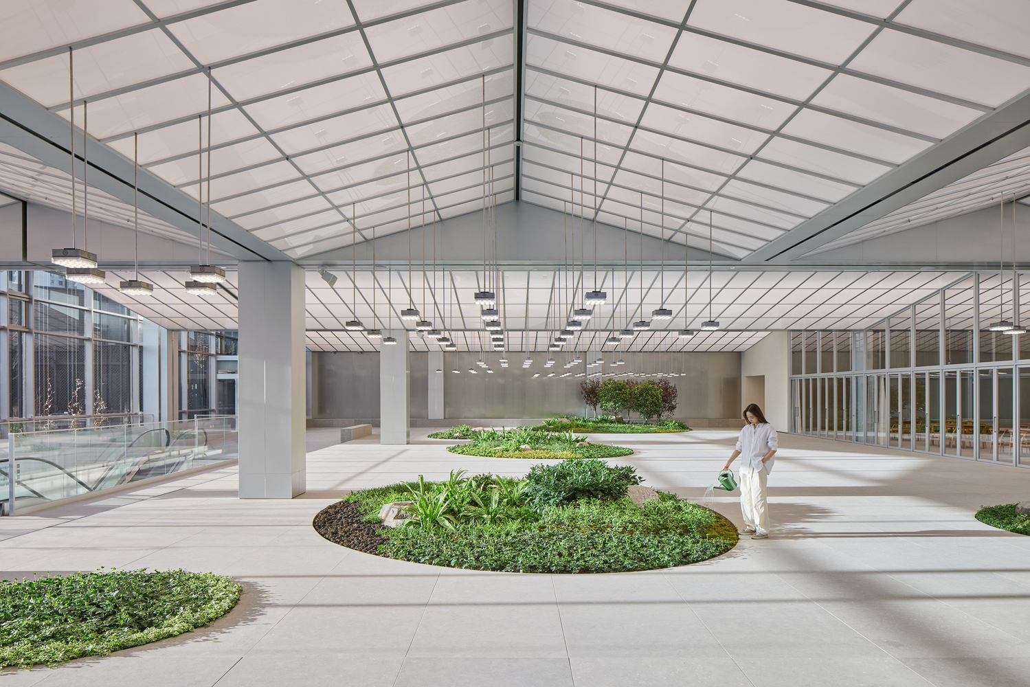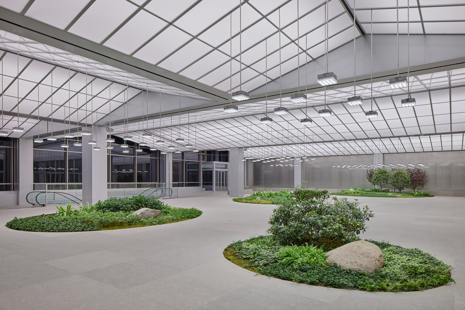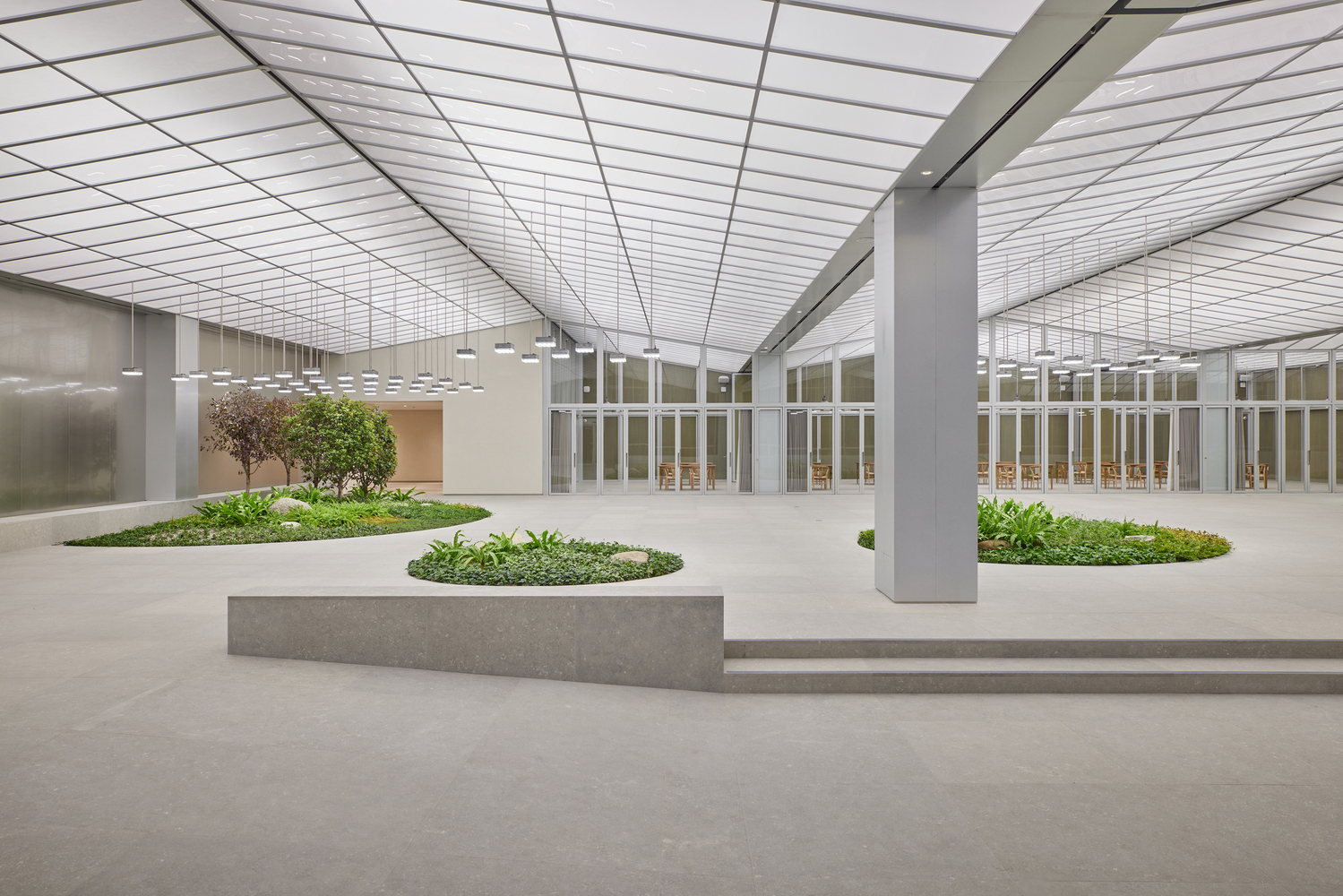 서울 현대백화점 목동점에는 미니멀리즘을 추구하는 ‘글래스 하우스 가든 룸’이 위치합니다. 정적인 오픈플랜 속에 자연적인 조경요소를 배치함으로써 쇼핑객과 방문객들에게 고요한 공간과 사색을 할 수 있는 시간을 선물합니다.The Hyundai Department Store Mokdong in Seoul features the world's most famous luxury brands. While one’s senses are challenged in the shopping sections below, the top floor offers a space to rest. The minimalist “Glass House Garden Room” offers a place of tranquillity for shoppers and visitors. It serves as the entrance floor to the surrounding residential towers and can play host to events and exhibitions. The space is visually broken up by islands of green plants that are embedded in the floor. A swarm of plant-friendly LED lights is placed above each island, which is intended to promote both human and plant well-being.