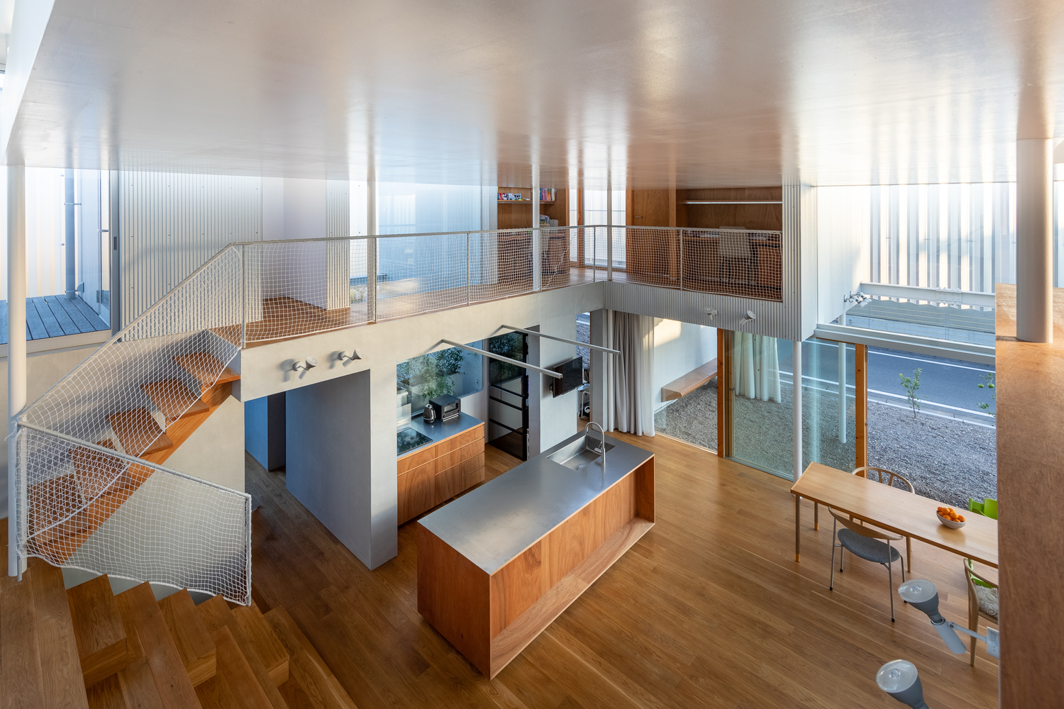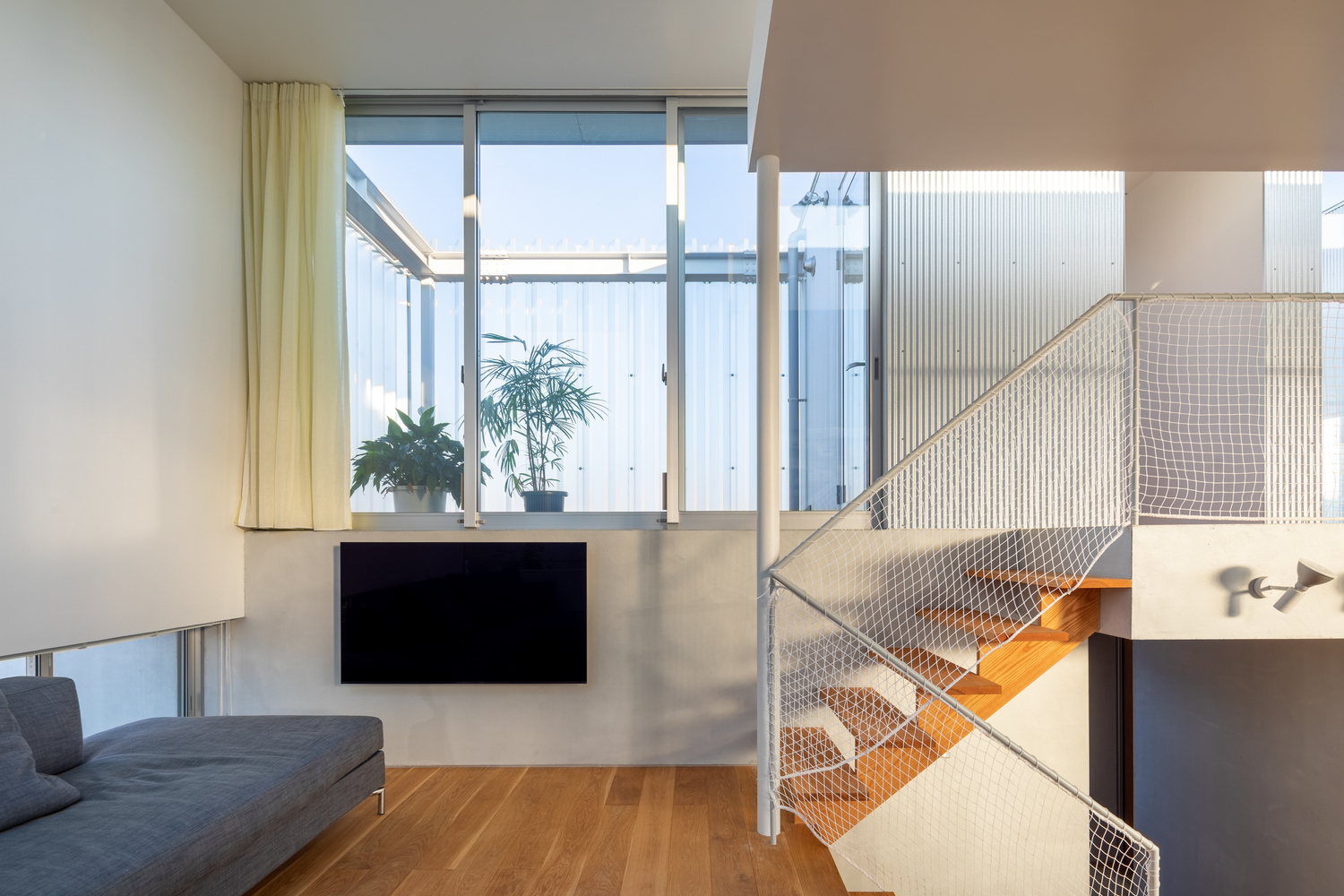 The private house for the family of four which is located in residential area in Japan. We create a generous outline by erecting a translucent polycarbonate enclosure along the property to separate it from the surrounding areas and making it float in the air. The floating enclose creates separation, but since it floats, the house itself is still connected to the surrounding environment.
