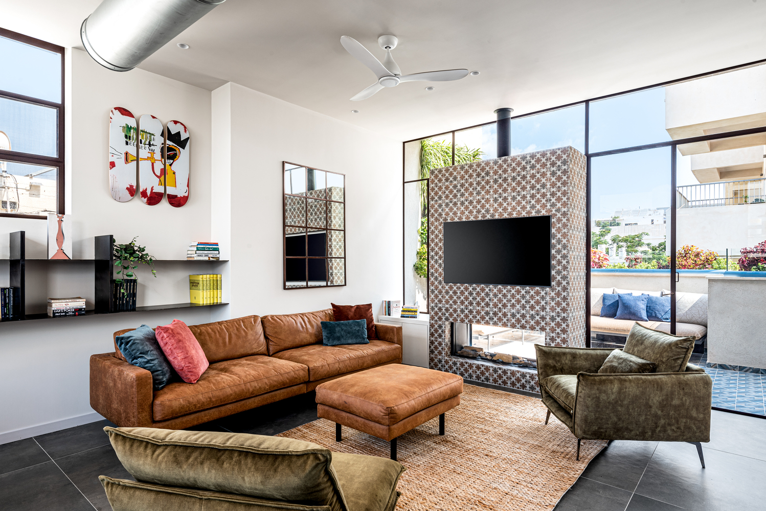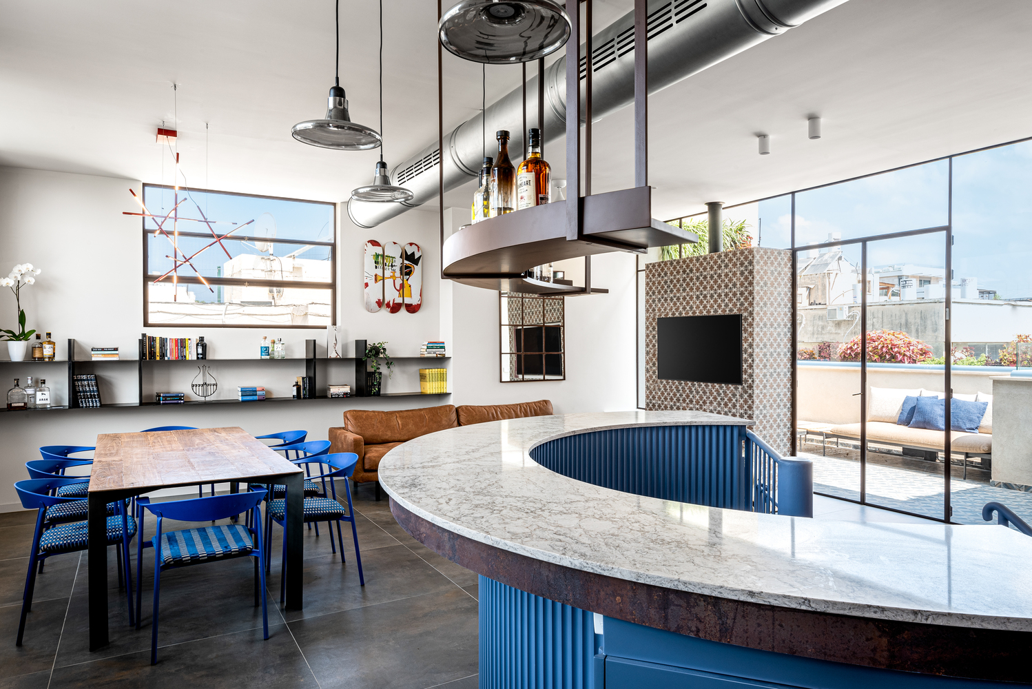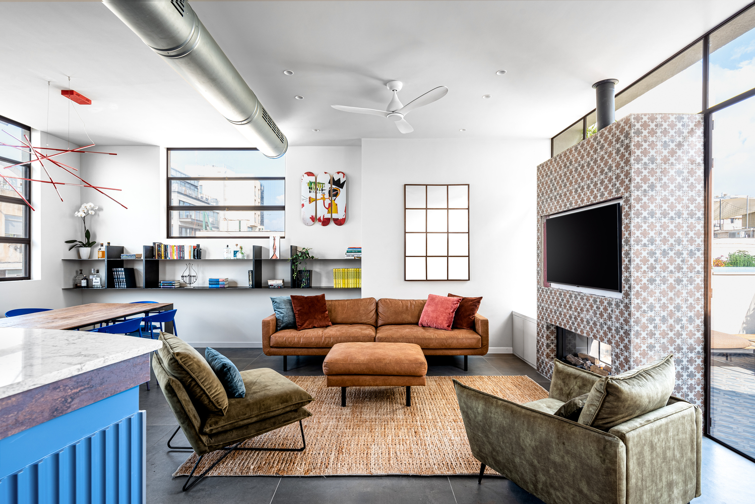 Three apartments converted into a unique 140 square meter duplex in Jabotinsky Street, central Tel Aviv. A stylish bachelor pad for a new immigrant, and provide a holiday home for his extensive family visiting regularly from London