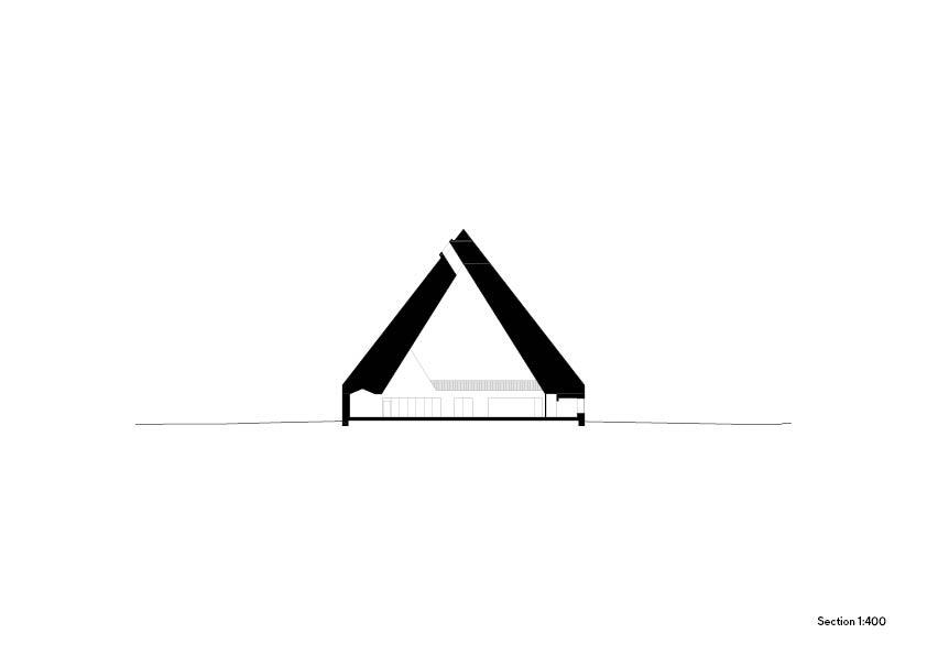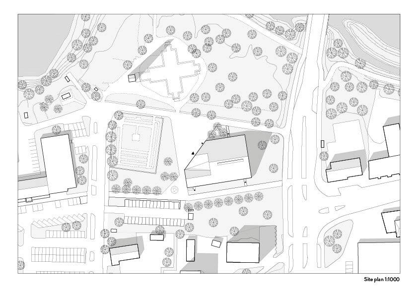 Of these, the mass of the entrance lobby is beveled diagonally, forming a natural entry plaza together with the war graves and the ruins of the old church. The form of the new church is a natural continuation of the Finnish church-building tradition.