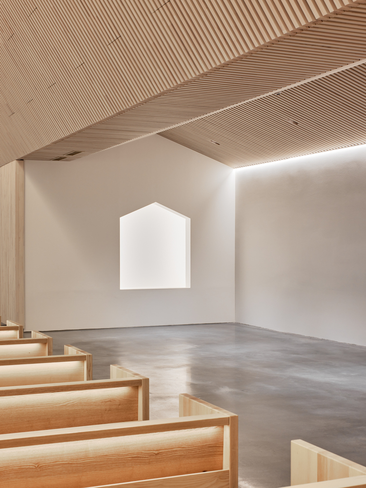 교회홀에 마감된 목재는 내부공간을 따뜻하게 연출합니다. 박공지붕의 능선을 따라 설치된 채광창 또한 공간 내부로 자연광을 유입시키며 부드러운 공간의 이미지를 연속시킵니다. 이렇게 전통적인 건축의 양식은 현대적인 교회에서도 연속됩니다.