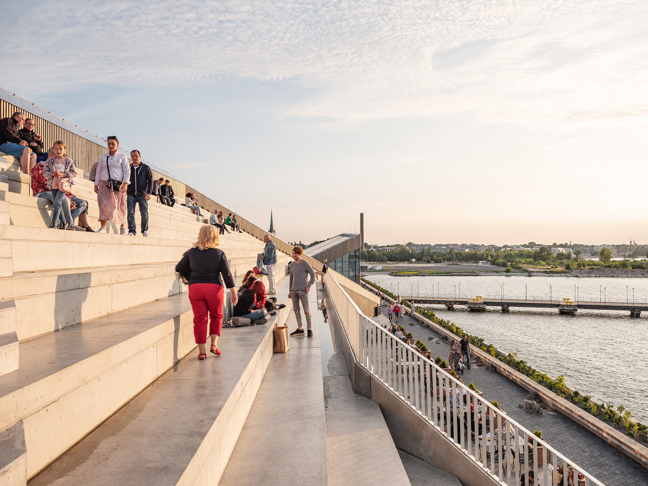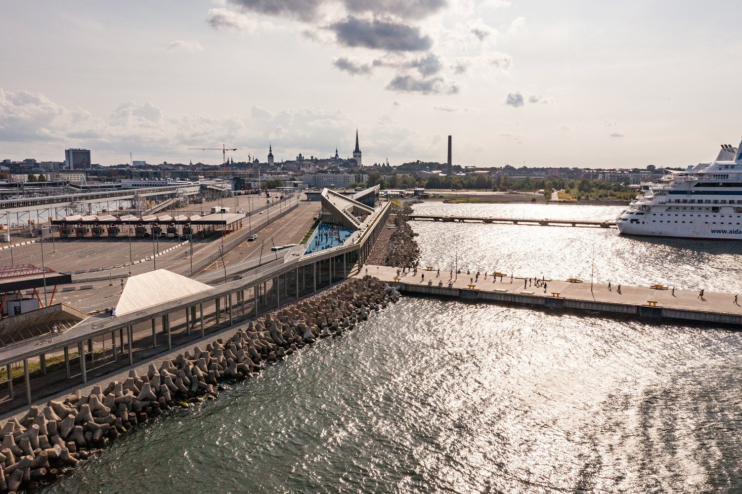 Functionally, the complex is divided into two the lower level accommodates areas intended for cruise tourists and on the upper level there is a promenade open to the public. The entrance to and the exit from the terminal runs along with the street level through a sloped park with vegetation characteristic to the northern coast of Estonia. Along the gently inclining planes, the street takes the citizens above the terminal.