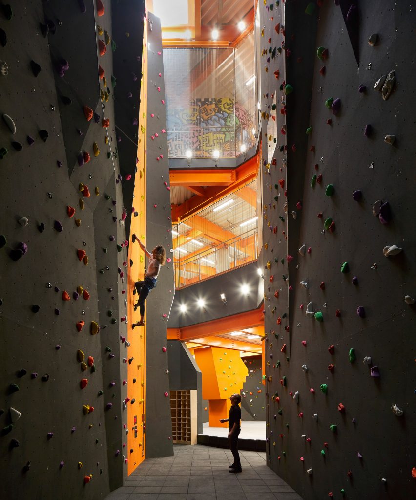 The building also contains a 15-metre-high climbing wall, a boxing ring and a ground-floor cafe.