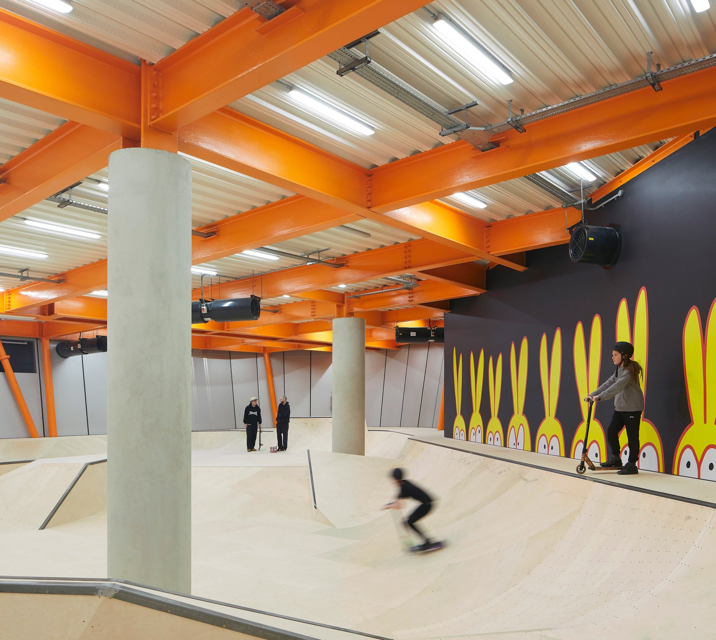 Despite being raised off the ground, its three skate floors provide state-of-the art facilities for skateboarders and BMX riders, including huge concrete bowls and multi-level landscapes.