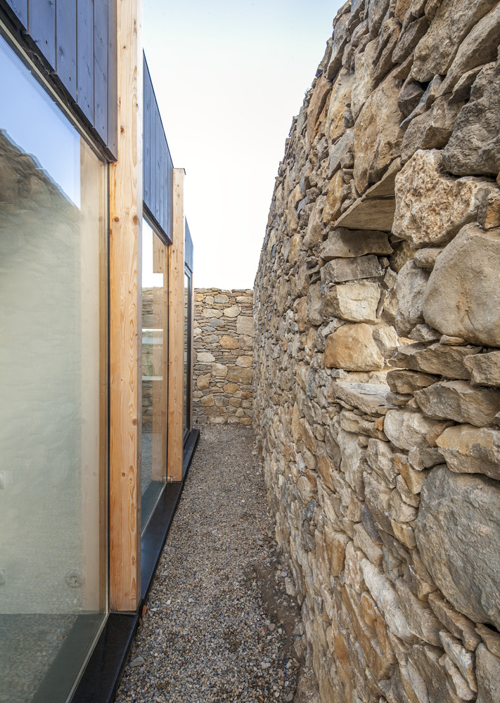 In reality, everything is explained in a small 80cm offset that separates the traces of the old building from the new one. The subtle dislocation avoids taking off the old construction in the execution of the new one. It allows for stability by giving space to a dry stone backing, which uses loose rocks from the excavation of the exposed slab. But above all, it forces us to constantly wander between limits that indeterminate the presence of both realities. In the same direction, 11 prefabricated wooden pillars are placed on the base, parallel to the existing wall.