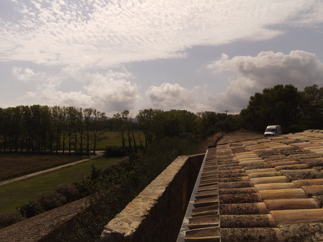 We are in Baix Empordà. On top of a small cliff, overlooking a set of fields full of sunflowers. Facing the sea, strongly stalked by the Tramontana winds. Behind an old wall of a house, which guards its farmhouse and annex territory in ruins.