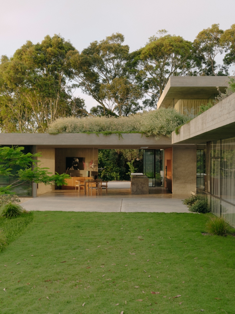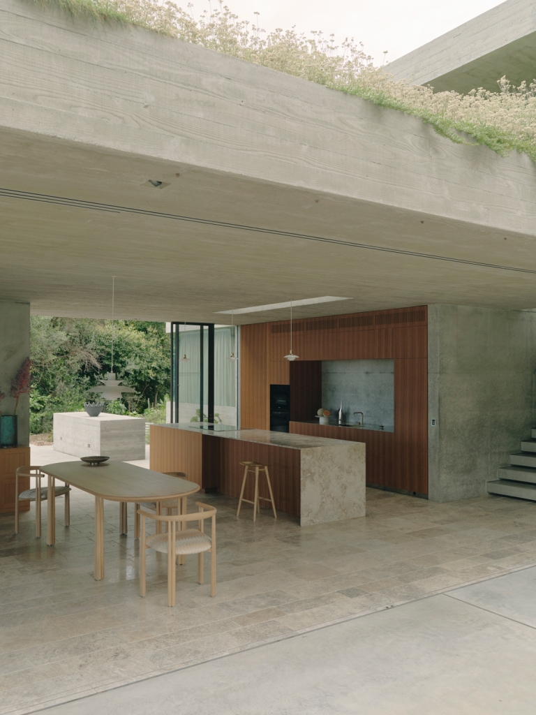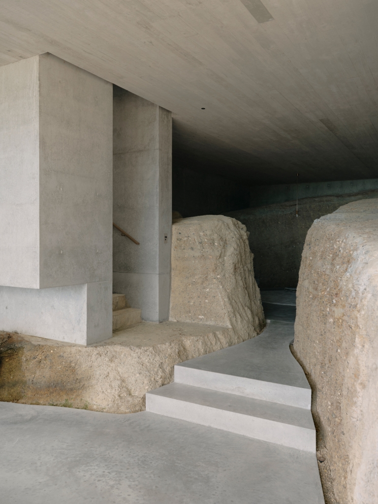 The use of concrete and the bunker precedent also provided the basis for a practical response to the threat of severe weather and bushfires that affect the area. The challenge was to design for a high degree of resilience without creating oppressive or cramped interior volumes that shut down connections with the surrounding landscape. Yet, while Bunkeren is clearly shaped by its context and the specific interests and needs of its occupants, it also extends a series of existing threads within James’s body of work. Over the last 20 years, and while resisting a singular architectural style, his practice has interrogated the idea of building as landscape and the thermal and experiential dimensions of partially buried space. In this sense, the grown-over bunkers of Bunkeren continue the geologically focused approach of projects like the Miura Fold House in Wanaka and the Croft House near Inverloch.