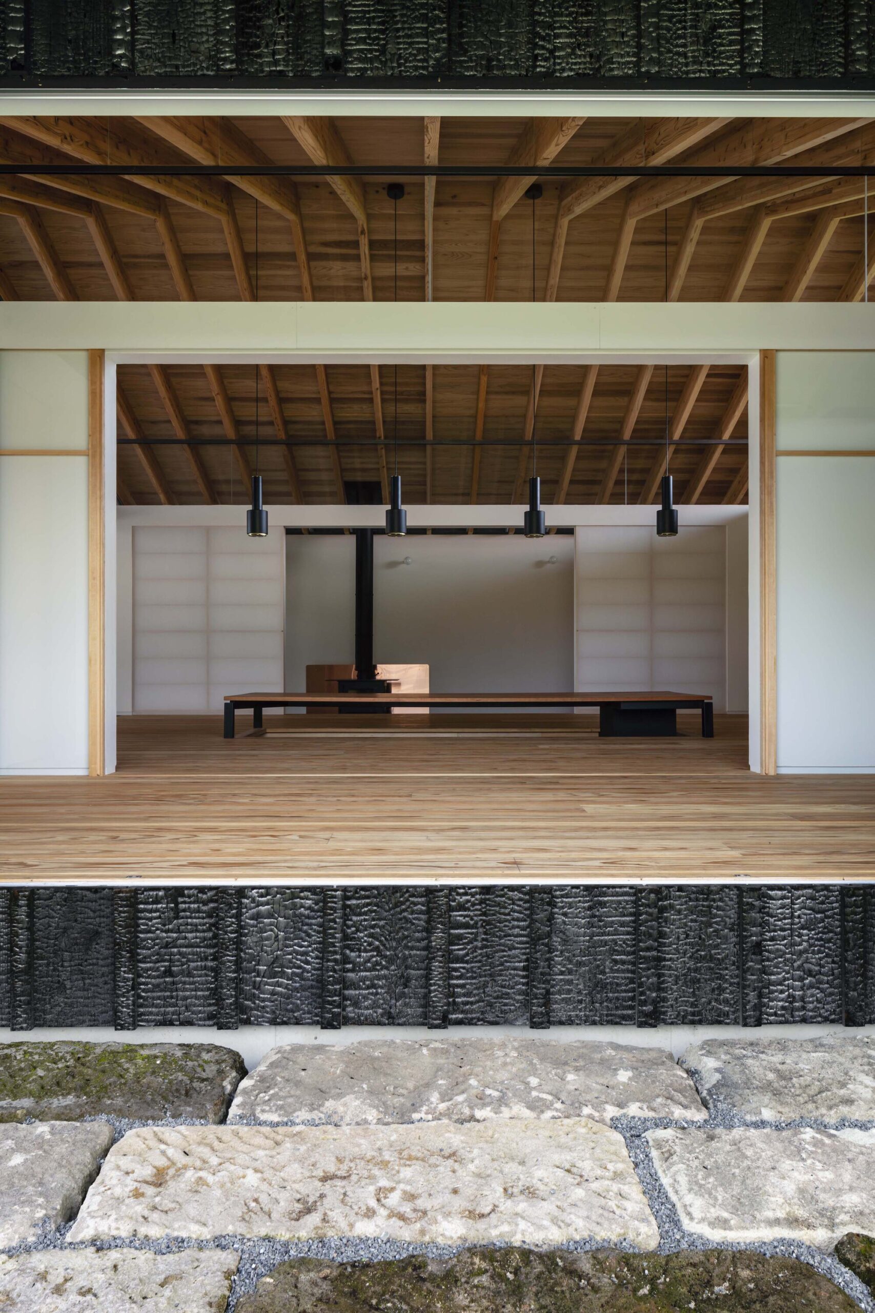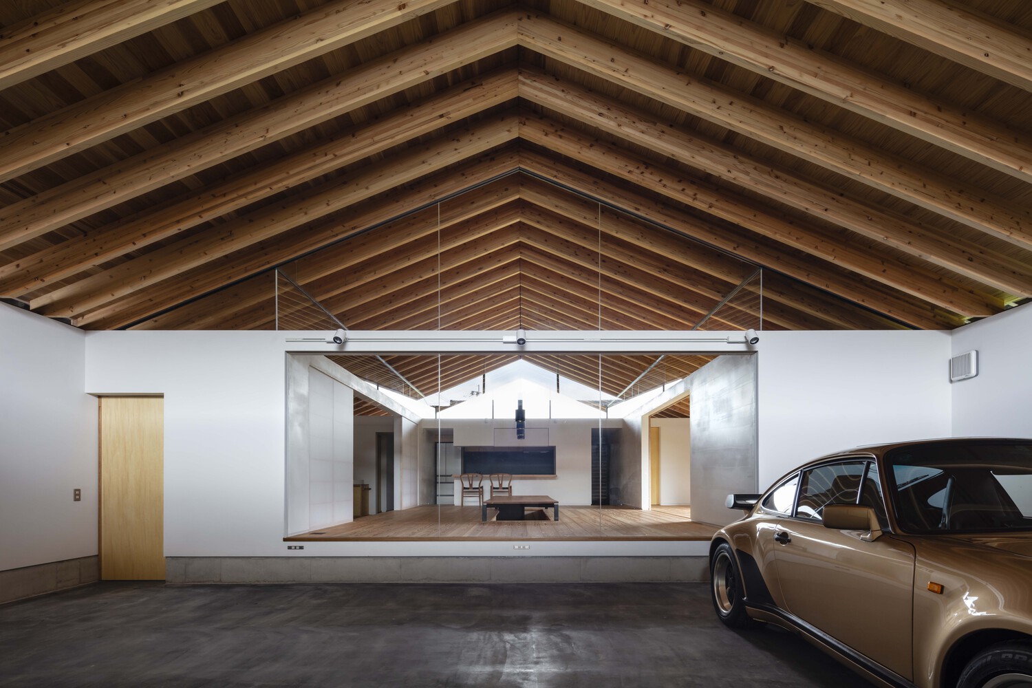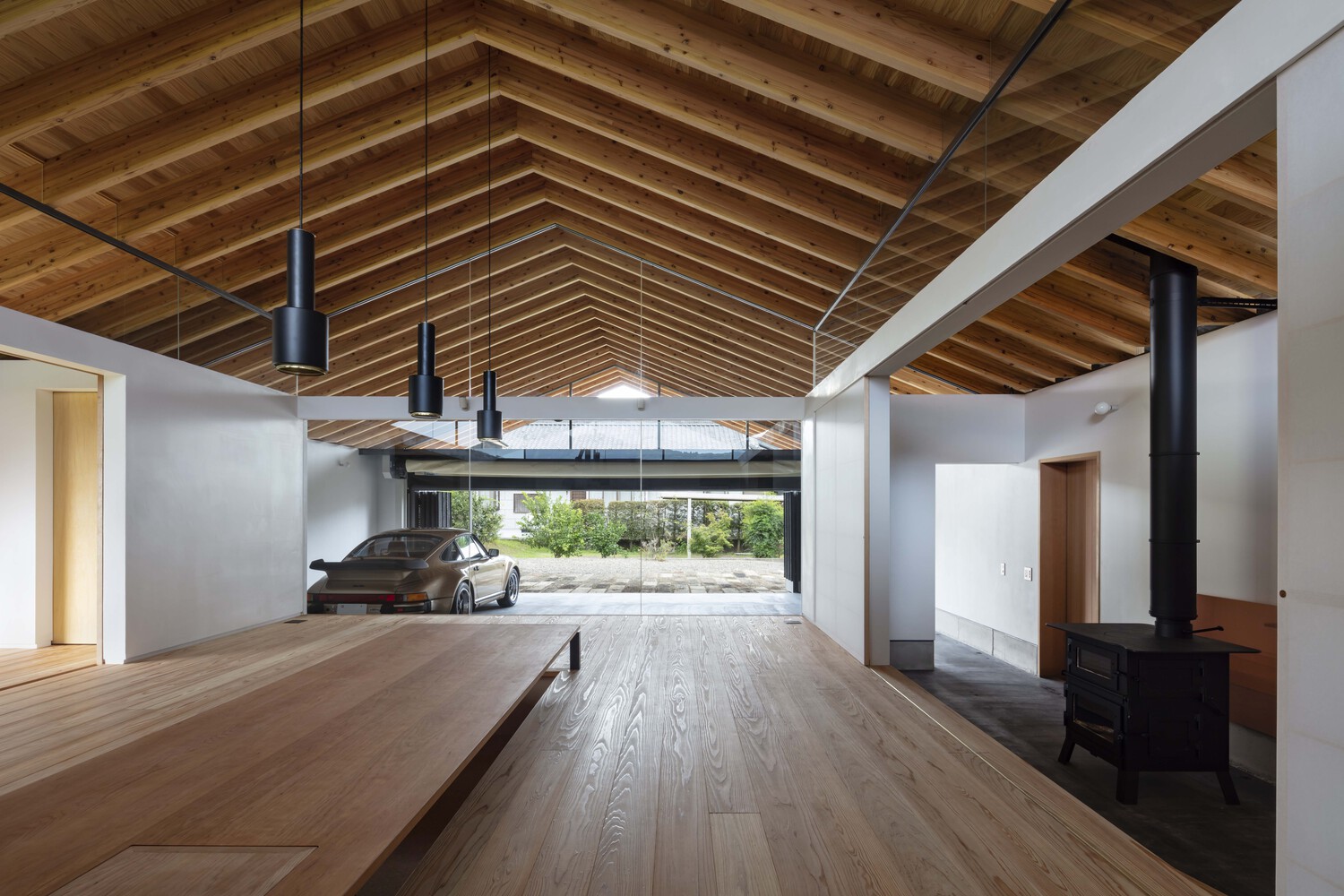 Weekend House in Kirishima is a minimal residence located in Kagoshima, Japan, designed by EAL. The living space is only one-third of the total floor area and the multi purpose garage and storage account for the rest. So, this house is like a small residence built in a large warehouse. It was intended to turn this unusual areal balance to its advantage and consider new solutions for a sustainable building. In a Japanese traditional house, main rooms (e.g., living room, bedroom) were surrounded by non-living spaces such as veranda and attic space. These non-living spaces worked as not only a passage and storage but also a buffer space (air space) in between the outside and living spaces. For instance, a veranda was used to regulate a connection between the outside and inside by opening and closing its fittings in accordance with seasons and time. This is the wisdom incorporated into a traditional Japanese house cultivated before the modern era when no mechanical HVAC system exist. This project aimed to stabilize the thermal environment of the living space by surrounding it with non-living spaces regarded as air space, referring to the traditional wisdom in terms of environmental adjustment.