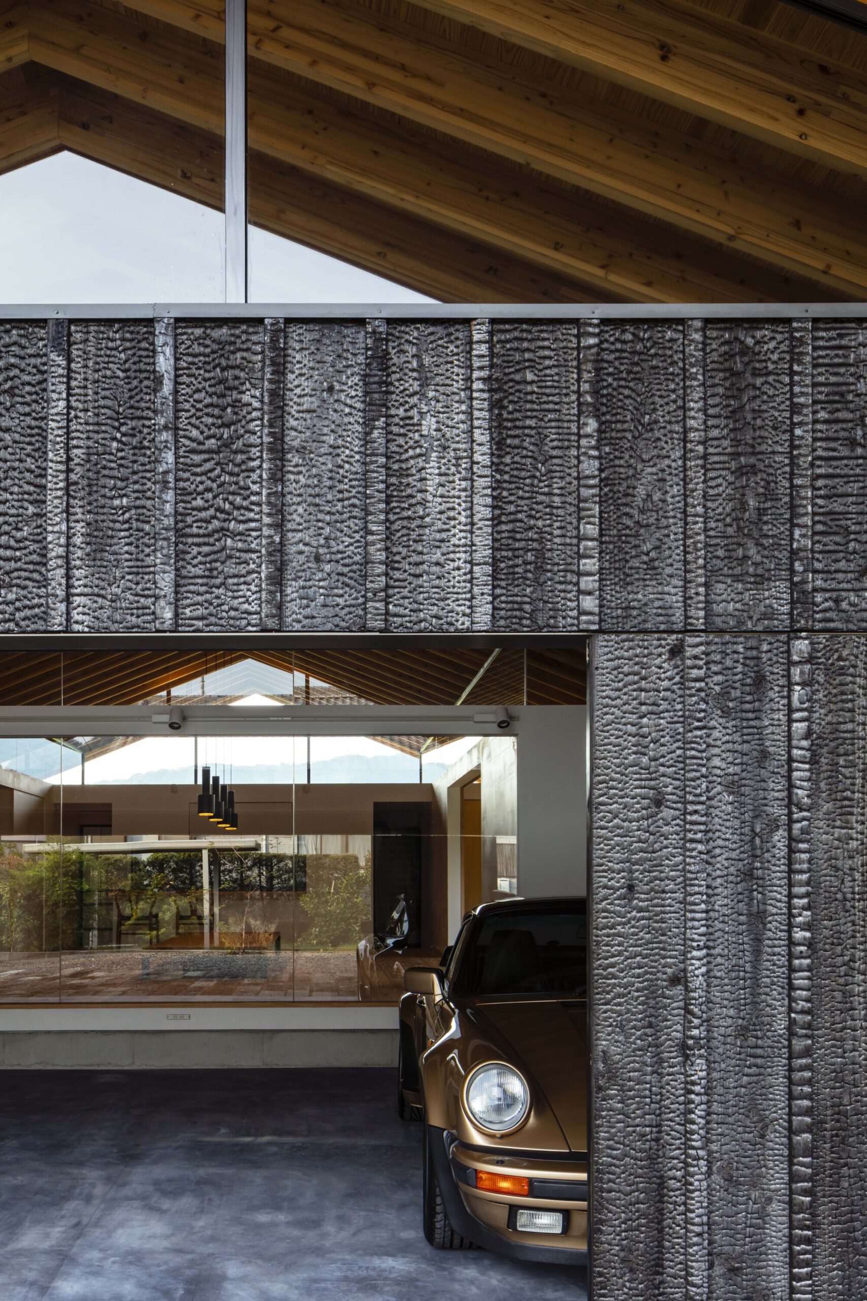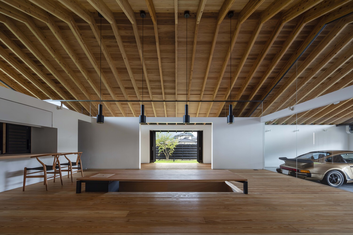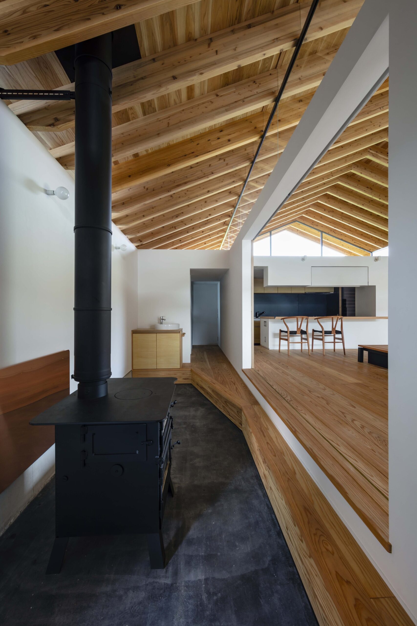 Weekend House in Kirishima is a minimal residence located in Kagoshima, Japan, designed by EAL. The living space is only one-third of the total floor area and the multi purpose garage and storage account for the rest. So, this house is like a small residence built in a large warehouse. It was intended to turn this unusual areal balance to its advantage and consider new solutions for a sustainable building. In a Japanese traditional house, main rooms (e.g., living room, bedroom) were surrounded by non-living spaces such as veranda and attic space. These non-living spaces worked as not only a passage and storage but also a buffer space (air space) in between the outside and living spaces. For instance, a veranda was used to regulate a connection between the outside and inside by opening and closing its fittings in accordance with seasons and time. This is the wisdom incorporated into a traditional Japanese house cultivated before the modern era when no mechanical HVAC system exist. This project aimed to stabilize the thermal environment of the living space by surrounding it with non-living spaces regarded as air space, referring to the traditional wisdom in terms of environmental adjustment.