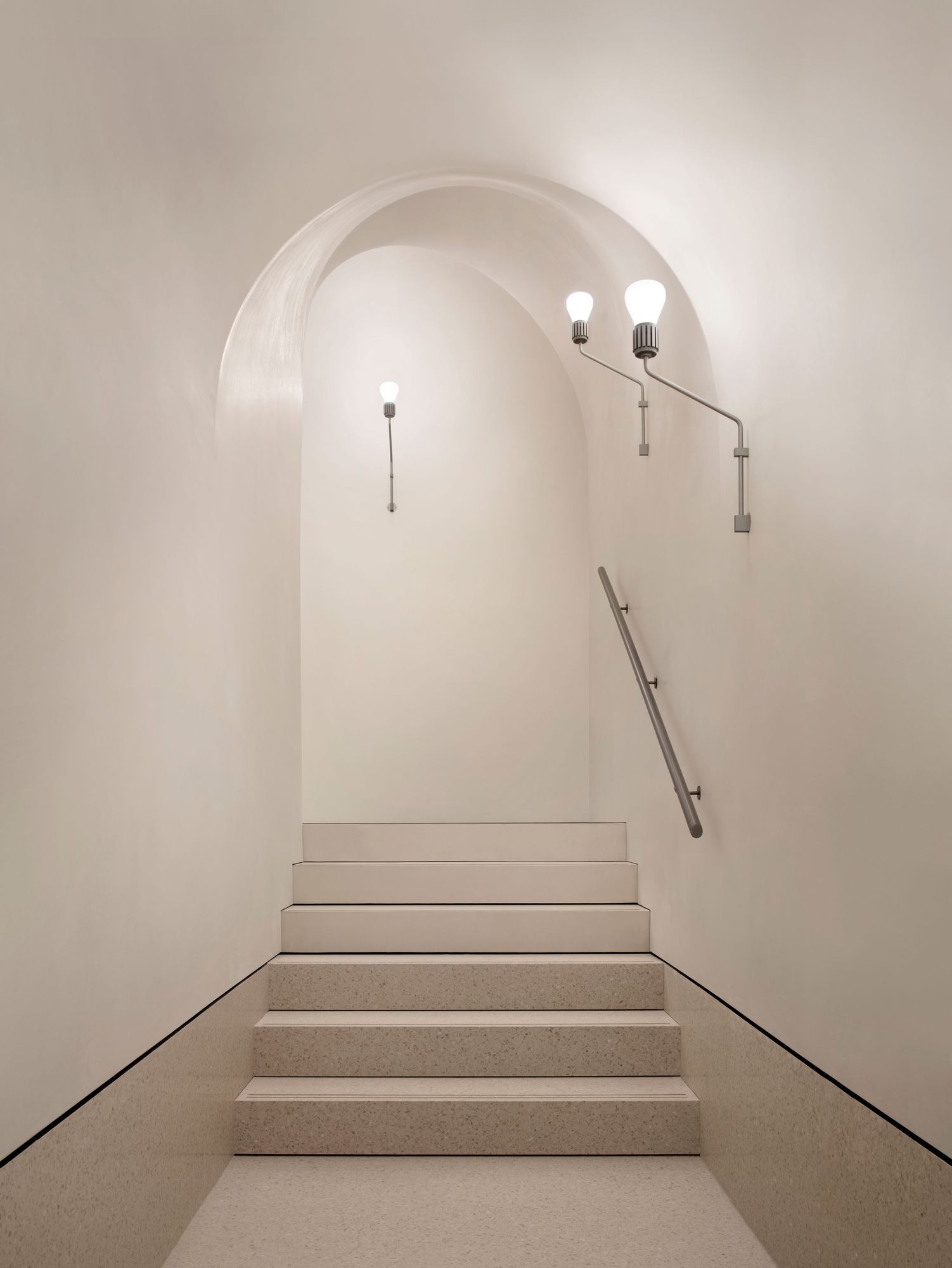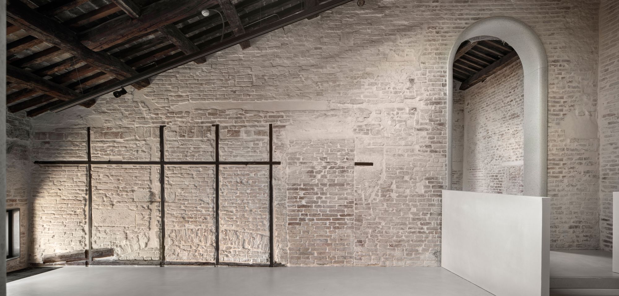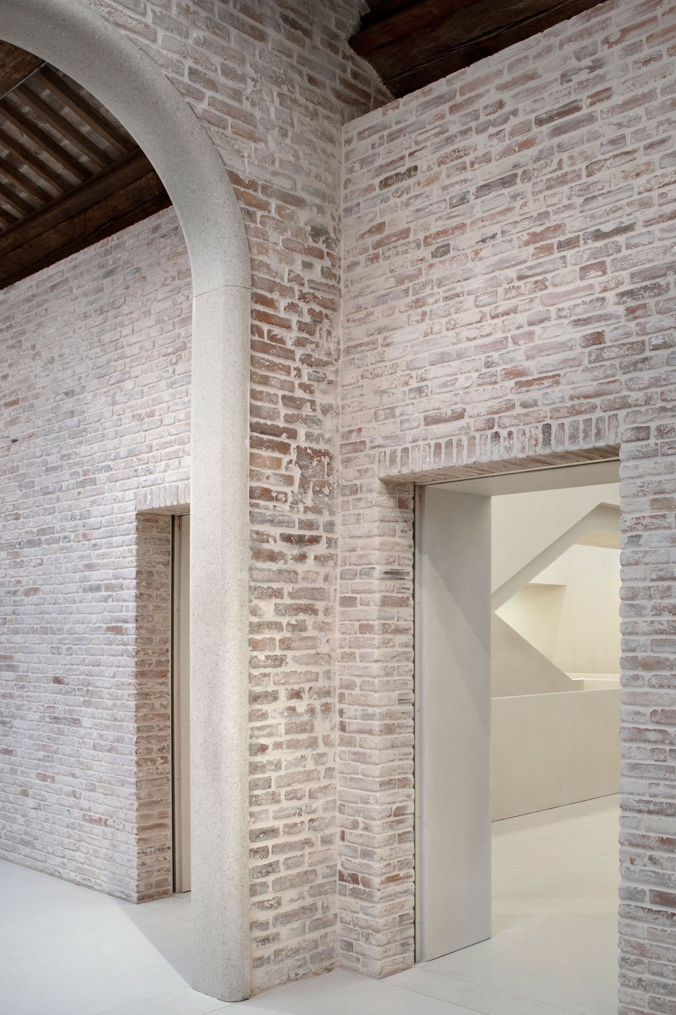 Whether repairing historic fabric or adding new elements, ancient, local and traditional construction techniques and craftsmanship were used to create a material continuity throughout the building and reinforce its integrity. The internal walling is covered in marmorino plaster or finished with scialbatura (slaked lime) giving readability and uniformity to the varied surfaces. For the flooring, pastellone and terrazzo are used, both including the same stone aggregates, while the arches and portals are realized in reconstituted stone. The external walling of the new roof pavilion is coated in cocciopesto plaster, and the terraces covered in recomposed terracotta, creating a dialogue between old and new.