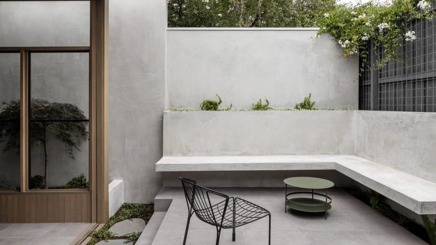 These can be slid back to grant the owners access to a paved garden with an L shaped concrete seat in its corner, which is inset with a greenery-filled planter.