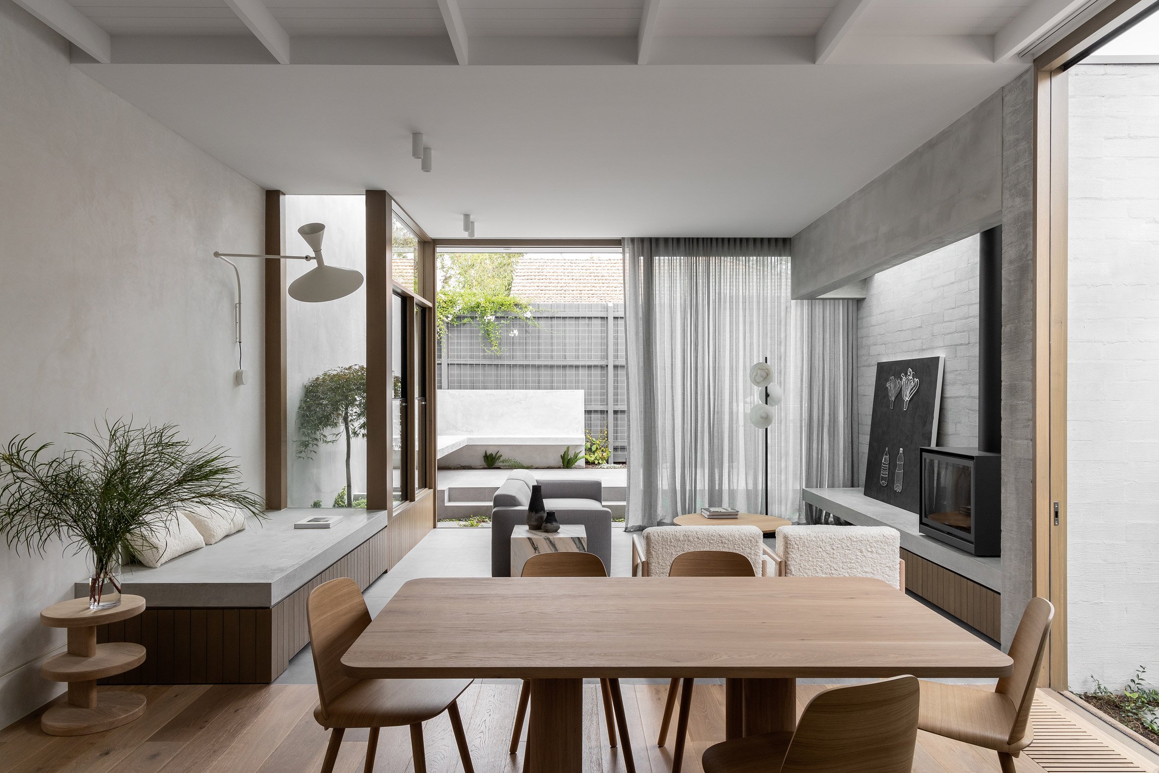 내부공간으로 부터 후정으로 확장되는 거주공간으로 재구성합니다. 멜버른에 위치한 오래된 주택을 새로운 거주환경에 맞도록 고치는 작업은 외부로 분리되었던 마당을 내부공간에서 연속되어 사용할 수 있도록 리노베이션 합니다. 공간 깊숙히 자리한 주방에서 린넨쇼파가 위치한 거실을 통과하면 L 형태의 시트가 후정에 자리한다. 집안 내부의 소통공간으로 사용하는 동시에 다양한 외부활동을 지원하는 장소로 제공됩니다.