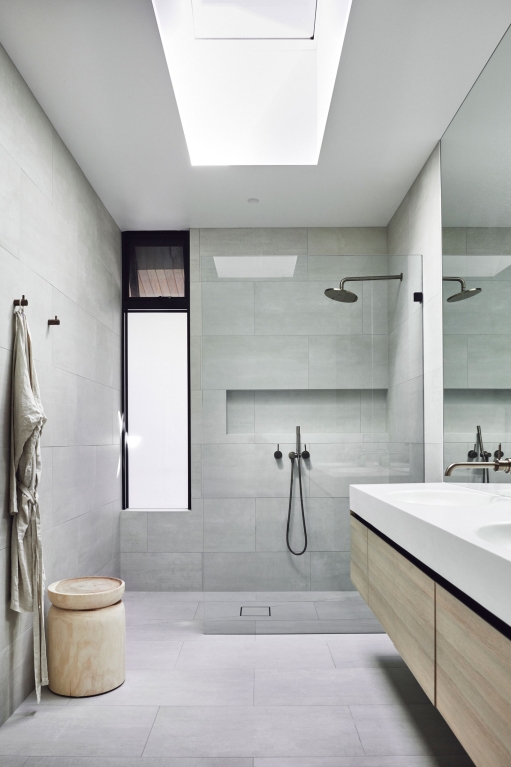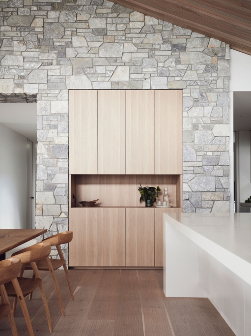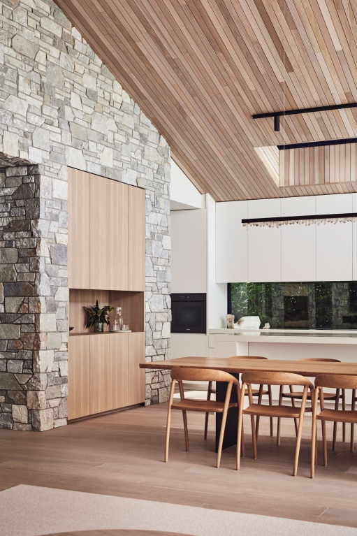 Binding all of the natural and expressive gestures is a sense of restraint used throughout. By extending the ceiling plane upward and utilising the peaked underside of the roof internally, the shared spaces feel larger and more generous; moments of compression in other areas then create a sense of intimacy and match their more passive functions. Throughout, artificial lighting has been reduced where possible, with a focus on bringing natural light in and connecting the interior to the surrounding landscape, both visually and through façade elements that open. While protected and private from the street, the landscape and key vistas are directed to further add to the feeling of seclusion and retreat.