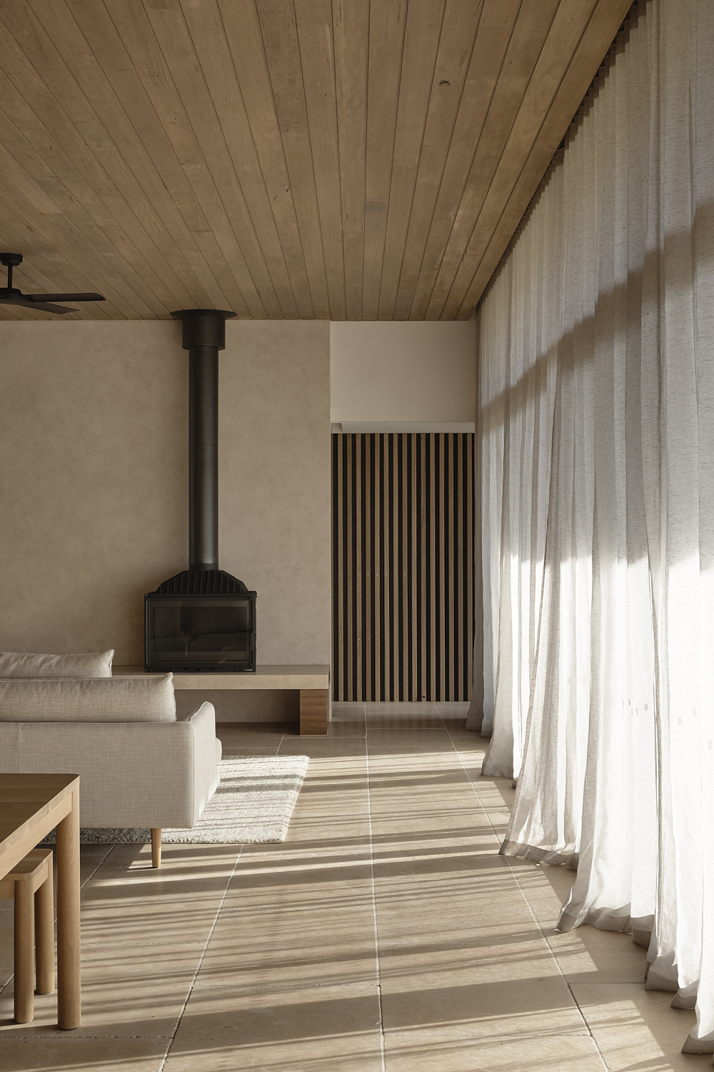 Imagined suiting a number of ages and groupings, the home is generously proportioned at and designed to expand and contract as needed. There are elements that allow the home to be portioned off or segregated, allowing a thermal concentration and the use of less energy for heating and cooling. The extensive use of rammed earth becomes a celebration of its composition, with markings and formwork left untouched as a reminder of process and of its coming together on site. Although crisp edges and concealed joinery and storage allude to a formality, the open nature of the home and the circulation capture a more casual and laidback heart.
