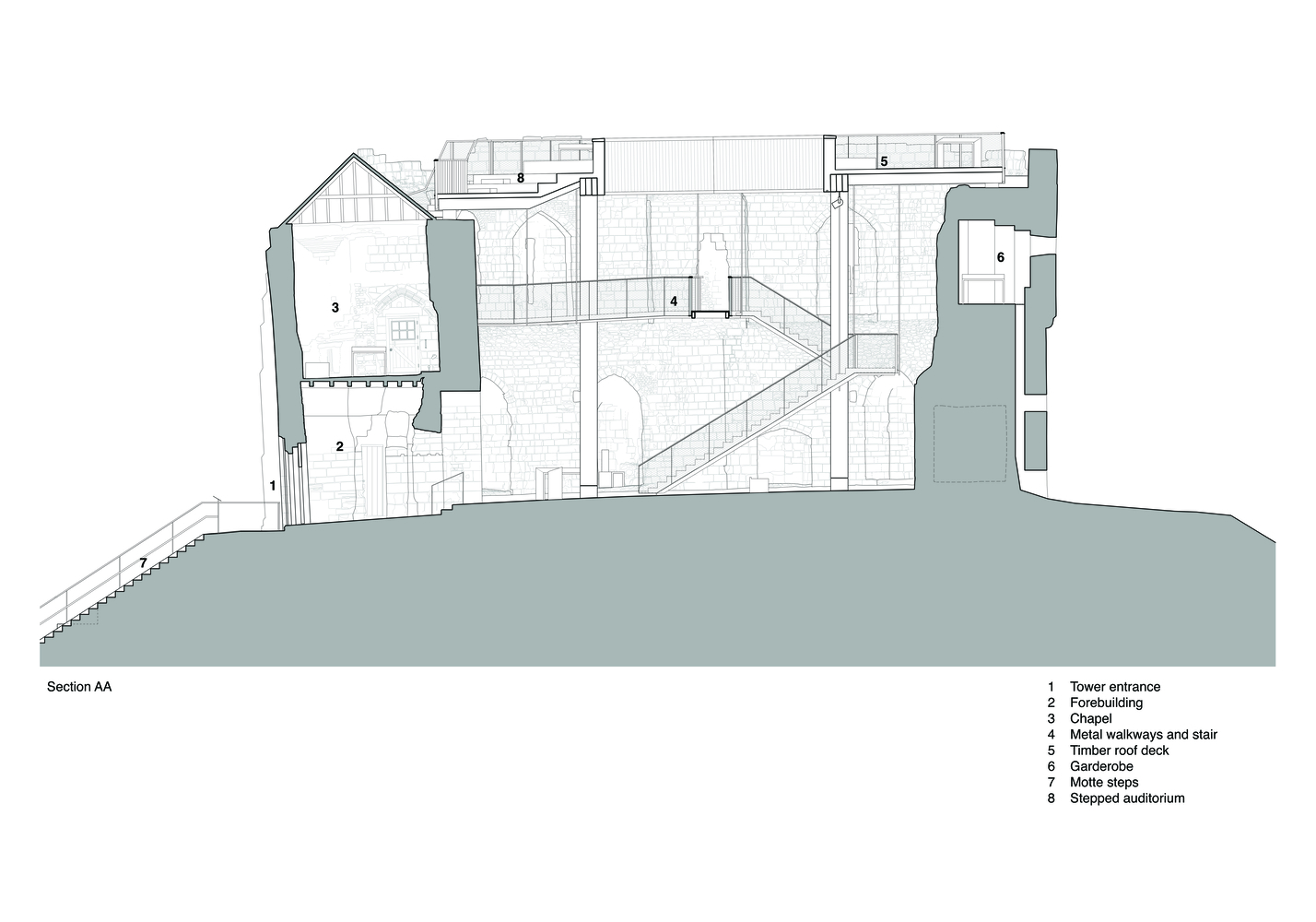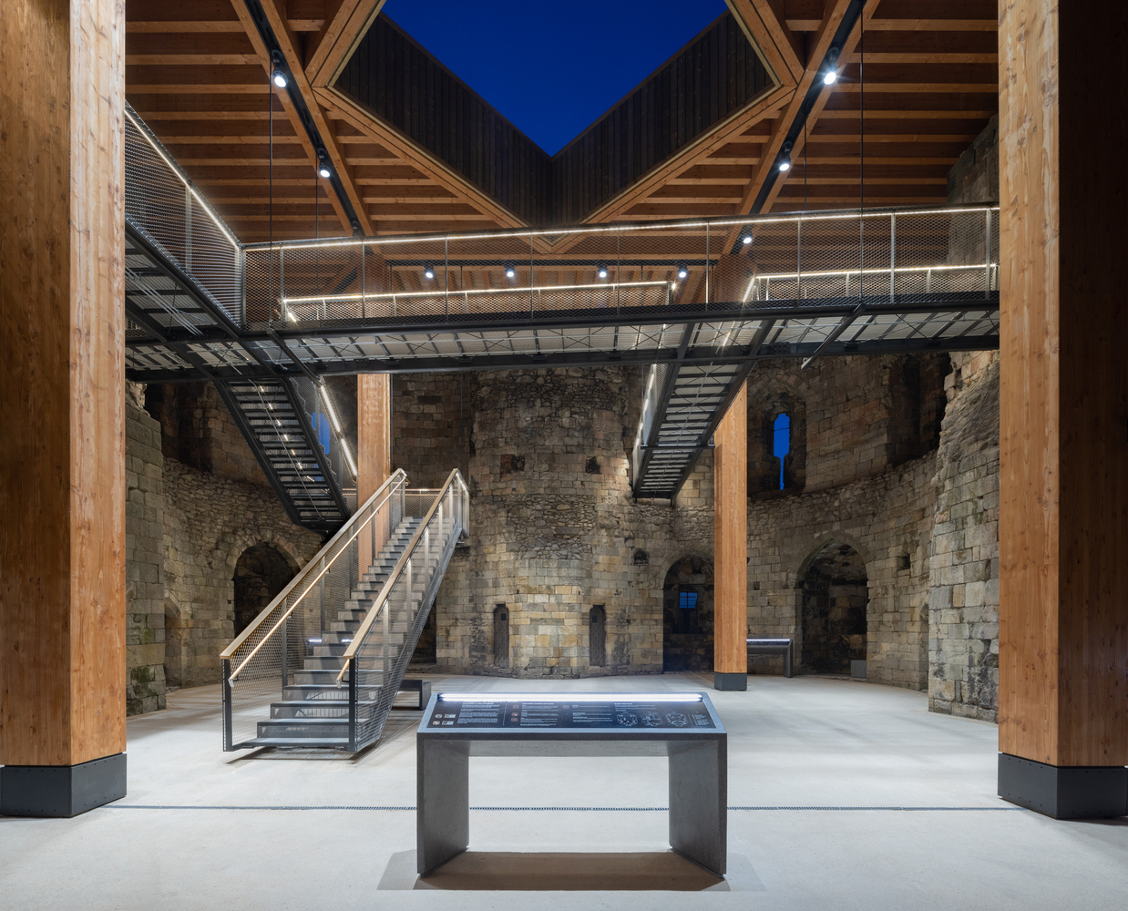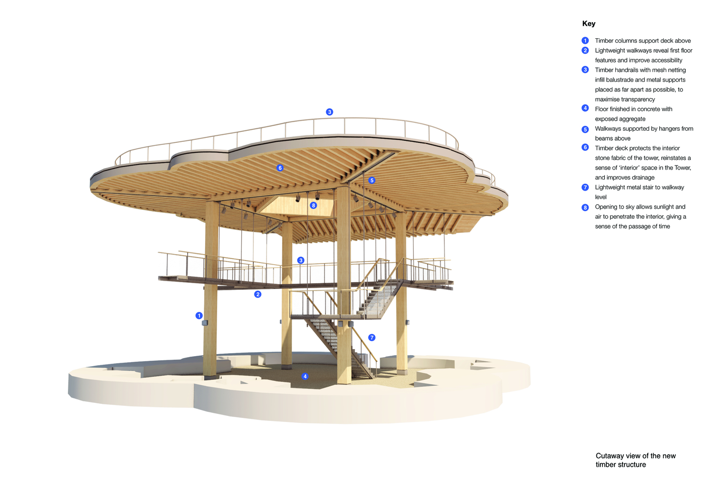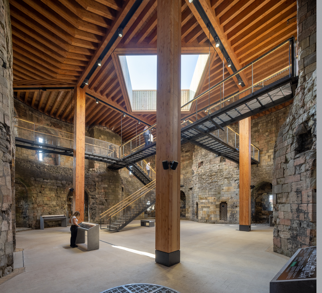 In addition to conservation works to the historic fabric, the project has made a series of improvements to the tower, with a particular focus on creating an inspiring and sensitively designed interpretation scheme within the tower. Developed through an extensive process of public consultation, the design scheme features a new timber deck that partially covers the ruin and is supported on four soaring timber columns.