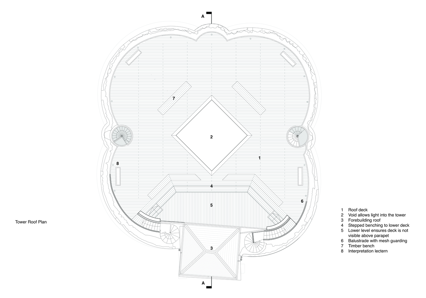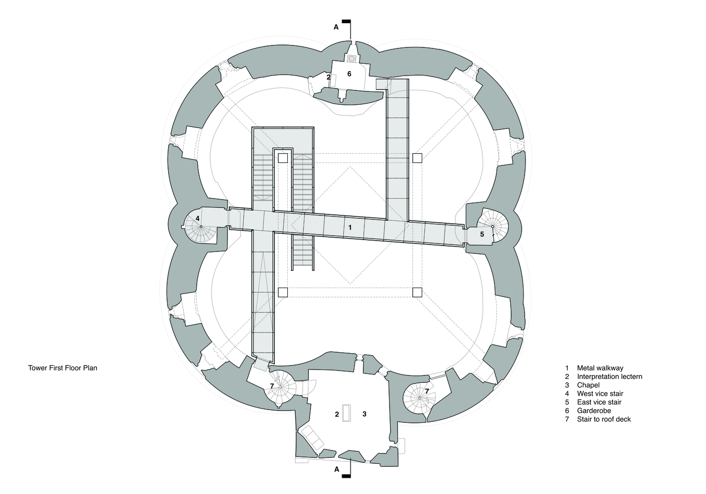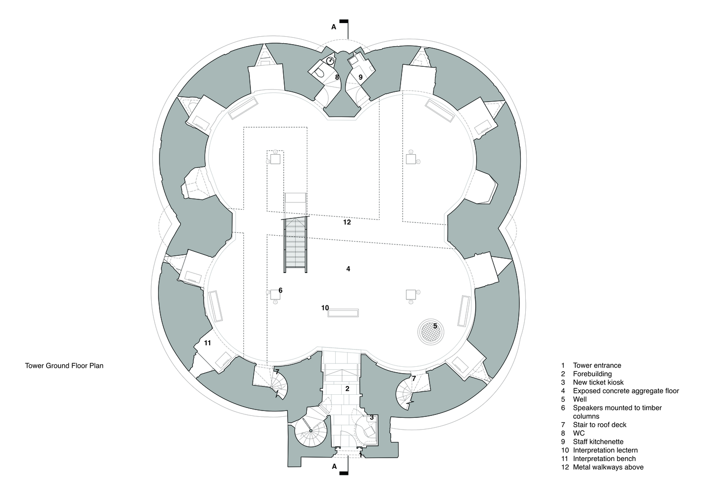 In addition to conservation works to the historic fabric, the project has made a series of improvements to the tower, with a particular focus on creating an inspiring and sensitively designed interpretation scheme within the tower. Developed through an extensive process of public consultation, the design scheme features a new timber deck that partially covers the ruin and is supported on four soaring timber columns.