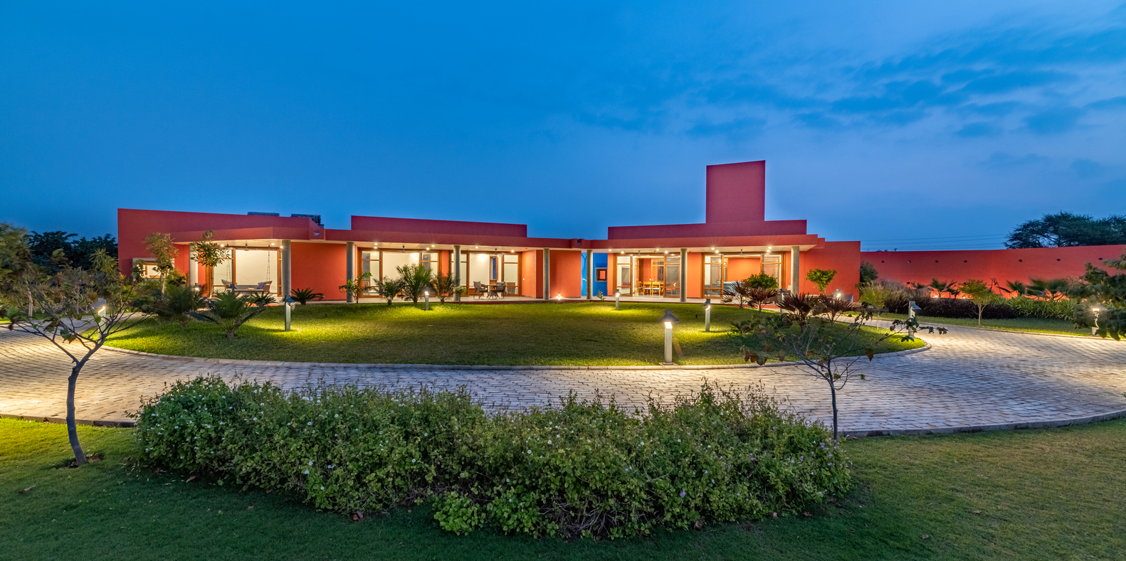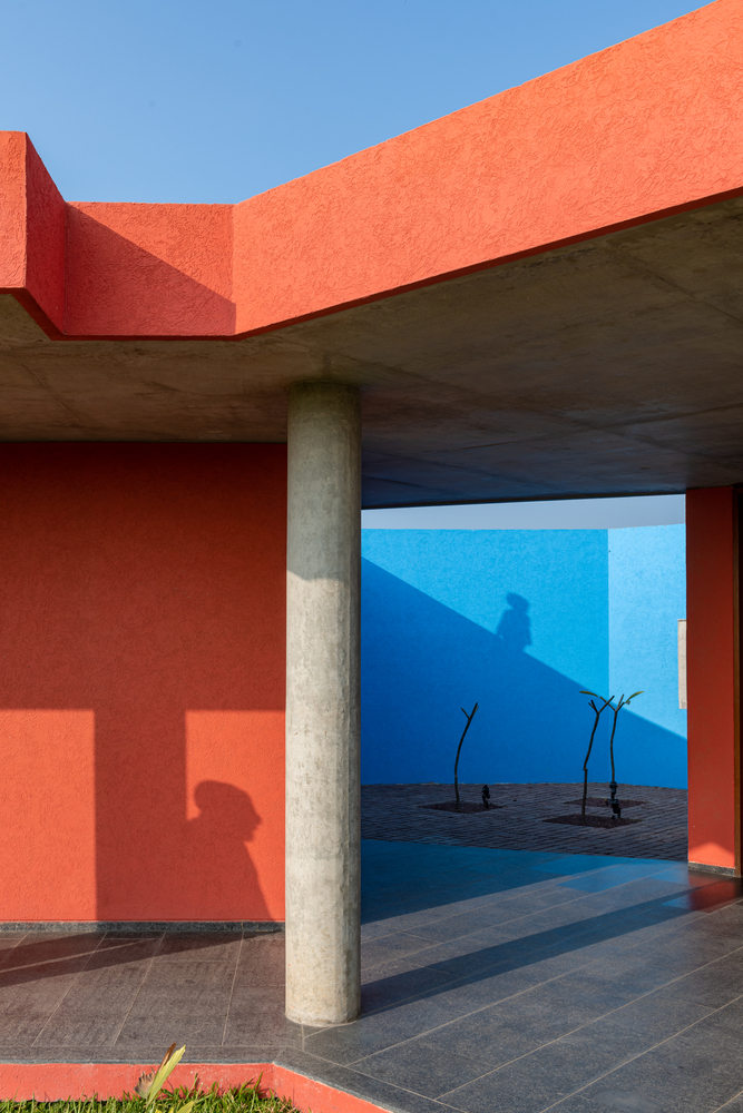 Located on the outskirts of Mehsana, this farmhouse was built for the clients who had just one requirement - a three-bedroom house. Hence the architects were given complete freedom to explore various materials, colors, and building techniques. The house was designed based on the principles of passive design. Maximizing the natural flow of air and daylight was necessary for the hot and dry climate of Gujarat located in western part of India. The transition of open and built spaces highlights the use of colors and the play of light and shadows throughout the house