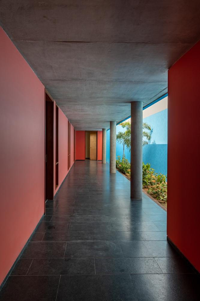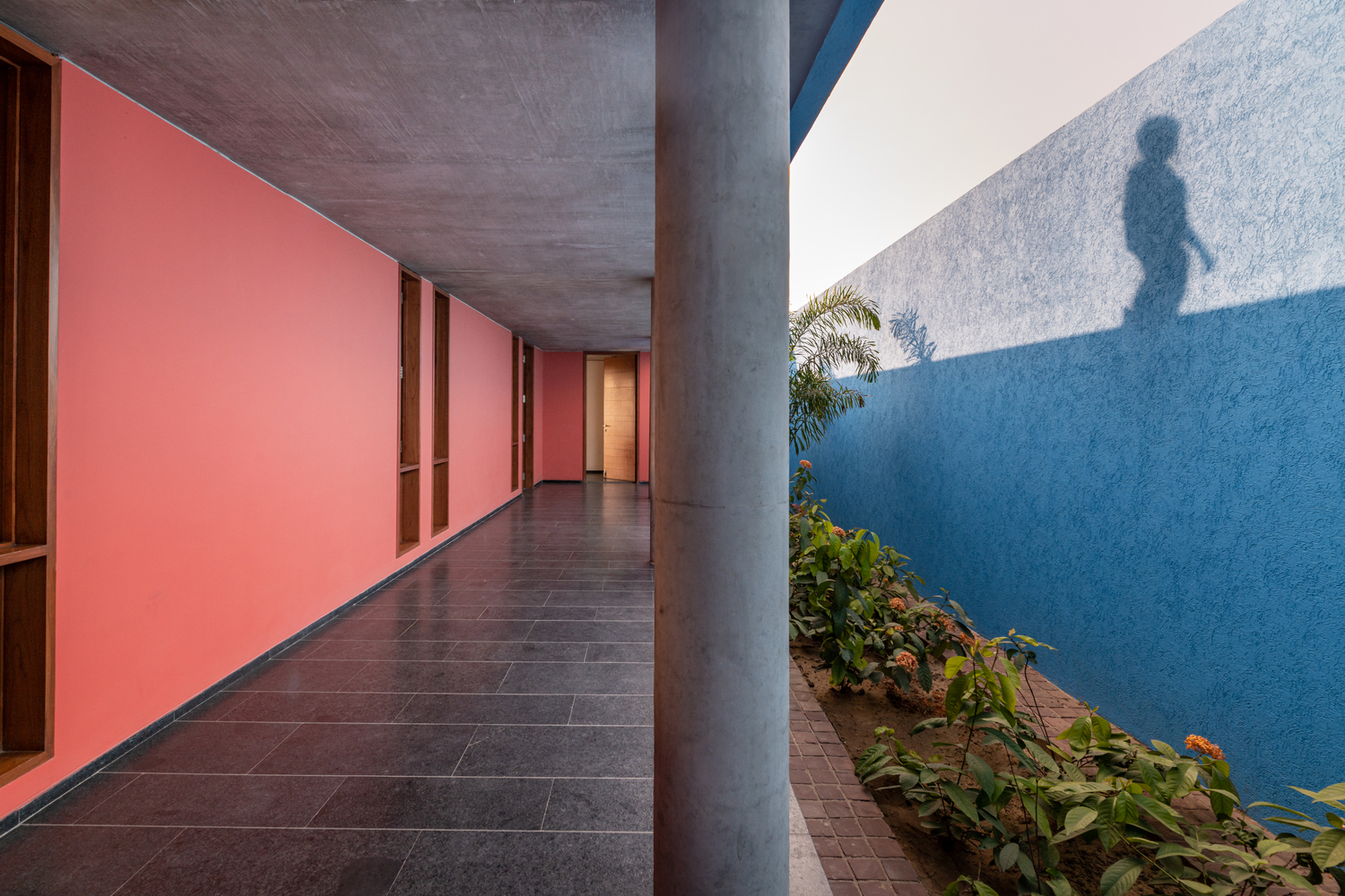 Varied Volumes - As a passive design strategy, the habitable rooms were given a greater height than the circulation spaces and the verandahs. The beams of the verandahs were continued in the rooms, and a non- structural wall was constructed above it that supports the ventilators. The windows allow the summer breeze to come in, whereas these ventilators help flush out the hot air, keeping the space much cooler.