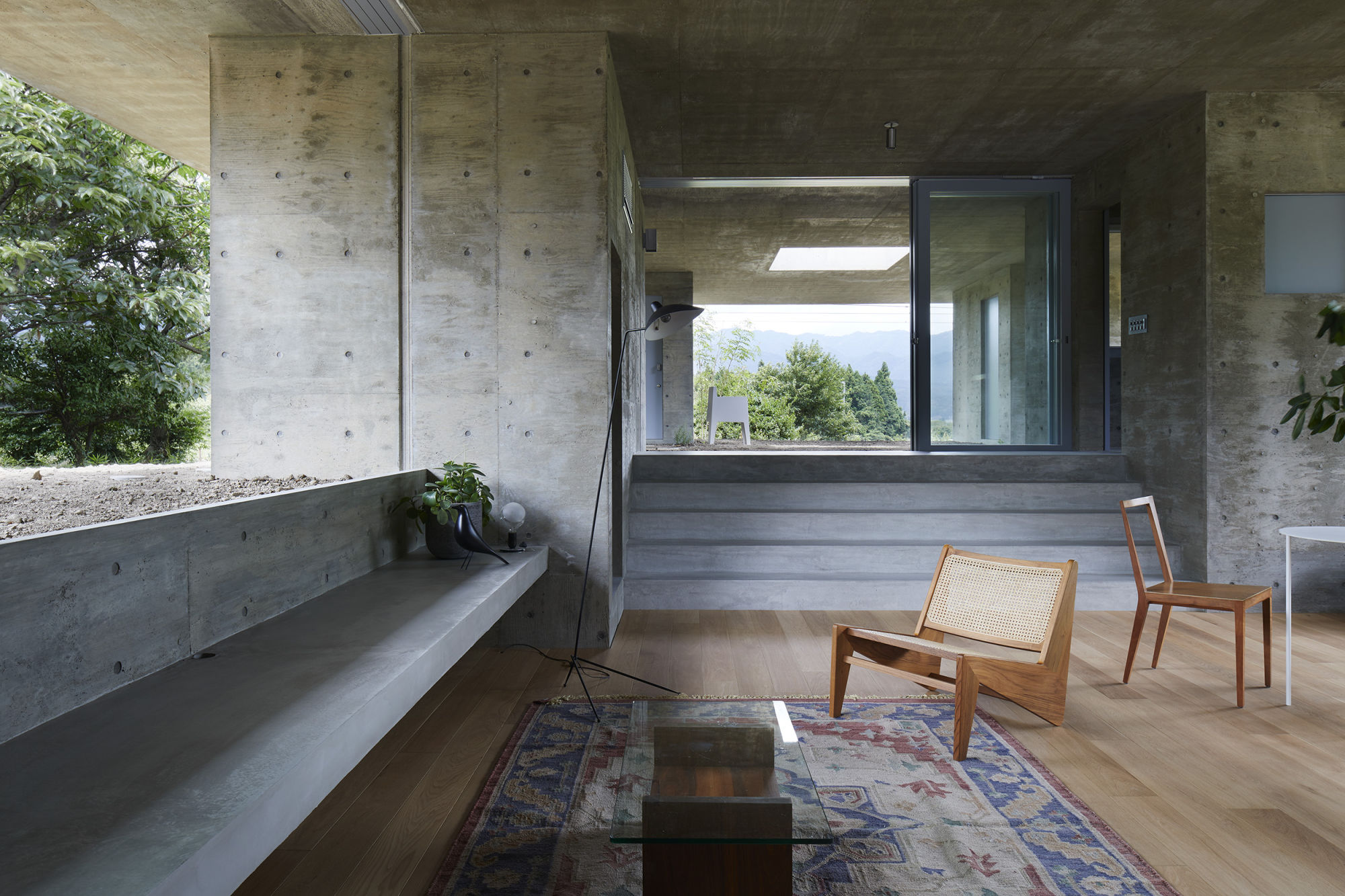 The central living space is a semi underground space. By lowering the floor level from the north and south terraces, the ceiling height is secured, and while the undulating waist wall is a four-way glass-enclosed space, it is intended to block the line of sight from the surroundings and create a relaxing atmosphere. There is also a resting hut with a roof in the center. The structure was a wall-type RC structure, and the cost was cut by simplifying the construction method. As a result, in addition to a one-story space where the outdoors and indoors are smoothly connected and the blessed nature of the surroundings can be fully incorporated into the building, a rich living space with expanded possibilities is created on the roof.
