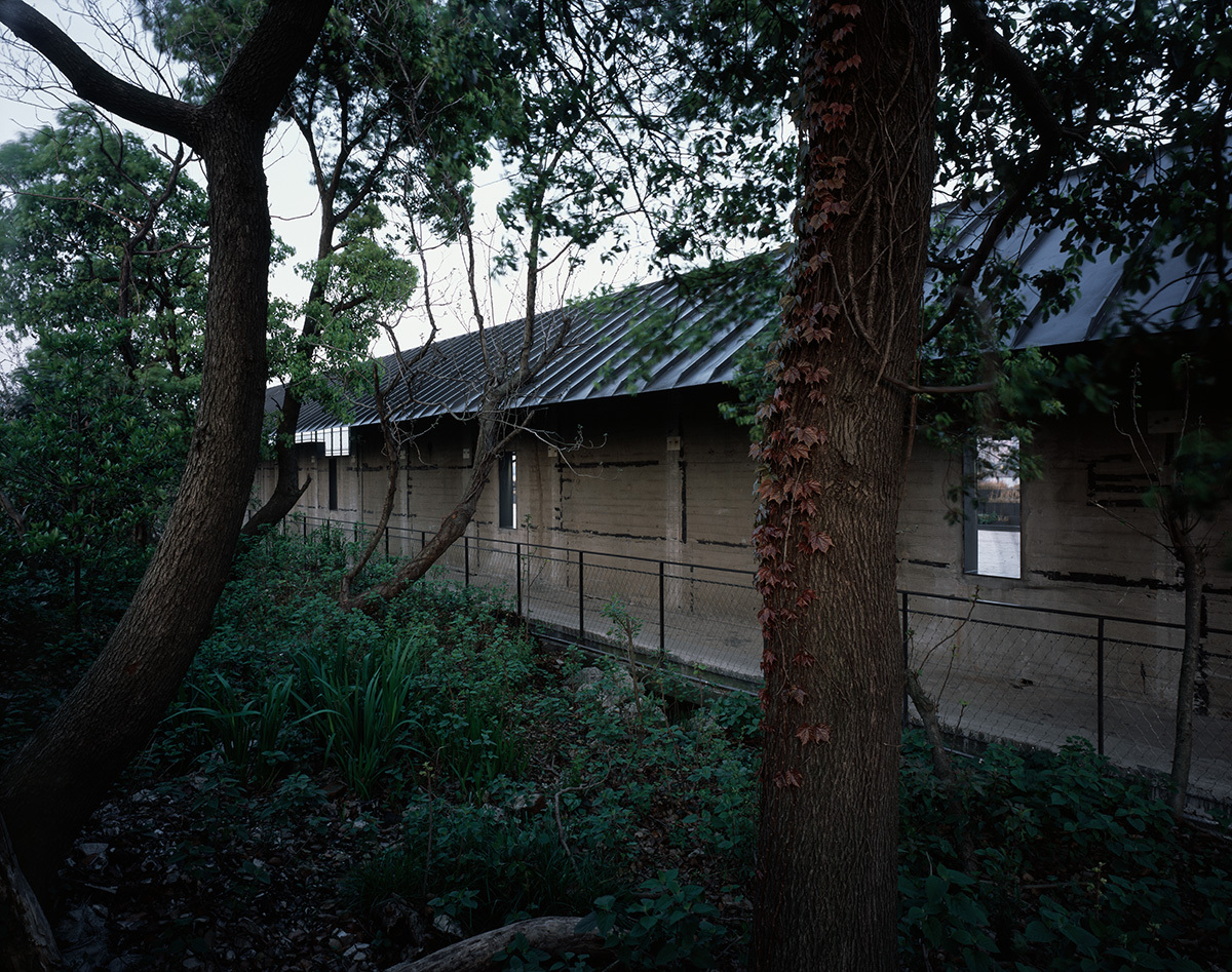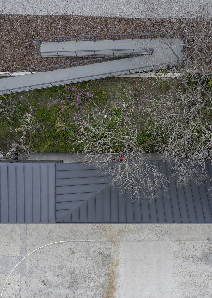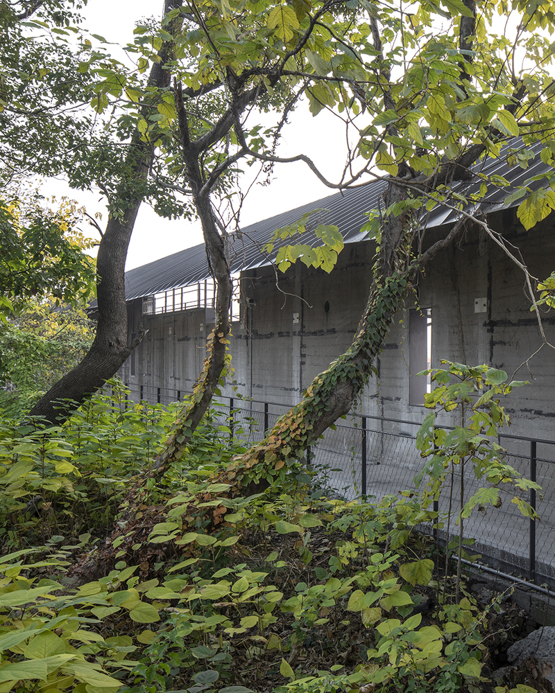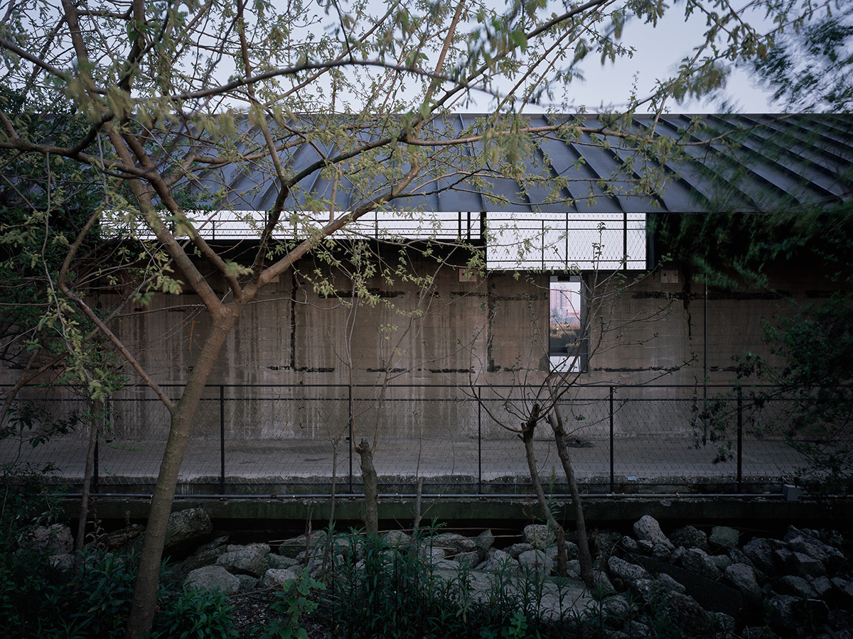 The long concrete wall is adopted as a platform for new construction, on which attaches a sloping bridge connecting the flood control wall and the wharf and then traversing the wild trees, an elevated long open corridor, and a resting pavilion. Faced inside the wall is a garden of solitude in between the gap between the wharf and the shore. The waterfront industrial ruins in the gap turned into an aesthetic object in the contemporary metropolitan culture. The wild vegetation in the ruins also preserved the coexisting microorganism, thus this project is also significant in biological and sustainable concerns. The wharf devoid of coal unloading is now polished into a roller rink. This could also be regarded as another kind of sustainability.