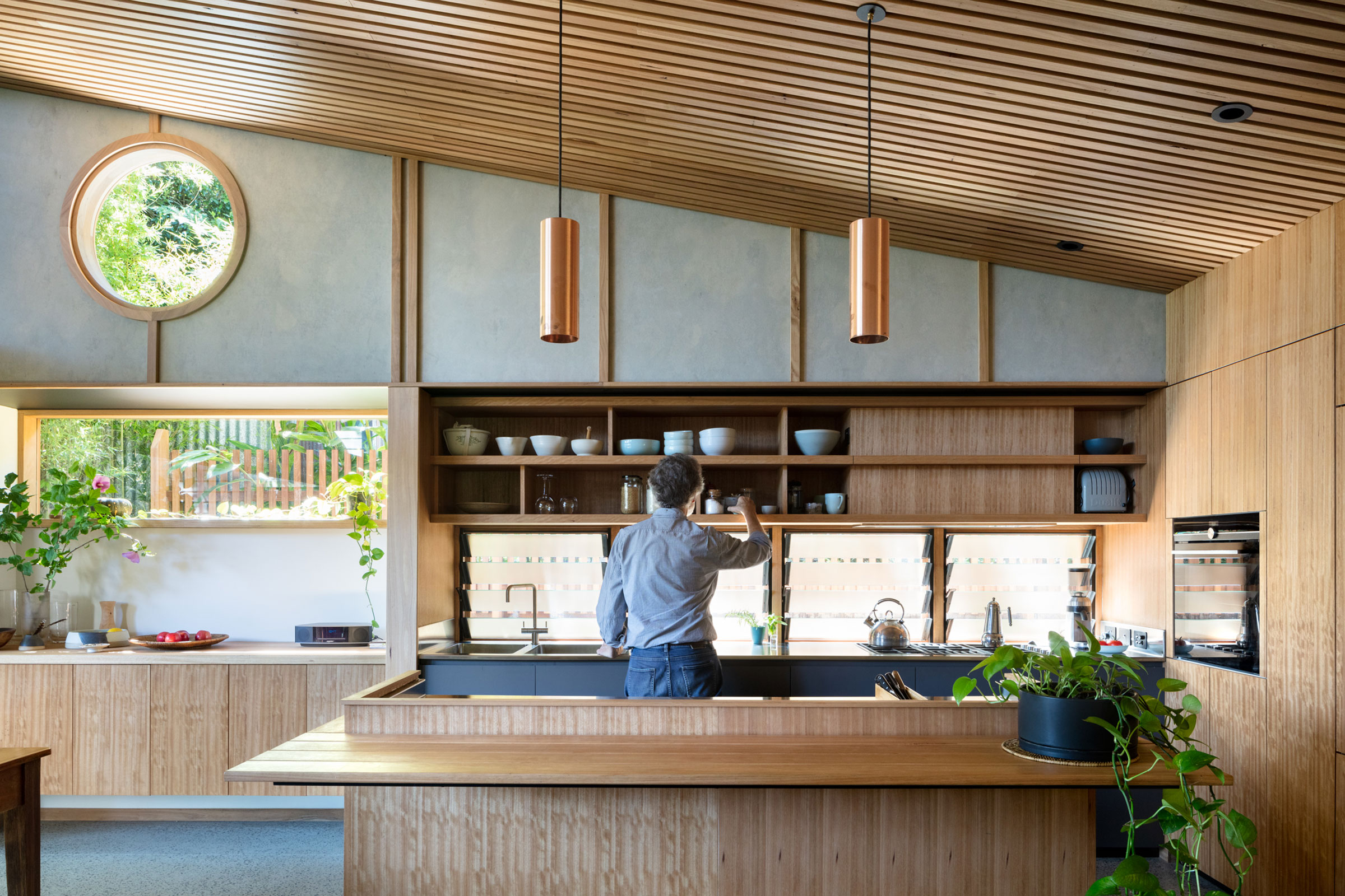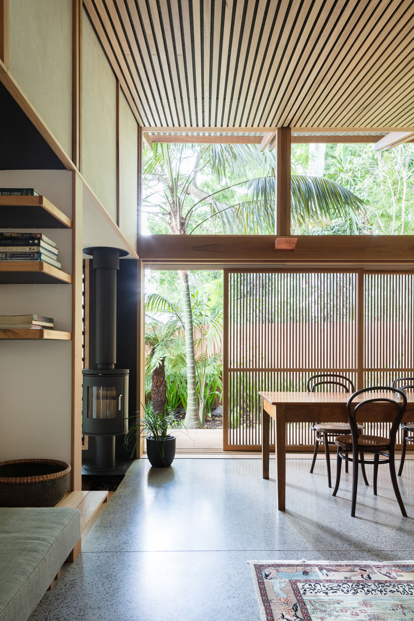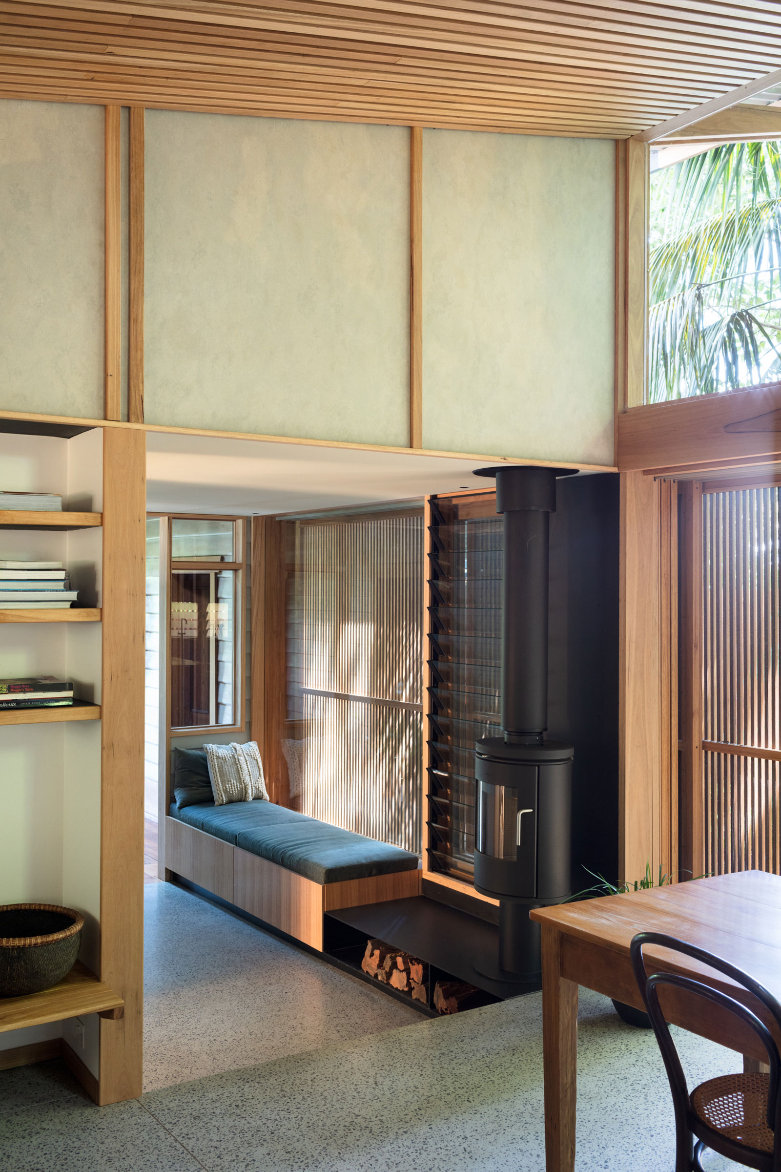 To control privacy and screening, timber and mesh frames surround the new form and open and close as needed. The screens also offer an element of animation as light filters through into the interiors throughout the day, bringing shadows and dappled light in the process. A combination of timber is used throughout, featuring Blackbutt on the exterior and mixed timbers used internally. Whilst underfloor heating and other systems enhance the everyday functionality of the home, at the heart of the new works is an embedded warmth echoed through the materials used.