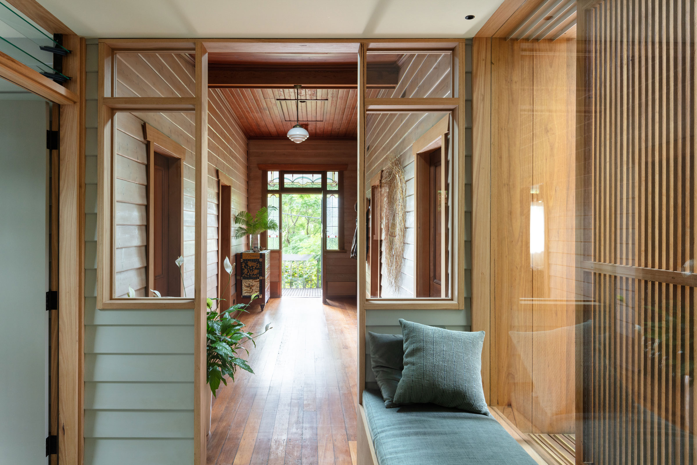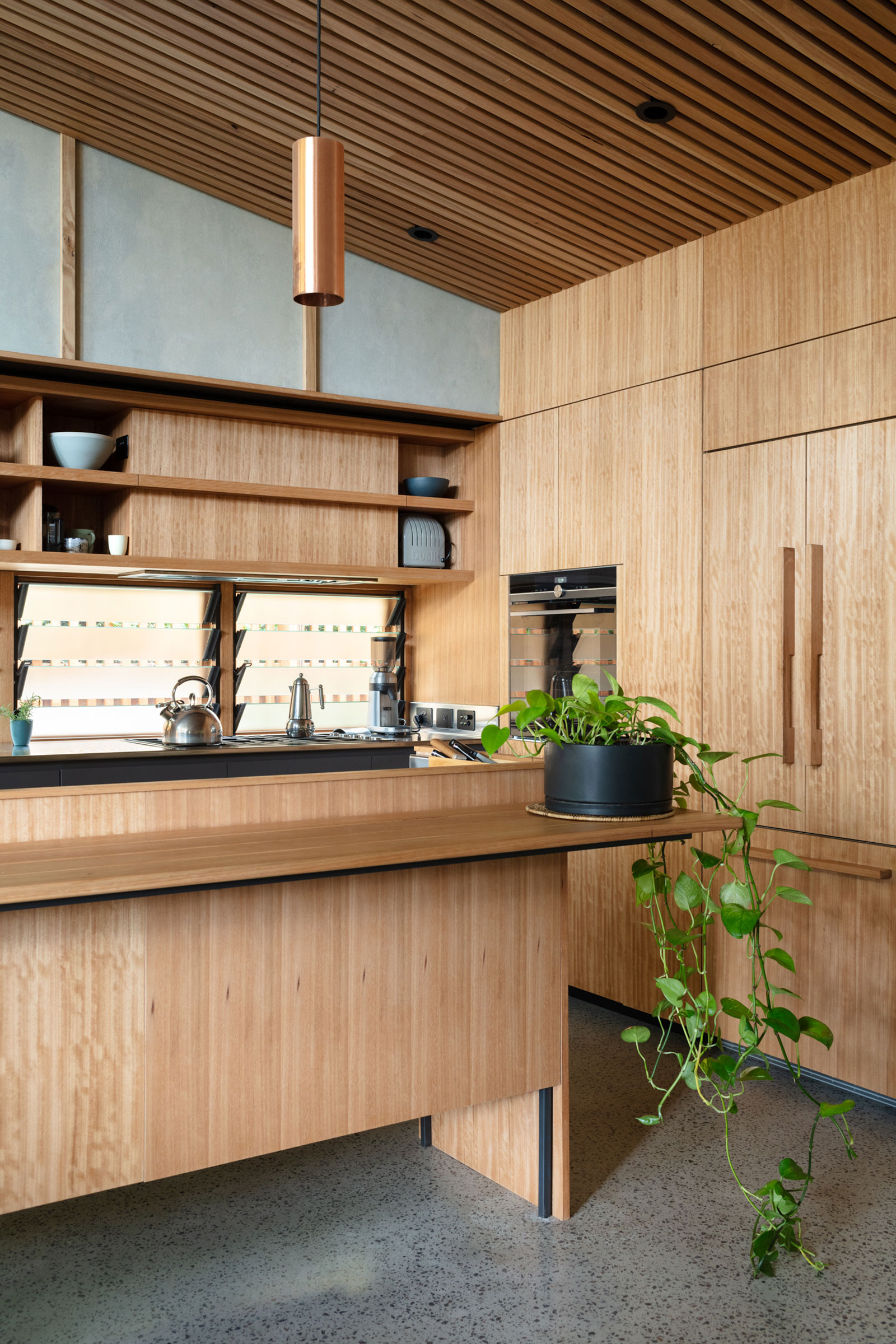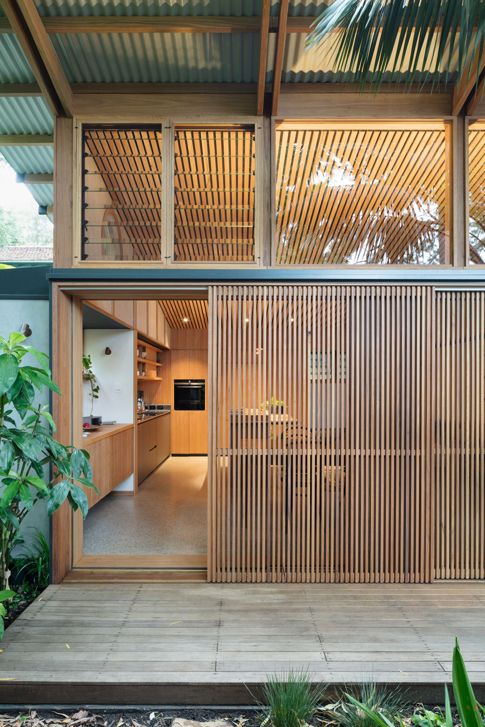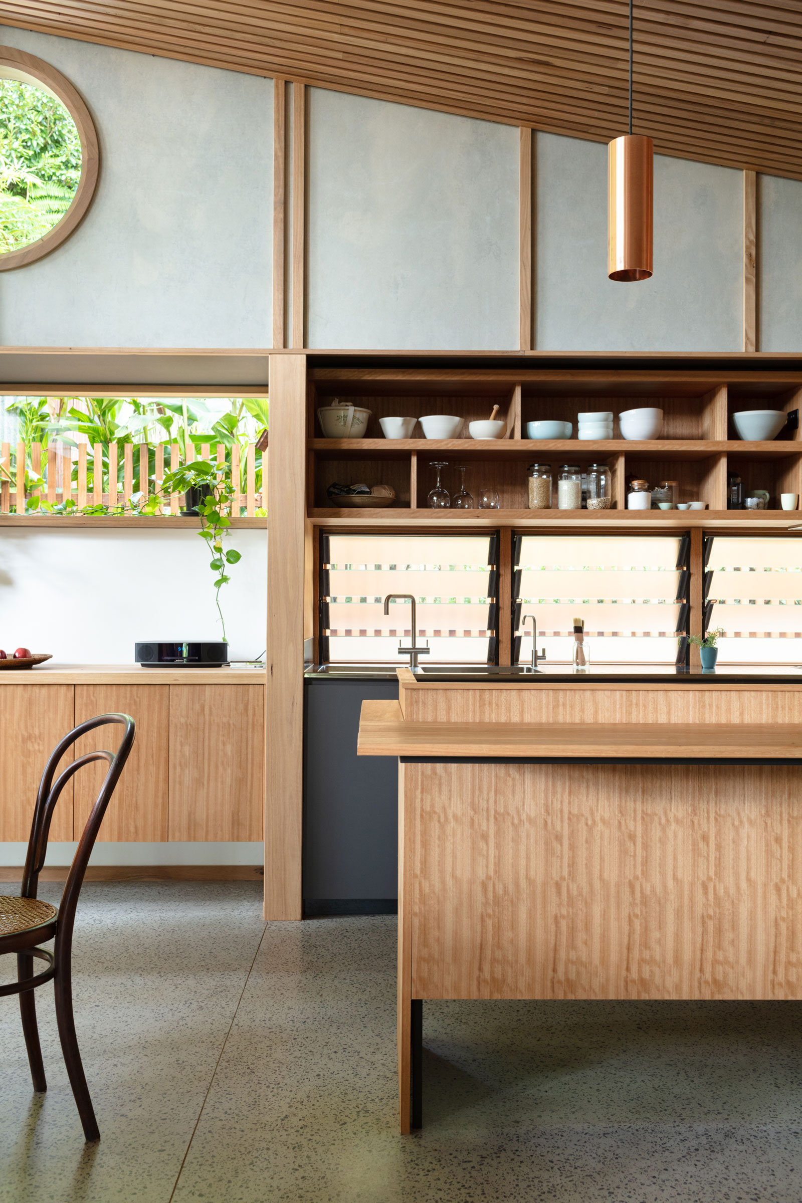 To control privacy and screening, timber and mesh frames surround the new form and open and close as needed. The screens also offer an element of animation as light filters through into the interiors throughout the day, bringing shadows and dappled light in the process. A combination of timber is used throughout, featuring Blackbutt on the exterior and mixed timbers used internally. Whilst underfloor heating and other systems enhance the everyday functionality of the home, at the heart of the new works is an embedded warmth echoed through the materials used.
